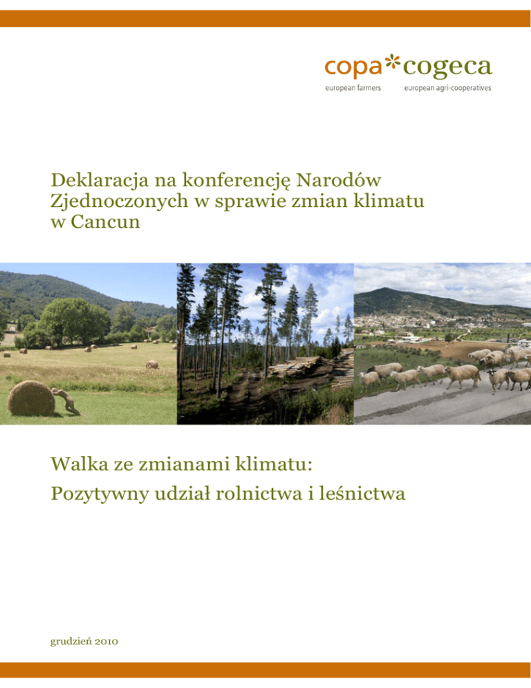 Deklaracja na konferencję Narodów Zjednoczonych w sprawie zmian klimatu w Cancun Walka ze zmianami klimatu: Pozytywny udział rolnictwa i leśnictwa grudzień 2010 Walka ze zmianami klimatu: Pozytywny udział rolnictwa i leśnictwa Kluczowe wiadomości na konferencję w Cancun Zgodnie z rozdziałem IX tekstu negocjacji w sprawie działań rozważanych w perspektywie długoterminowej, spółdzielcze strategie sektorowe oraz specyficzne działania dla poszczególnych sektorów rolnych, mogą przyczynić się do uznania strategicznego charakteru tego sektora i doprowadzić do wzmocnienia relacji pomiędzy rolnictwem a bezpieczeństwem żywności oraz do wzmocnienia związku pomiędzy łagodzeniem zmian klimatu a przystosowywaniem się do nich. Szczególna rola produkcji oraz bezpieczeństwa żywności powinna być jasno wskazana w tekście na temat działania w perspektywie długoterminowej, który powinien być przyjęty w ramach COP16. Międzynarodowy program pracy w zakresie rolnictwa, przygotowany pod egidą Organu Doradztwa Naukowego, Technicznego i Technologicznego Narodów Zjednoczonych (ABSTTA), byłby bardzo użyteczny, aby promować badania, rozwój, stosowanie oraz rozpowszechnianie technologii, praktyki i procesy, których celem jest redukcja emisji gazów cieplarnianych pochodzących z rolnictwa oraz współpraca w tych dziedzinach. Możliwe jest osiągnięcie realnej redukcji gazów cieplarnianych, przy jednoczesnej optymalizacji potencjału produkcji europejskiego rolnictwa i leśnictwa dzięki większej produktywności i skuteczności. Trwała gospodarka leśna powinna być wzięta pod uwagę w politykach zajmujących się łagodzeniem zmian klimatu. Przyszłe międzynarodowe reguły wliczania powinny być zrewidowane, aby nie zagrozić równowadze pomiędzy nowymi zachętami do sekwestracji dwutlenku węgla a mobilizacją produktów drzewnych i biomasy przeznaczonej do produkcji odnawialnej energii oraz materiałami przeznaczonymi na budownictwo i przemysł. Jest to również istotne dla rolnictwa. Wysiłki rolników powinny być wspierane przez solidne i sprawiedliwe polityki na poziomie UE oraz na poziomie międzynarodowym. Wdrażanie polityki w zakresie zmian klimatu nie powinno zagrażać witalności ekonomicznej oraz konkurencyjności działań rolnictwa i leśnictwa. W związku z konferencją Narodów Zjednoczonych w sprawie zmian klimatu w Cancun, planowaną na grudzień 2010, Komitety Copa-Cogeca, reprezentujące europejskich rolników, leśników i spółdzielnie rolne, uważają, że 16. Konferencja Stron (COP16) musi być kontynuacją drogi określonej w porozumieniu z Kopenhagi z 2009 roku. Światowe wyzwania Rolnictwo i leśnictwo mają znaczenie strategiczne i ekonomiczne na poziomie światowym oraz odgrywają główną rolę w walce z obecnymi i przyszłymi wyzwaniami. Rosnący popyt na żywność oraz odnawialne materiały i energię, w połączeniu ze zmianami klimatu i rosnącymi wahaniami na rynku oznacza, że bezpieczeństwo żywnościowe nie może już być uznawane za oczywistość. Będzie ono priorytetem polityki rządów na całym świecie. Ponadto, ubywa ziemi w rolnictwie w wyniku rosnącej presji na wykorzystanie gruntów w celu zaspokojenia potrzeb urbanistycznych i transportowych. Zmiany klimatu, wraz z bezpieczeństwem żywnościowym i energetycznym powinny być postrzegane jako zbieżne elementy zrównoważonej produkcji rolnej i leśnej. Wpływ zmian klimatu na światową produkcję żywności musi być brany pod uwagę przy opracowywaniu unijnej i międzynarodowej polityki w sprawie zmian klimatu. Dodatkowe wymogi i działania związane z walką ze zmianami klimatu potrzebują silnej i funkcjonalnej społeczności rolników na terenach wiejskich. Rolnicy i leśnicy w dużym stopniu przyczynili się do redukcji wpływu swojej działalności na klimat, gdyż emisje gazów cieplarnianych przez rolnictwo spadły o 20 procent w latach 1990-2006 (UE-27). Ponadto, europejskie lasy kumulują 0,5 Gt CO2/rok, to znaczy 10% całkowitych rocznych emisji gazów cieplarnianych z europejskiego przemysłu. Do pewnego stopnia, zobowiązania te były wspierane przez zaangażowanie rolników, przez reformy WPR oraz harmonijne wprowadzenie europejskich przepisów środowiskowych. Ponadto, rolnictwo i leśnictwo mają duży udział w cyklu węglowym i mogą, dzięki mobilizacji produktów drzewnych oraz biomasy, reprezentować duży potencjał redukcji emisji CO2 pochodzących z paliw kopalnych oraz nieodnawialnych materiałów przeznaczonych na budownictwo i przemysł. Pierwszy etap, walka ze skutkami zmian klimatu Rolnictwo i leśnictwo jako pierwsze odczuwają wszystkie skutki zmian klimatu. Nawet jeśli rolnicy i leśnicy przywykli do dostosowywania swoich praktyk do stopniowych zmian, to amplituda i skutki zdarzeń klimatycznych (wczesne lub późne przymrozki, wzrastająca zmienność sezonowości, sezonowe i roczne opady deszczu, powodzie, susze, szerzenie się gatunków inwazyjnych itd.) będą miały większy wpływ na ich działalność, niż w jakimkolwiek innym sektorze gospodarki i podważą ich możliwości w zakresie dostosowywania się do zmian klimatu. Emisje z rolnictwa posiadają unikalny profil w porównaniu z emisjami z pozostałych sektorów. Profil rolnictwa w zakresie emisji gazów cieplarnianych różni się znacznie od profilu pozostałych sektorów, takich jak przemysł, gospodarstwa domowe i transport, zważywszy na fakt, że dominują w nim gazy inne niż CO2, pochodzące z procesów naturalnych i biologicznych: metan (fermentacja energetyczna przeżuwaczy) i podtlenek azotu (stosowanie organicznych i nieorganicznych nawozów w glebie). Dlatego też, biologiczny charakter emisji pochodzących z rolnictwa, szczególnie zmiennych, nie powinien być ignorowany w doborze odpowiednich opcji łagodzenia. Ponadto, nie można karać rolników za emisje wynikające z naturalnych procesów, które nie są związane z procesami zarządzania,