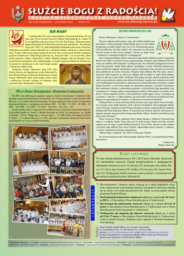 SŁUŻCIE BOGU Z RADOŚCIĄ! G A Z E T K A L I T U R G I C Z N E J Nr 3 (29) WRZESIEŃ – LISTOPAD 2012 rOK VIII SŁOWO BISKUPA DO LSO ROK WIARY 11 października 2012 roku rozpoczęliśmy w Kościele Rok Wiary. W tym roku mija 50 lat od chwili otwarcia Soboru Watykańskiego II, a także 20 lat od opublikowania Katechizmu Kościoła Katolickiego. Ogłoszony przez papieża Benedykta XVI Rok Wiary przeżywamy pod hasłem: „Wy jesteście solą ziemi” (Mt 5,13). Sobór Watykański II dokonał wiele zmian w Kościele. Najbardziej zauważalna zmiana dokonała się w dziedzinie liturgii, zwłaszcza w sprawowaniu Mszy Świętej. Odnowiono księgi liturgiczne, powstał nowy mszał, język łaciński zastąpiono językami narodowymi. Odtąd liturgię sprawuje się „twarzą do ludu”, a co za tym idzie, ołtarz został ustawiony między celebransem a ludem. Bardziej dostępna stała się Komunia Święta pod dwiema postaciami, jako zasadę przyjęto, że księża mogą koncelebrować Eucharystię. Uczyniono to wszystko po to, aby wierni mogli czerpać z Eucharystii obfitsze łaski. Zachęcamy Księży Opiekunów grup LSO, Was, Drodzy lektorzy, do sięgnięcia po ważny dokument Soboru Watykańskiego II, jakim jest Konstytucja o liturgii świętej. Ministranci także niech pytają swoich księży o podstawowe kwestie związane ze zmianami, jakie przyniósł Sobór Watykański w liturgii. Drodzy Ministranci, Lektorzy i Ceremoniarze! Wszyscy zdajemy sobie sprawę z tego, jak wielkim skarbem jest prawdziwy i wierny przyjaciel. Pismo Święte mówi, że „kto znalazł przyjaciela, ten skarb znalazł” (por. Syr 6,14). Prawdziwego przyjaciela chcielibyśmy nie tylko znaleźć, ale i zatrzymać na całe życie, bowiem można na nim zawsze polegać i zawsze na niego liczyć – zwłaszcza w sytuacjach trudnych i wymagających. Jako Liturgiczna Służba Ołtarza stanowicie krąg bardzo bliskich Jezusowi przyjaciół, którym On zaufał i na których zawsze pragnie polegać. Zaufanie, jakim obdarzył Was Pan Jezus, jest wielkim zobowiązaniem i zachętą do tego, aby codziennie pielęgnować ten bezcenny dar przyjaźni. Stojąc blisko ołtarza i posługując w czasie celebracji liturgicznych, macie możliwość ciągłego zacieśniania więzów tej przyjaźni oraz stawania się coraz bardziej podobnymi do Jezusa Chrystusa. Przyjaźń, którą obdarza Was Pan Jezus, stanowi bezcenny skarb, bogactwo na całe życie, którego nikt nie będzie w stanie Wam odebrać, chyba że sami na to pozwolicie. Zachęcam Was gorąco do tego, abyście naprawdę cenili sobie waszą służbę przy ołtarzu oraz abyście byli dumni i autentycznie wdzięczni za możliwość tak bliskiego uczestniczenia w najświętszych czynnościach sprawowanych w ramach liturgii Kościoła i za tak liczne okazje do umacniania przyjaźni z Jezusem Chrystusem. Jako ministranci, lektorzy i ceremoniarze jesteście w rzeczywistości Jego apostołami. Gdy uczestniczycie w liturgii, pełniąc swoją służbę przy ołtarzu, ofiarowujecie wszystkim świadectwo. Wasza skupiona postawa, wasza pobożność wypływająca z serca i wyrażająca się w gestach, w śpiewie i w odpowiedziach, jest niezwykle wymownym świadectwem działającym na zgromadzonych wiernych, a zwłaszcza na waszych rówieśników. Dziękuję Wam za waszą codzienną służbę Jezusowi przy Jego ołtarzu oraz za świadectwo waszego życia, dzięki któremu wielu waszych rówieśników może zapragnąć zbliżyć się do Chrystusa. Dziękuję również Waszym Rodzicom, którzy wspierają Wasze codzienne posługiwanie Panu Bogu przy ołtarzu. W naszej diecezji możemy radować się licznymi zastępami starannie przygotowanej Liturgicznej Służby Ołtarza. Jesteście prawdziwą armią sług Jezusa Chrystusa! Niech towarzyszy Wam codziennie Boża radość płynąca z bliskości Chrystusowego ołtarza i z wielkości służby Temu, który jest nie tylko naszym Panem, ale który również zaprasza nas do kręgu swoich bliskich przyjaciół. Życzę Wam, abyście na dar zaufania i przyjaźni, jaką obdarzył Was Jezus Chrystus, odpowiadali zawsze ochoczo i z radością, z sercami wypełnionymi Bożym entuzjazmem. „Służcie Bogu z radością!” (Ps 100,2). Króluj nam, Chryste! 10 lat Szkoły Ceremoniarza i Animatora Liturgicznego Od 2003 roku odbywają się regularne zajęcia w Szkole Ceremoniarza i Animatora Liturgicznego zwane potocznie kursem ceremoniarzy. Po 10 latach przeszło w niej szkolenie 1093 lektorów z 231 parafii diecezji tarnowskiej. W poszczególnych latach krzyże ceremoniarza otrzymywali lektorzy w następujących liczbach: 2003 – 52; 2004 – 73; 2005 – 65; 2006 – 81; 2007 – 126; 2008 – 123; 2009 – 111; 2010 – 158; 2011 – 145; 2012 – 159. Są takie parafie, które w ciągu tych lat wysłały na kurs ceremoniarza dużą liczbę lektorów. Na przykład parafia św. Pawła w Bochni doczekała się liczby 26 ceremoniarzy, św. Jakuba w Brzesku – 20; św. Małgorzaty w Nowym Sączu – 16; Matki Bożej Nieustającej Pomocy w Mielcu – 15. Ciekawostką jest, że w 2011 roku kurs ceremoniarza ukończyło trzech dorosłych lektorów ze Lwowa z parafii katedralnej. 2004 Na owocne kontynuowanie Waszej posługi udzielam Wam z serca pasterskiego błogosławieństwa. † Andrzej Jeż Biskup Tarnowski 2005 2006 S Ł U Ż B Y O Ł T A R Z A www.lso.diecezja.tarnow.pl Kursy lektorskie 2007 W roku szkolno-katechetycznym 2011-2012 kursy lektorskie ukończyło 411 ministrantów starszych. Zostały przeprowadzone w następujących dekanatach: Bochnia-Zachód (72), Brzesko (47), Krościenko (66), Mielec-Północ (51), Nowy Sącz-Centrum (70), Radłów (29), Szczucin (29), Tarnów-Południe (47). Dziękujemy bardzo księżom, nauczycielom i ceremoniarzom za trud prowadzenia kursów lektorskich. 2009 2008 2011 2012 nych, organizowane są dni formacji misyjnej. Szczegółowe informacje znajdują się na stronie www.misje.diecezja.tarnow.pl. Zapisy na poszczegól