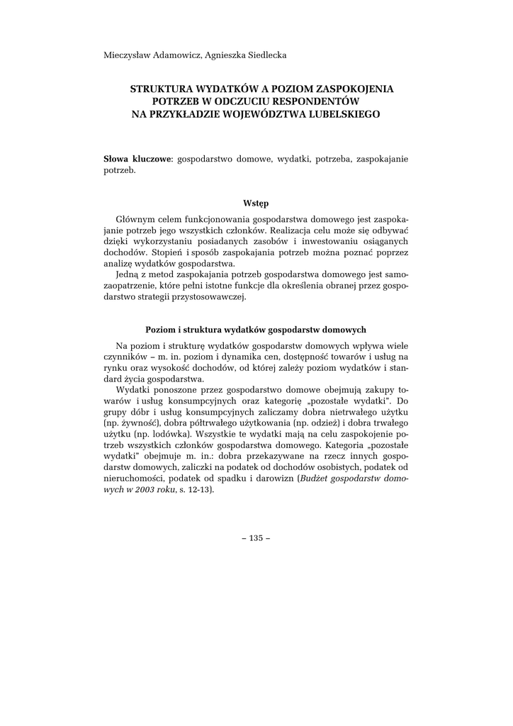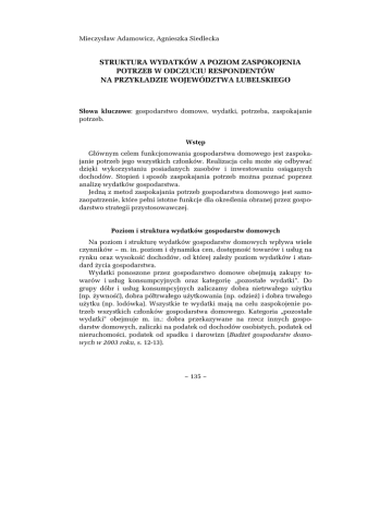 Mieczysğaw Adamowicz, Agnieszka Siedlecka STRUKTURA WYDATKÓW A POZIOM ZASPOKOJENIA POTRZEB W ODCZUCIU RESPONDENTÓW NA PRZYKĞADZIE WOJEWÓDZTWA LUBELSKIEGO Sğowa kluczowe: gospodarstwo domowe, wydatki, potrzeba, zaspokajanie potrzeb. WstĎp Gğównym celem funkcjonowania gospodarstwa domowego jest zaspokajanie potrzeb jego wszystkich czğonków. Realizacja celu moŃe siĎ odbywaĄ dziĎki wykorzystaniu posiadanych zasobów i inwestowaniu osiĂganych dochodów. Stopieġ i sposób zaspokajania potrzeb moŃna poznaĄ poprzez analizĎ wydatków gospodarstwa. JednĂ z metod zaspokajania potrzeb gospodarstwa domowego jest samozaopatrzenie, które peğni istotne funkcje dla okreılenia obranej przez gospodarstwo strategii przystosowawczej. Poziom i struktura wydatków gospodarstw domowych Na poziom i strukturĎ wydatków gospodarstw domowych wpğywa wiele czynników – m. in. poziom i dynamika cen, dostĎpnoıĄ towarów i usğug na rynku oraz wysokoıĄ dochodów, od której zaleŃy poziom wydatków i standard Ńycia gospodarstwa. Wydatki ponoszone przez gospodarstwo domowe obejmujĂ zakupy towarów i usğug konsumpcyjnych oraz kategoriĎ „pozostağe wydatki”. Do grupy dóbr i usğug konsumpcyjnych zaliczamy dobra nietrwağego uŃytku (np. ŃywnoıĄ), dobra póğtrwağego uŃytkowania (np. odzieŃ) i dobra trwağego uŃytku (np. lodówka). Wszystkie te wydatki majĂ na celu zaspokojenie potrzeb wszystkich czğonków gospodarstwa domowego. Kategoria „pozostağe wydatki” obejmuje m. in.: dobra przekazywane na rzecz innych gospodarstw domowych, zaliczki na podatek od dochodów osobistych, podatek od nieruchomoıci, podatek od spadku i darowizn (BudŃet gospodarstw domowych w 2003 roku, s. 12-13). – 135 – Poziom wydatków w badanej populacji Zastosowanie takich narzĎdzi statystycznych, jak miary tendencji centralnych, pozwoliğo na stwierdzenie, Ńe ırednie miesiĎczne wydatki ponoszone w gospodarstwach domowych woj. lubelskim ksztağtowağy siĎ na poziomie 1255 zğ, przy odchyleniu standardowym 174 zğ. WartoıciĂ dominujĂcĂ, dzielĂcĂ zbiorowoıĄ na dwie równe czĎıci, byğa kwota 1000 zğ. Oznacza to, Ńe poğowa gospodarstw domowych wydaje ırednio do 1000 zğ miesiĎcznie, a druga poğowa – powyŃej 1000zğ. WaŃna jest takŃe informacja, Ńe w 25% gospodarstw wydatki ksztağtowağy siĎ na poziomie powyŃej 1500 zğ miesiĎcznie. AnalizujĂc powyŃsze dane naleŃy pamiĎtaĄ, Ńe w grupie gospodarstw prawie 1/3 ankietowanych nie udzieliğa odpowiedzi na pytanie dotyczĂce okreılenia kwoty pieniĎŃnej. MoŃna przypuszczaĄ, Ńe przyczynĂ tego zjawiska byğ fakt, Ńe wydatki w tych gospodarstwach znacznie przewyŃszajĂ deklarowane, a ırodki finansowe pochodzĂ z szarej strefy. Rozkğady wydatków w badanej grupie gospodarstw wskazuje, iŃ okoğo 43% gospodarstw wydaje miesiĎcznie w granicach 500–1000 zğ, a ponad 1/3 – w granicach 1000–2000 zğ miesiĎcznie (Ryc. 1). Ryc. 1. Struktura ırednich miesiĎcznych wydatków ponoszonych w badanej grupie (w %). L u b e ls k ie 4 5 ,0 0 4 0 ,0 0 L u b e ls kie 3 5 ,0 0 3 0 ,0 0 2 5 ,0 0 2 0 ,0 0 1 5 ,0 0 1 0 ,0 0 5 ,0 0 0 ,0 0 p o n iĪ e j 5 0 0 zá 5 0 0 -1 0 0 0 z á 1 0 0 0 -2 0 0 0 z á 2 0 0 0 -5 0 0 0 z á p o w y Īe j 5 0 0 0 z á ħródáo: Opracowanie wáasne na podstawie wyników badaĔ Czynnikiem istotnie wpğywajĂcym na poziom wydatków jest poziom wyksztağcenia gğowy gospodarstwa. Zastosowanie miernika statystycznego pozwala stwierdziĄ, Ńe istniejĂ róŃnice w poziomie wyksztağcenia w poszczególnych grupach wydatków (chi-kwadrat – 44,666, poziom istotnoıci – 0,000). ZmiennĂ warunkujĂcĂ wielkoıĄ wydatków w gospodarstwie domowym jest liczba osób wchodzĂcych w jego skğad (chi-kwadrat – 43,614; poziom istotnoıci – 0,000). – 136 – Poziom i struktura wydatków w duŃym stopniu zaleŃĂ od wysokoıci osiĂganych w gospodarstwie domowym dochodów. W badanej grupie gospodarstw zachodziğa istotna statystycznie zaleŃnoıĄ pomiĎdzy wielkoıciĂ ırednich miesiĎcznych dochodów a poziomem wydatków. Siğa zwiĂzku pomiĎdzy zmiennymi byğa umiarkowana – chi-kwadrat – 890,876, poziom istotnoıci – 0,000; V-Kramera – 0,696. W sytuacji równomiernego rozkğadu wydatków na kaŃde gospodarstwo powinna w efekcie przypadaĄ taka sama kwota pieniĎŃna. W przypadku istnienia odchyleġ od tej zasady wystĎpuje zróŃnicowanie wydatków (Kwasek 2002 s. 68). W badanej grupie najwiĎkszy wspóğczynnik zróŃnicowania decylowego miağ miejsce w przypadku gospodarstw domowych pracujĂcych na wğasny rachunek (11,6). Oznacza to, Ńe poziom wydatków 10% gospodarstw najwiĎcej wydajĂcych byğ 11,6 razy wyŃszy niŃ u 10% gospodarstw wydajĂcych najmniej. W przypadku gospodarstw rolnych moŃna mówiĄ równieŃ o wysokim stopniu zróŃnicowania wydatków. Poziom wydatków 10% rolników najwiĎcej wydajĂcych byğ 7,3 razy wyŃszy niŃ 10% rolników wydajĂcych najmniej. Pozostağe grupy gospodarstw charakteryzowağy siĎ znacznie niŃszymi wspóğczynnikami zróŃnicowania wydatków. Najmniej widoczne róŃnice zachodziğy miĎdzy gospodarstwami domowymi emerytów i rencistów. Wspóğczynnik zróŃnicowania decylowego byğ tam najmniejszy (3,2), co oznacza, Ńe w grupie rencistów i emerytów poziom wydatków 10% gospodarstw najwiĎcej wydajĂcych byğ 3,2 razy wyŃszy niŃ w grupie 10% wydajĂcych najmniej. W gospodarstwach domowych pracowników wielkoıĄ wspóğczynnika zróŃnicowania decylowego wydatków wyniosğa 4,0, podczas gdy w gospodarstwach pracowników uŃytkujĂcych gospodarstwo rolne byğ on nieznacznie wyŃszy (4,4). Tab. 1. Wspóğczynnik zróŃnicowania decylowego wydatków gospodarstw domowych (stosunek decyla IX do I) Gospodarstwa domowe Ogóğem Pracownicy Pracownicy uŃytkujĂcy gospodarstwo rolne Rolnicy PracujĂcy na wğasny rachunek Emeryci i renciıci ŀródğo: Opracowanie wğasne na podstawie wyników badaġ. – 137 – Lubelskie 5,0 4,0 4,4 7,3 11,