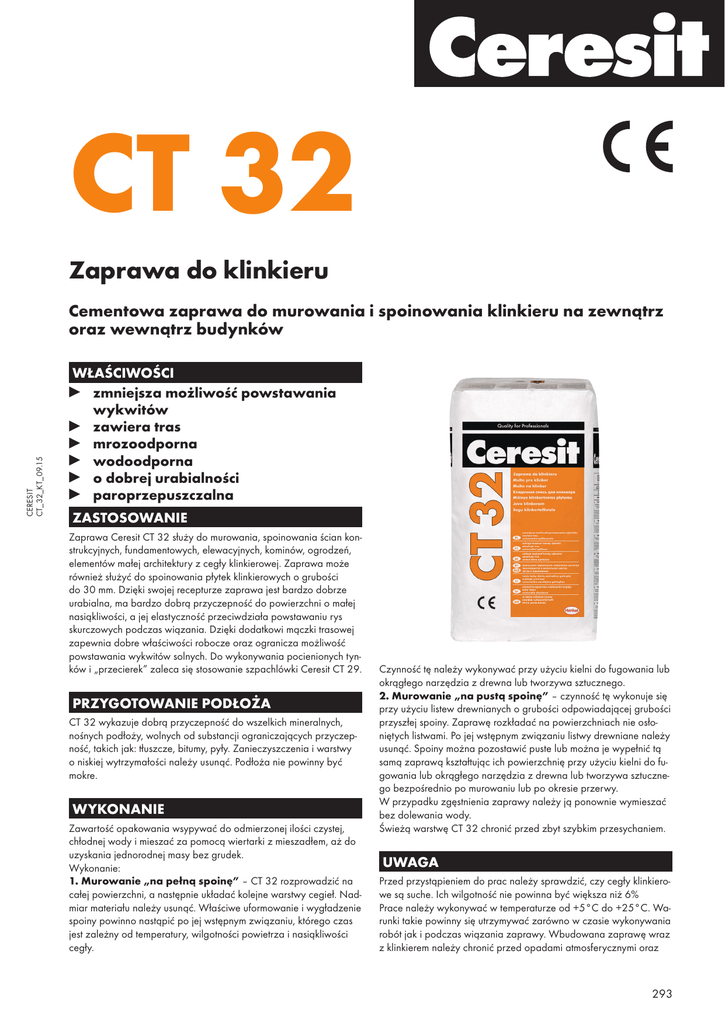 CT 32 Zaprawa do klinkieru CERESIT CT_32_KT_09.15 Cementowa zaprawa do murowania i spoinowania klinkieru na zewnątrz oraz wewnątrz budynków WŁAŚCIWOŚCI zmniejsza możliwość powstawania wykwitów zawiera tras mrozoodporna wodoodporna o dobrej urabialności paroprzepuszczalna ZASTOSOWANIE Zaprawa Ceresit CT 32 służy do murowania, spoinowania ścian konstrukcyjnych, fundamentowych, elewacyjnych, kominów, ogrodzeń, elementów małej architektury z cegły klinkierowej. Zaprawa może również służyć do spoinowania płytek klinkierowych o grubości do 30 mm. Dzięki swojej recepturze zaprawa jest bardzo dobrze urabialna, ma bardzo dobrą przyczepność do powierzchni o małej nasiąkliwości, a jej elastyczność przeciwdziała powstawaniu rys skurczowych podczas wiązania. Dzięki dodatkowi mączki trasowej zapewnia dobre właściwości robocze oraz ogranicza możliwość powstawania wykwitów solnych. Do wykonywania pocienionych tynków i „przecierek” zaleca się stosowanie szpachlówki Ceresit CT 29. PRZYGOTOWANIE PODŁOŻA CT 32 wykazuje dobrą przyczepność do wszelkich mineralnych, nośnych podłoży, wolnych od substancji ograniczających przyczepność, takich jak: tłuszcze, bitumy, pyły. Zanieczyszczenia i warstwy o niskiej wytrzymałości należy usunąć. Podłoża nie powinny być mokre. WYKONANIE Zawartość opakowania wsypywać do odmierzonej ilości czystej, chłodnej wody i mieszać za pomocą wiertarki z mieszadłem, aż do uzyskania jednorodnej masy bez grudek. Wykonanie: 1. Murowanie „na pełną spoinę” – CT 32 rozprowadzić na całej powierzchni, a następnie układać kolejne warstwy cegieł. Nadmiar materiału należy usunąć. Właściwe uformowanie i wygładzenie spoiny powinno nastąpić po jej wstępnym związaniu, którego czas jest zależny od temperatury, wilgotności powietrza i nasiąkliwości cegły. Czynność tę należy wykonywać przy użyciu kielni do fugowania lub okrągłego narzędzia z drewna lub tworzywa sztucznego. 2. Murowanie „na pustą spoinę” – czynność tę wykonuje się przy użyciu listew drewnianych o grubości odpowiadającej grubości przyszłej spoiny. Zaprawę rozkładać na powierzchniach nie osłoniętych listwami. Po jej wstępnym związaniu listwy drewniane należy usunąć. Spoiny można pozostawić puste lub można je wypełnić tą samą zaprawą kształtując ich powierzchnię przy użyciu kielni do fugowania lub okrągłego narzędzia z drewna lub tworzywa sztucznego bezpośrednio po murowaniu lub po okresie przerwy. W przypadku zgęstnienia zaprawy należy ją ponownie wymieszać bez dolewania wody. Świeżą warstwę CT 32 chronić przed zbyt szybkim przesychaniem. UWAGA Przed przystąpieniem do prac należy sprawdzić, czy cegły klinkierowe są suche. Ich wilgotność nie powinna być większa niż 6% Prace należy wykonywać w temperaturze od +5°C do +25°C. Warunki takie powinny się utrzymywać zarówno w czasie wykonywania robót jak i podczas wiązania zaprawy. Wbudowana zaprawę wraz z klinkierem należy chronić przed opadami atmosferycznymi oraz 293 nadmiernym nasłonecznieniem przez okres minimum 7 dni. Do tego celu należy użyć folii lub mat zabezpieczających. Jeżeli w ciągu najbliższych dni są przewidywane opady atmosferyczne bądź spadki temperatury poniżej +5°C należy zaniechać wykonywania prac murarskich. Należy zwrócić szczególną uwagę podczas zarabiania zaprawy, aby ilość dozowanej wody była zgodna z instrukcja stosowania. Murowanie zaprawy można wykonać w dwojaki sposób – metoda tradycyjna na tzw. pełną spoinę lub podczas murowania używać wcześniej przygotowanych listewek, które pozwalają na uzyskanie równych (wklęsłych) spoin jak również zachowania poziomu i równości poszczególnych warstw. W przypadku spoinowania muru konsystencja zaprawy powinna być półsucha tak, aby uniknąć pobrudzenia cegły. W przypadku zabrudzeń cegłę należy wyczyścić natychmiast przy użyciu zimnej wody. W celu uniknięcia różnicy w odcieniach, należy stosować CT 32 o tym samym numerze szarży produkcyjnej umieszczonym na każdym opakowaniu. CT 32 zawiera cement i zmieszana z wodą ma odczyn alkaliczny. W związku z tym należy chronić skórę i oczy. W przypadku kontaktu materiału z oczami płukać je obficie wodą i zasięgnąć porady lekarza. Zawartość chromu VI – poniżej 2 ppm w okresie ważności wyrobu. Posiada również aprobatę techniczną Instytutu Techniki Budowlanej AT-15-7027/2011 + Aneks nr 1 w systemie Ceresit Ceretherm Ceramic oraz Certyfikat Zakładowej Kontroli Produkcji Nr ITB – 0137/Z z dnia 10.02.2012. Wszelkie porady techniczne można uzyskać pod numerami telefonów: +48 800 120 241 +48 41 3710124. Poza informacjami podanymi w niniejszej karcie technicznej należy przestrzegać zasad sztuki budowlanej, wytycznych branżowych instytutów i stowarzyszeń, przedmiotowych norm krajowych i europejskich, dokumentów aprobacyjnych, przepisów BHP, itp. Wymienione powyżej cechy i właściwości techniczne określone zostały w oparciu o praktyczne doświadczenia oraz przeprowadzone badania. Wszelkie właściwości oraz zastosowania materiałów wykraczające poza zakres podany w niniejszej karcie technicznej wymagają naszego pisemnego potwierdzenia. Wszelkie dane odnoszą się do temperatury podłoża, otoczenia i materiału +23°C oraz wilgotności względnej powietrza 50%, o ile nie podano inaczej. W innych warunkach klimatycznych podane parametry mogą ulec zmianie. Informacje zawarte w niniejszej karcie technicznej, w szczególności zalecenia dotyczące sposobu i warunków aplikacji oraz zakresu zastosowania i użytkowania naszych produktów, zostały opracowane na podstawie naszego doświadczenia zawodowego. Niniejsza karta techniczna określa zakres stosowania materiału i zalecany sposób prowadzenia robót, ale nie może zastąpić zawodowego przygotowania wykonawcy. Producent gwarantuje jakość wyrobu, nat