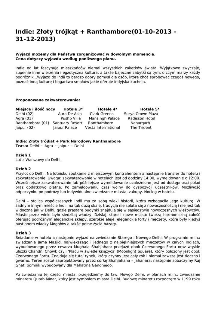 Indie: Złoty trójkąt + Ranthambore(01-10-2013 31-12-2013) Wyjazd możemy dla Państwa zorganizować w dowolnym momencie. Cena dotyczy wyjazdu według poniższego planu. Indie od lat fascynują mieszkańców niemal wszystkich zakątków świata. Wyjątkowe zwyczaje, zupełnie inne wierzenia i egzotyczna kultura, a także bajeczne zabytki są tym, o czym marzy każdy podróżnik...Wyjazd do Indii to bardzo dobry pomysł dla osób, które chcą spróbować czegoś nowego, poznać inną kulturę i bogactwo smaków jakie oferuje indyjska kuchnia. Proponowane zakwaterowanie: Miejsce i ilość nocy Hotele 3* Hotele 4* Delhi (02) Aura De Asia Clark Greens Agra (01) Pushp Villa Mansingh Palace Ranthambore (01) Santuary Resort Ranthambore Jaipur (02) Jaipur Palace Vesta International Hotele 5* Surya Crown Plaza Radisson Hotel Nahargarh The Trident Indie: Złoty trójkąt + Park Narodowy Ranthambore Trasa: Delhi ~ Agra ~ Jaipur ~ Delhi Dzień 1 Lot z Warszawy do Delhi. Dzień 2 Przylot do Delhi. Na lotnisku spotkanie z miejscowym kontrahentem a następnie transfer do hotelu i zakwaterowanie. Uwaga: zakwaterowanie w hotelach jest od godziny 14:00, wymeldowanie o 12:00. Wcześniejsze zakwaterowanie lub późniejsze wymeldowanie uzależnione jest od dostępności pokoi oraz dodatkowo płatne. Po zameldowaniu czas wolny do dyspozycji uczestników. Możliwość odpoczynku po podróży lub indywidualne zwiedzanie miasta, zakupy. Nocleg w hotelu. Delhi – stolica współczesnych Indii ma za sobą wieki historii, która wzbogaciła jego kulturę. W żadnym innym mieście Indii, na tak dużą skalę, tradycja nie splata się z nowoczesnością i nie jest tak widoczna jak w Delhi, gdzie prastare budynki znajdują się w sąsiedztwie nowoczesnych wieżowców. Miasto przez wieki było siedzibą władzy. Dzisiaj, stare i nowe miasto tworzą harmoniczną całość oferując podróżnym eleganckie sklepy, szerokie aleje, eleganckie forty i meczety, które były kiedyś bastionem władzy Mogołów a także pełne życia bazary. Dzień 3 Śniadanie w hotelu a następnie wyjazd na zwiedzanie Starego i Nowego Delhi. W programie m.in.: zwiedzanie Jama Masjid, największego i jednego z najpiękniejszych meczetów w całych Indiach, wybudowanego przez cesarza Mughala Shahjahan; przejazd obok Czerwonego Fortu oraz wąskie uliczki Chandni Chowk czyli 'Placu w świetle księżyca' (Moonlight Square), który położony jest obok Czerwonego Fortu. Znajduje się tutaj rynek, który czynny jest cały rok i niemal zawsze jest tłoczno i gwarno. Teren został zaprojektowany przez córkę Shahjahana – Jahanara; następnie zobaczymy Raj Ghat, pomnik wybudowany dla Mahatma Gandhiego. Po zwiedzaniu tej części miasta, przejedziemy do tzw. Nowgo Delhi, w planach m.in.: zwiedzanie minaretu Qutab Minar, który jest symbolem miasta Delhi. Budowę minaretu rozpoczęto w 1199 roku a ukończono w 1368, ma 72,5 metrów wysokości, 14,4 metra szerokości u podstawy a wieża prowadząca na górę posiada 379 schodów. Ta wieża wybudowana z piaskowca jest hindusko – islamskim cudem architektonicznym starożytnych Indii. Cały kompleks posiada również inne ważne budowle: brama wjazdowa wybudowana w 1310 roku, grobowiec Humayuna (Humayun's Tomb), który został zbudowany w XVI wieku przez jego żonę Haji Begum i wpisany na Światową Listę Dziedzictwa Kulturowego UNESCO w 1993 roku. Uważa się, iż mauzoleum jest prekursorem do powstania najsłynniejszego mauzoleum na świecie – Taj Mahal. Zbudowany kosztem półtora miliona rupii, pomnik był zapowiedzią budowania tzw. ogrodowych grobowców na subkontynencie indyjskim. Na koniec przejedziemy obok Rashtrapati Bhawan (która jest oficjalną rezydencją panującego Prezydenta), India Gate oraz kilku innych budynków rządowych. Powrót do hotelu późnym popołudniem i czas wolny do dyspozycji uczestników. Nocleg w hotelu. Dzień 4 Po śniadaniu, przejazd do Agry busem. Podczas przejazdu zwiedzanie Mathura Vrindavan, miejsce narodzin Kryszny. W samym mieście Vrindavanie znajduje się wiele starożytnych i współczesnych świątyń. Jest ono także siedzibą licznych organizacji religijnych, których wierzenia mają związek z Kryszną. Po przyjeździe do Agry zakwaterowanie w hotelu i czas wolny. Nocleg w hotelu. Dzień 5 Po śniadaniu, wyjazd na zwiedzanie Taj Mahal, który odbędzie się tzw. Tonga ride – kolorowymi dorożkami wśród pierwszych promieni słońca. Taj Mahal - indyjskie mauzoleum, wzniesione w ciągu 22 lat przez Szacha Jahana z dynastii Mogołów, na pamiątkę przedwcześnie zmarłej, ukochanej żony Mumtaz Mahal. Miejsce nazywane jest także 'niepowtarzalnym poematem białego marmuru' lub 'świątynią miłości' i zostało uznane za jeden z Siedmiu Cudów Świata. Następnie przejazd na zwiedzanie Czerwonego Fortu Agra. Agra Fort – zbudowany przez trzech władców imperium Mogołów począwszy od Akbara Wielkiego w 1565, jest niewątpliwie dziełem architektury. W 1983 roku Fort został wpisany na Listę Światowego Dziedzictwa UNESCO. Wewnątrz fortu znajduje się kilka znakomitych i wyrafinowanych budynków, głównie o charakterze pałacowym – np. the Moti Masjid, Pałac Jahangir, Khaas Mahal, Sheesh Mahal, Diwane-i-Am, Diwane-i-Khas oraz Musamman Burj, gdzie władaca Shah Jahan, piąty z dynastii Mogołów, umarł w więzieniu. Po zwiedzaniu powrót do hotelu. Po południu wykwaterowanie z hotelu oraz przejazd do Parku Narodowego Ranthambore. Park Narodowy Ranthambore – położony na skrzyżowaniu Aravallis i Vindhya, zaledwie 14 km od Sawai Madhopur, jest unikalnym przykładem bogactwa naturalnego i historycznego. Miejsce, gdzie pozostaje się w zgodzie z naturą w w samym sercu dżungli. Park nazywany jest także "ziemią Tygrysa", bowiem to tutaj większość z udokumentowanych materiałów z tym majestatycznym zwierzęciem zostało nagranych. Park ma 410 km2 powierzchni i obejmuje tereny porośnięte głównie suchymi liściastymi lasami.