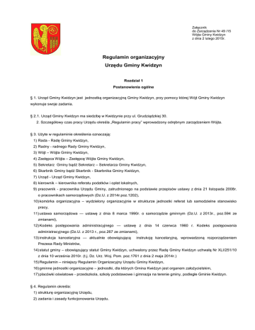 Załącznik do Zarządzenia Nr 49 /15 Wójta Gminy Kwidzyn z dnia 2 lutego 2015r. Regulamin organizacyjny Urzędu Gminy Kwidzyn Rozdział 1 Postanowienia ogólne § 1. Urząd Gminy Kwidzyn jest jednostką organizacyjną Gminy Kwidzyn, przy pomocy której Wójt Gminy Kwidzyn wykonuje swoje zadania. § 2.1. Urząd Gminy Kwidzyn ma siedzibę w Kwidzynie przy ul. Grudziądzkiej 30. 2. Szczegółowy czas pracy Urzędu określa „Regulamin pracy” wprowadzony odrębnym zarządzeniem Wójta. § 3. Użyte w regulaminie określenia oznaczają: 1) Rada - Radę Gminy Kwidzyn, 2) Radny - radnego Rady Gminy Kwidzyn, 3) Wójt – Wójta Gminy Kwidzyn, 4) Zastępca Wójta – Zastępcę Wójta Gminy Kwidzyn, 5) Sekretarz Gminy bądź Sekretarz – Sekretarza Gminy Kwidzyn, 6) Skarbnik Gminy bądź Skarbnik - Skarbnika Gminy Kwidzyn, 7) Urząd - Urząd Gminy Kwidzyn, 8) kierownik – kierownika referatu podatków i opłat lokalnych, 9) pracownik - pracownika Urzędu Gminy, zatrudnionego na podstawie przepisów ustawy z dnia 21 listopada 2008r. o pracownikach samorządowych (Dz.U. z 2014r.poz.1202), 10) komórka organizacyjna – wydzielony organizacyjnie w strukturze jednostki referat lub samodzielne stanowisko pracy, 11) ustawa samorządowa — ustawę z dnia 8 marca 1990r. o samorządzie gminnym (Dz.U. z 2013r., poz.594 ze zmianami), 12) Kodeks postępowania administracyjnego — ustawę z dnia 14 czerwca 1960 r. Kodeks postępowania administracyjnego (Dz.U. z 2013 r., poz.267 ze zmianami), 13) instrukcja kancelaryjna — aktualnie obowiązującą instrukcję kancelaryjną, wprowadzoną rozporządzeniem Prezesa Rady Ministrów, 14) statut gminy – obowiązujący statut Gminy Kwidzyn, uchwalony przez Radę Gminy Kwidzyn uchwałą Nr XLI/251/10 z dnia 10 września 2010r. (t.j. Dz. Urz. Woj. Pom. poz.1761 z dnia 2 maja 2014r.) 15) Regulamin – niniejszy Regulamin Organizacyjny Urzędu Gminy Kwidzyn, 16) gminne jednostki organizacyjne – jednostki, dla których Gmina Kwidzyn jest organem założycielskim, 17) placówki oświatowe - przedszkola, szkoły podstawowe i gimnazja na terenie gminy, podległe Gminie Kwidzyn. § 4. Regulamin określa: 1) strukturę organizacyjną Urzędu, 2) zadania i zasady funkcjonowania Urzędu. 2 § 5. Urząd realizuje zadania własne gminy określone ustawą samorządową, innymi ustawami szczególnymi, statutem gminy, uchwałami Rady oraz zadania zlecone z zakresu administracji rządowej, przekazane gminie ustawami lub w drodze porozumień zawartych z właściwymi organami administracji rządowej bądź samorządowej. Rozdział 2 Struktura organizacyjna Urzędu. § 6. W skład Urzędu wchodzą następujące komórki organizacyjne, które przy znakowaniu prowadzonych spraw i akt posługują się określonymi symbolami: 1) Wójt; 2) Zastępca Wójta – ZW; 3) Sekretarz Gminy – OR; 4) referat finansowy z następującymi stanowiskami pracy: 5) a) kierownik referatu – Skarbnik Gminy - FN, b) czteroosobowe stanowisko do spraw księgowości budżetowej – FN.I, FN.II, FN.III, FN.IV; referat podatków i opłat lokalnych z następującymi stanowiskami pracy: a) kierownik referatu – PO, b) dwuosobowe stanowisko do spraw wymiaru podatku rolnego, leśnego i od nieruchomości – PO.I, PO.II, c) stanowisko do spraw podatków lokalnych i innych opłat – PO.III, d) stanowisko do spraw księgowości i egzekucji podatku rolnego, leśnego i od nieruchomości – PO.IV, e) stanowisko do spraw opłaty za gospodarowanie odpadami komunalnymi – PO.V; 6) stanowisko do spraw dowodów osobistych i ewidencji działalności gospodarczej – SO; 7) stanowisko do spraw ewidencji ludności – EL; 8) dwuosobowe stanowisko do spraw kadr i płac– KP.I i KP.II; 9) samodzielne stanowisko do spraw administracyjnych i socjalnych – ST; 10) stanowisko do spraw organizacyjnych i samorządowych – OS; 11) stanowisko do spraw infrastruktury drogowej i transportu – DT; 12) stanowisko do spraw gospodarki lokalowej – GL; 13) stanowisko do spraw gospodarki komunalnej – GK; 14) stanowisko do spraw ochrony środowiska i gospodarki wodnej – OŚiGW; 15) dwuosobowe stanowisko do spraw gospodarki przestrzennej i budownictwa – GP.I i GP.II; 16) dwuosobowe stanowisko do spraw inwestycji –IK.I, IK.II; 17) stanowisko do spraw dzierżaw oraz opłat adiacenckich i planistycznych – GG; 18) dwuosobowe stanowisko do spraw gospodarki nieruchomościami– GN.I, GN II.; 19) stanowisko do spraw rozwoju i promocji gminy –RP; 20) stanowisko do spraw sportu, turystyki i organizacji pozarządowych – SOP; 21) stanowisko ds. zamówień publicznych i pozyskiwania środków pozabudżetowych – ZP; 22) stanowisko ds. zarządzania kryzysowego i obrony cywilnej oraz informatyzacji – ZK; 23) Pełnomocnik Wójta do spraw oświaty –OŚ; 24) Pełnomocnik Wójta do spraw rozwiązywania problemów społecznych – PS; 25) Pełnomocnik ds. ochrony informacji niejawnych – IN; 26) Administrator Bezpieczeństwa Informacji - ZK 27) Gminny Zespół Zarządzania Kryzysowego, którego skład osobowy i zadania określa odrębne zarządzenie Wójta. § 7. Oprócz wymienionych w § 6 stanowisk urzędniczych, tworzy się w Urzędzie stanowiska pomocnicze i obsługi: 1) stanowisko sekretarki do spraw obsługi sekretariatu Wójta – SA; 2) dwuosobowe stanowisko sekretarki do spraw Biura Obsługi Klienta – OK.I. i OK.II; 3 3) 2 stanowiska sprzątaczki, 4) stanowisko konserwatora - dozorcy i magazyniera obrony cywilnej, 5) 3 stanowiska robotnika gospodarczego, 6) 3 stanowiska konserwatorów sprzętu przeciwpożarowego w OSP. § 8.1. Nie są zmianami Regulaminu zmiany organizacyjne w zakresie określonym w § 6 i 7, w wyniku których następuje tworzenie, łączenie bądź podział istniejących stanowisk pracy, o ile zatrudnienie pracownika następuje na podstawie umowy o pracę na czas określony, na czas zastępstwa lub na czas wykonania określonej pracy. 2. Wójt może tworzyć spośród pracowników zatrudnionych w U