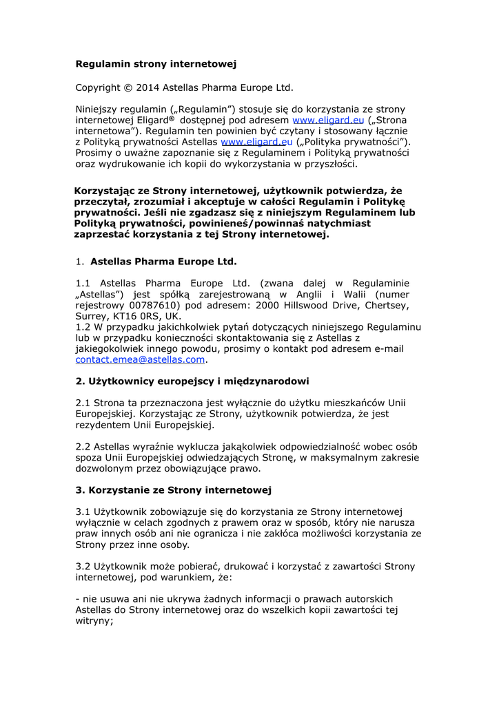 Regulamin strony internetowej Copyright © 2014 Astellas Pharma Europe Ltd. Niniejszy regulamin („Regulamin”) stosuje się do korzystania ze strony internetowej Eligard® dostępnej pod adresem www.eligard.eu („Strona internetowa”). Regulamin ten powinien być czytany i stosowany łącznie z Polityką prywatności Astellas www.eligard.eu („Polityka prywatności”). Prosimy o uważne zapoznanie się z Regulaminem i Polityką prywatności oraz wydrukowanie ich kopii do wykorzystania w przyszłości. Korzystając ze Strony internetowej, użytkownik potwierdza, że przeczytał, zrozumiał i akceptuje w całości Regulamin i Politykę prywatności. Jeśli nie zgadzasz się z niniejszym Regulaminem lub Polityką prywatności, powinieneś/powinnaś natychmiast zaprzestać korzystania z tej Strony internetowej. 1. Astellas Pharma Europe Ltd. 1.1 Astellas Pharma Europe Ltd. (zwana dalej w Regulaminie „Astellas”) jest spółką zarejestrowaną w Anglii i Walii (numer rejestrowy 00787610) pod adresem: 2000 Hillswood Drive, Chertsey, Surrey, KT16 0RS, UK. 1.2 W przypadku jakichkolwiek pytań dotyczących niniejszego Regulaminu lub w przypadku konieczności skontaktowania się z Astellas z jakiegokolwiek innego powodu, prosimy o kontakt pod adresem e-mail [email protected]. 2. Użytkownicy europejscy i międzynarodowi 2.1 Strona ta przeznaczona jest wyłącznie do użytku mieszkańców Unii Europejskiej. Korzystając ze Strony, użytkownik potwierdza, że jest rezydentem Unii Europejskiej. 2.2 Astellas wyraźnie wyklucza jakąkolwiek odpowiedzialność wobec osób spoza Unii Europejskiej odwiedzających Stronę, w maksymalnym zakresie dozwolonym przez obowiązujące prawo. 3. Korzystanie ze Strony internetowej 3.1 Użytkownik zobowiązuje się do korzystania ze Strony internetowej wyłącznie w celach zgodnych z prawem oraz w sposób, który nie narusza praw innych osób ani nie ogranicza i nie zakłóca możliwości korzystania ze Strony przez inne osoby. 3.2 Użytkownik może pobierać, drukować i korzystać z zawartości Strony internetowej, pod warunkiem, że: - nie usuwa ani nie ukrywa żadnych informacji o prawach autorskich Astellas do Strony internetowej oraz do wszelkich kopii zawartości tej witryny; - korzysta z zawartości Strony internetowej na wewnętrzne potrzeby własnej firmy i/lub wyłącznie do użytku osobistego; - w żaden sposób nie modyfikuje zawartości Strony internetowej; oraz - wykorzystuje ilustracje i inne materiały wizualne ze Strony internetowej w połączeniu z towarzyszącym im tekstem. Niedozwolone jest korzystanie z zawartości Strony internetowej w sposób niezgodny z zasadami określonymi wyżej bez uzyskania uprzedniej pisemnej zgody Astellas. 3.3 Użytkownik nie jest uprawniony do modyfikowania ani rozpowszechniania zawartości Strony internetowej, ani do jej powielania lub zamieszczania linków do niej bez uzyskania uprzedniej pisemnej zgody Astellas. W żadnych okolicznościach użytkownik nie może wykorzystywać zawartości Strony do celów komercyjnych. 3.4 Użytkownik przyjmuje do wiadomości, że ponosi odpowiedzialność za korzystanie przez niego z programu antywirusowego, firewalla i innego odpowiedniego oprogramowania zabezpieczającego podczas przeglądania internetu i uzyskiwania dostępu do Strony internetowej. Astellas nie ponosi odpowiedzialności za brak zastosowania przez użytkownika odpowiednich środków ostrożności podczas przeglądania internetu i Strony internetowej. 4. Prawa autorskie i inne prawa własności intelektualnej 4.1 Cała zawartość wyświetlana na Stronie internetowej oraz wszelkie prawa autorskie, znaki towarowe, wzory i inne prawa własności intelektualnej do Strony internetowej i jej zawartości lub prawa z nimi związane (łącznie „PWI”) są własnością Astellas lub są przez Astellas licencjonowane. 4.2 Jeśli użytkownikowi z mocy prawa lub z innego tytułu przysługują jakiekolwiek PWI do Strony internetowej, użytkownik niniejszym przenosi na Astellas (lub osobę trzecią wskazaną przez Astellas) wszystkie prawa, tytuły i udziały (zarówno prawne, jak i faktyczne) do takich PWI na całym świecie, w najszerszym możliwym zakresie, łącznie z wszelkimi odnowieniami i rozszerzeniami tych PWI. Użytkownik bezwarunkowo i nieodwołalnie zrzeka się wszelkich autorskich praw osobistych jakie mogą mu przysługiwać obecnie lub w przyszłości w stosunku do Strony internetowej. 4.3 Użytkownik zobowiązuje się do dokonania wszelkich czynności oraz podpisania wszelkich dokumentów, jakich Astellas może racjonalnie zażądać w celu przeniesienia na Astellas PWI dla zrealizowania postanowień niniejszego Regulaminu lub w celu ustanowienia, zachowania albo wykonania praw Astellas wynikających z niniejszego Regulaminu. 5. Informacje o Stronie internetowej 5.1 Niniejsza Strona internetowa zawiera informacje o podawaniu Eligard® 5.2 Niniejsza Strona internetowa zawiera informacje przeznaczone do przeglądania przez przedstawicieli zawodów medycznychodpowiedzialnych za przypisywanie Eligard® . Pacjenci zawsze powinni zasięgnąć porady wykwalifikowanego specjalisty przed zastosowaniem kuracji lub podjęciem innego leczenia. 5.3 Informacje zawarte na tej Stronie powinny być przeglądane z jednoczesnym uwzględnieniem informacji zawartych w opakowaniu produktu. 6. Odpowiedzialność 6.1 Astellas wyłącza wszelkie zapewnienia, gwarancje, warunki i terminy określone w sposób wyraźny lub dorozumiany przez ustawę, prawo zwyczajowe lub w inny sposób, w maksymalnym zakresie dozwolonym przez prawo. Astellas nie ponosi odpowiedzialności za utratę zysku, działalności lub wartości firmy, ani za żadne straty szczególne, pośrednie, przypadkowe, wtórne lub ekonomiczne, spowodowane przez albo powstałe w związku z niniejszymi Regulaminem lub na skutek korzystania ze Strony internetowej. 6.2 Astellas dostarcza zawartość Strony internetowej, działając w dobrej wierze, nie daje jednak gw
