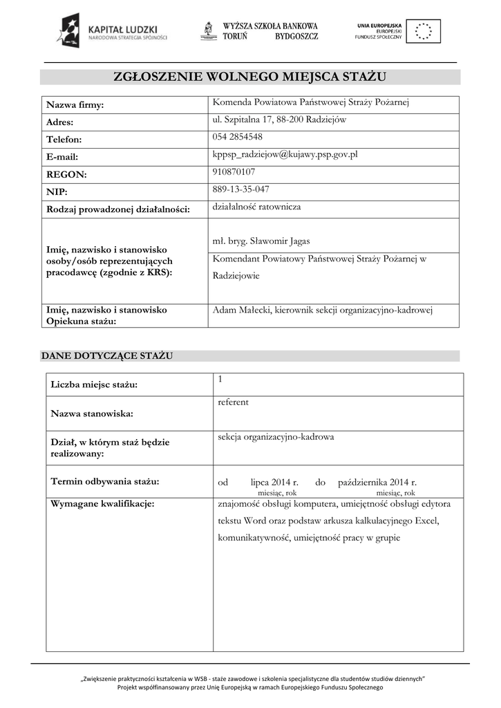 ZGŁOSZENIE WOLNEGO MIEJSCA STAŻU Nazwa firmy: Komenda Powiatowa Państwowej Straży Pożarnej Adres: ul. Szpitalna 17, 88-200 Radziejów Telefon: 054 2854548 E-mail: [email protected] REGON: 910870107 NIP: 889-13-35-047 Rodzaj prowadzonej działalności: działalność ratownicza Imię, nazwisko i stanowisko osoby/osób reprezentujących pracodawcę (zgodnie z KRS): Imię, nazwisko i stanowisko Opiekuna stażu: mł. bryg. Sławomir Jagas Komendant Powiatowy Państwowej Straży Pożarnej w Radziejowie Adam Małecki, kierownik sekcji organizacyjno-kadrowej DANE DOTYCZĄCE STAŻU Liczba miejsc stażu: 1 referent Nazwa stanowiska: Dział, w którym staż będzie realizowany: Termin odbywania stażu: sekcja organizacyjno-kadrowa od lipca 2014 r. miesiąc, rok Wymagane kwalifikacje: do października 2014 r. miesiąc, rok znajomość obsługi komputera, umiejętność obsługi edytora tekstu Word oraz podstaw arkusza kalkulacyjnego Excel, komunikatywność, umiejętność pracy w grupie „Zwiększenie praktyczności kształcenia w WSB - staże zawodowe i szkolenia specjalistyczne dla studentów studiów dziennych” Projekt współfinansowany przez Unię Europejską w ramach Europejskiego Funduszu Społecznego Oświadczam, że: - zakład nie jest w stanie upadłości, likwidacji; - organizacja stażu dla skierowanego studenta nie będzie przyczyną zwolnień pracowników zatrudnionych w przedsiębiorstwie. SZCZEGÓŁOWY PROGRAM STAŻU Zakres obowiązków Stażysty Udział w redagowaniu decyzji administracyjnych wydawanych w związku potrzebami organizacyjnymi oraz wynikających ze stosunku służbowego funkcjonariuszy; Udział w aktualizacji Powiatowego Planu Ratowniczego; Udział w przygotowywaniu dokumentacji do przekazania do archiwum zakładowego oraz realizacja zadań związanych z funkcjonowaniem archiwum (przyjmowanie dokumentacji, brakowanie itp.); Udział w ćwiczeniach obiektowych realizowanych przez Komendę Powiatową PSP w Radziejowie; Udział w naradach dotyczących stanu bezpieczeństwa na terenie powiatu radziejowskiego; Udział w przygotowaniu i organizacji konferencji dotyczących aspektów bezpieczeństwa na terenie powiatu radziejowskiego. Realizowanie zadań związanych z obiegiem dokumentacji w Komendzie Powiatowej PSP w Radziejowie. Udział w przygotowywaniu zmian w obowiązujących w Komendzie Powiatowej PSP w Radziejowie regulaminach organizacyjnych. Realizacja zadań związanych z ewidencjonowaniem oraz rozliczaniem czasu służby funkcjonariuszy . Wymiar godzinowy Liczba godzin dziennie: 8 Godziny pracy: od 800 do 1600 Cele edukacyjne „Zwiększenie praktyczności kształcenia w WSB - staże zawodowe i szkolenia specjalistyczne dla studentów studiów dziennych” Projekt współfinansowany przez Unię Europejską w ramach Europejskiego Funduszu Społecznego 1. Zapoznanie się ze specyfiką działalności KP PSP w Radziejowie i jej funkcjonowania w aspekcie formalnoprawnym i merytorycznym. Poznanie struktury organizacyjnej danej jednostki, systemu kontroli i nadzoru, przepisów BHP. 2. Poznanie zasad obiegu dokumentacji w instytucji; 3. Zapoznanie się z zasadami ochrony danych osobowych i informacji niejawnych i wiadomości prawnie chronionych oraz bezpieczeństwem teleinformatycznym; 4. Dokonywanie analizy typowych problemów obszaru działania KP PSP w Radziejowie z zakresu organizacji; 5. Opanowywanie warsztatu pracy na określonym stanowisku w formie: zdobywanie umiejętności dokonywania trafnych obserwacji, systematycznego przygotowywania materiałów do pracy (konspektów, scenariuszy, programów, planów), ćwiczenie umiejętności korzystania z dostępnych źródeł informacji, wykonywanie tych samych zadań, jakie wykonują osoby zatrudnione w instytucji. 6. Zdobycie praktycznych umiejętności związanych z zagadnieniem bezpieczeństwa publicznego: - obserwacja wdrażania procedur, dotyczących ochrony ładu prawnego oraz spokoju i porządku publicznego, lub - pomoc w tworzeniu oraz redagowaniu planu reagowania kryzysowego, lub - obserwacja procedur zabezpieczania obiektów, obszarów, działań prewencyjnych wobec potencjalnych zagrożeń bezpieczeństwa dla przedsiębiorstw lub instytucji 7. Udział w bieżących, ważnych wydarzeniach z życia instytucji, w szczególności takich, jak: konferencje, narady, wyjazdy. 8. Poznanie przepisów dotyczących zadań i kompetencji osób funkcyjnych w danej instytucji, 9. Zapoznanie z techniką tworzenia, selekcji i przechowywania dokumentacji urzędowej, procedurami decyzyjnymi w instytucji obowiązującymi w czasie pokoju, kryzysu i wojny, zadaniami instytucji w przypadku klęski żywiołowej, stanu wyjątkowego i wojennego, 10. Zdobycie umiejętności opracowywania projektów aktów normatywnych stanowionych przez Komendanta Powiatowego PSP w Radziejowie dotyczącej bezpieczeństwa obywateli i porządku publicznego, 11. Poznanie systemów i technologii informacyjnych stosowanych przez KP PSP w Radziejowie, 12. Zdobycie umiejętności pracy w zespołach ludzkich, przygotowanie do samodzielnej pracy oraz podejmowania decyzji. Zobowiązuję się do: - dostarczenia, wraz z wypełnionym Zgłoszeniem wolnego miejsca stażu, kserokopii wpisu do KRS - wzięcia udziału w spotkaniu informacyjnym dla studentów, podczas którego zostanie zaprezentowana firma/instytucja, którą reprezentuję Radziejów, dnia 18.06.2014 r. Miejscowość i data …………………..………………………………….. Podpis osoby reprezentującej i pieczątka firm „Zwiększenie praktyczności kształcenia w WSB - staże zawodowe i szkolenia specjalistyczne dla studentów studiów dziennych” Projekt współfinansowany przez Unię Europejską w ramach Europejskiego Funduszu Społecznego