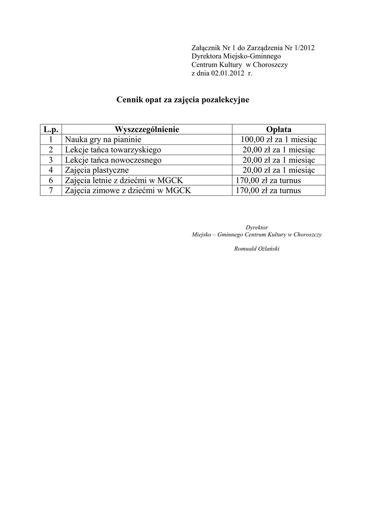Załącznik Nr 1 do Zarządzenia Nr 1/2012 Dyrektora Miejsko-Gminnego Centrum Kultury w Choroszczy z dnia 02.01.2012 r. Cennik opat za zajęcia pozalekcyjne L.p. 1 2 3 4 6 7 Wyszczególnienie Nauka gry na pianinie Lekcje tańca towarzyskiego Lekcje tańca nowoczesnego Zajęcia plastyczne Zajęcia letnie z dziećmi w MGCK Zajęcia zimowe z dziećmi w MGCK Opłata 100,00 zł za 1 miesiąc 20,00 zł za 1 miesiąc 20,00 zł za 1 miesiąc 20,00 zł za 1 miesiąc 170,00 zł za turnus 170,00 zł za turnus Dyrektor Miejsko – Gminnego Centrum Kultury w Choroszczy Romuald Ożlański