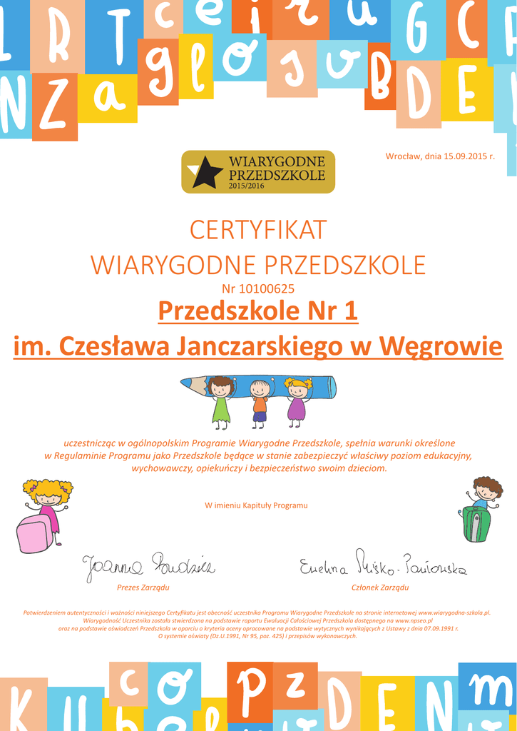 Wrocław, dnia 15.09.2015 r. CERTYFIKAT WIARYGODNE PRZEDSZKOLE Nr 10100625 Przedszkole Nr 1 im. Czesława Janczarskiego w Węgrowie uczestnicząc w ogólnopolskim Programie Wiarygodne Przedszkole, spełnia warunki określone w Regulaminie Programu jako Przedszkole będące w stanie zabezpieczyć właściwy poziom edukacyjny, wychowawczy, opiekuńczy i bezpieczeństwo swoim dzieciom. W imieniu Kapituły Programu Prezes Zarządu Członek Zarządu Potwierdzeniem autentyczności i ważności niniejszego Certyfikatu jest obecność uczestnika Programu Wiarygodne Przedszkole na stronie internetowej www.wiarygodna-szkola.pl. Wiarygodność Uczestnika została stwierdzona na podstawie raportu Ewaluacji Całościowej Przedszkola dostępnego na www.npseo.pl oraz na podstawie oświadczeń Przedszkola w oparciu o kryteria oceny opracowane na podstawie wytycznych wynikających z Ustawy z dnia 07.09.1991 r. O systemie oświaty (Dz.U.1991, Nr 95, poz. 425) i przepisów wykonawczych.