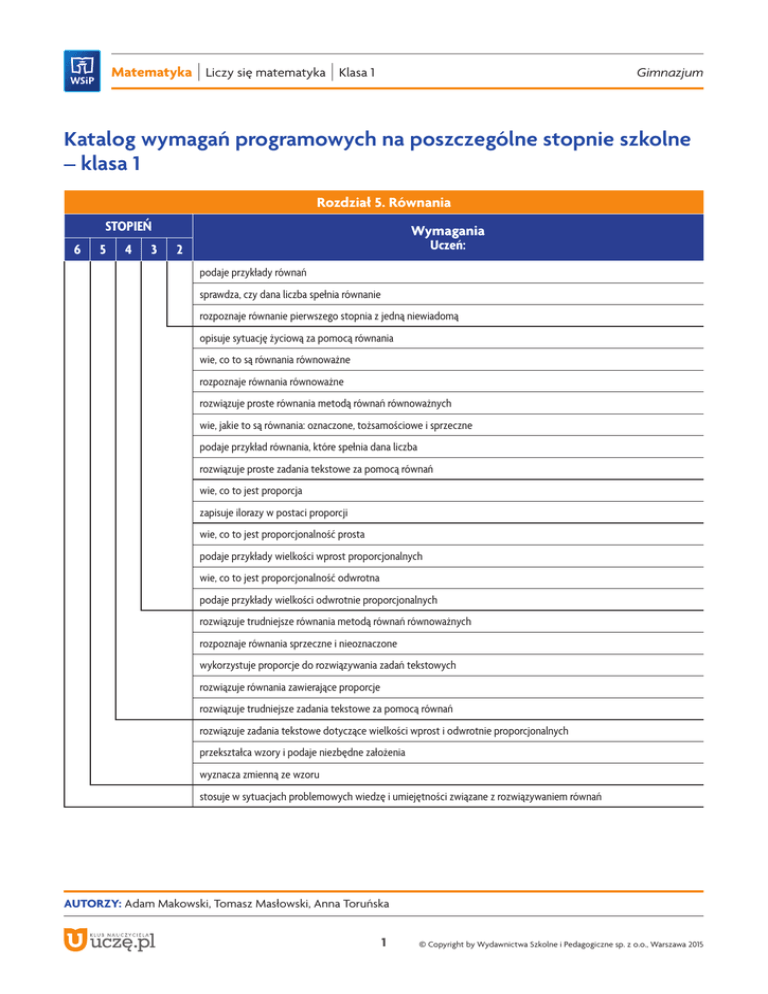 Matematyka | Liczy się matematyka | Klasa 1 Gimnazjum Katalog wymagań programowych na poszczególne stopnie szkolne – klasa 1 Rozdział 5. Równania STOPIEŃ 6 5 4 3 Wymagania Uczeń: 2 podaje przykłady równań sprawdza, czy dana liczba spełnia równanie rozpoznaje równanie pierwszego stopnia z jedną niewiadomą opisuje sytuację życiową za pomocą równania wie, co to są równania równoważne rozpoznaje równania równoważne rozwiązuje proste równania metodą równań równoważnych wie, jakie to są równania: oznaczone, tożsamościowe i sprzeczne podaje przykład równania, które spełnia dana liczba rozwiązuje proste zadania tekstowe za pomocą równań wie, co to jest proporcja zapisuje ilorazy w postaci proporcji wie, co to jest proporcjonalność prosta podaje przykłady wielkości wprost proporcjonalnych wie, co to jest proporcjonalność odwrotna podaje przykłady wielkości odwrotnie proporcjonalnych rozwiązuje trudniejsze równania metodą równań równoważnych rozpoznaje równania sprzeczne i nieoznaczone wykorzystuje proporcje do rozwiązywania zadań tekstowych rozwiązuje równania zawierające proporcje rozwiązuje trudniejsze zadania tekstowe za pomocą równań rozwiązuje zadania tekstowe dotyczące wielkości wprost i odwrotnie proporcjonalnych przekształca wzory i podaje niezbędne założenia wyznacza zmienną ze wzoru stosuje w sytuacjach problemowych wiedzę i umiejętności związane z rozwiązywaniem równań AutorZY: Adam Makowski, Tomasz Masłowski, Anna Toruńska 1 © Copyright by Wydawnictwa Szkolne i Pedagogiczne sp. z o.o., Warszawa 2015 Matematyka | Liczy się matematyka | Klasa 1 Gimnazjum Katalog wymagań programowych na poszczególne stopnie szkolne – klasa 1 Rozdział 6. Figury płaskie II STOPIEŃ 6 5 4 3 Wymagania Uczeń: 2 rozróżnia czworokąty: prostokąt, kwadrat, romb, równoległobok, trapez, deltoid zna wzory na obliczanie pól czworokątów oblicza pole prostokąta, którego boki są podane w tych samych jednostkach oblicza pola wielokątów w prostych przypadkach wie, jakie to są wielokąty foremne odczytuje współrzędne punktów zaznaczonych w układzie współrzędnych zaznacza w układzie współrzędnych punkty o danych współrzędnych rozpoznaje, w których ćwiartkach układu współrzędnych leżą dane punkty zna własności kątów i przekątnych w wybranych czworokątach oblicza miary kątów w trójkątach i czworokątach zamienia jednostki pola oblicza pole prostokąta, którego boki są podane w różnych jednostkach rysuje trójkąty i czworokąty w układzie współrzędnych oblicza pola i obwody wielokątów narysowanych na płaszczyźnie stosuje własności czworokątów do rozwiązywania zadań rozwiązuje zadania tekstowe dotyczące wielokątów oblicza pola i obwody wielokątów w układzie współrzędnych oblicza miary kątów wewnętrznych i zewnętrznych wielokątów foremnych rozwiązuje skomplikowane zadania tekstowe i konstrukcyjne dotyczące wielokątów przeprowadza dowody z zastosowaniem własności dotyczących czworokątów przeprowadza dowody z zastosowaniem własności wielokątów foremnych AutorZY: Adam Makowski, Tomasz Masłowski, Anna Toruńska 1 © Copyright by Wydawnictwa Szkolne i Pedagogiczne sp. z o.o., Warszawa 2015 Matematyka | Liczy się matematyka | Klasa 1 Gimnazjum Katalog wymagań programowych na poszczególne stopnie szkolne – klasa 1 Rozdział 7. Symetrie STOPIEŃ 6 5 4 3 Wymagania Uczeń: 2 wie, jakie to są punkty symetryczne względem prostej wie, jakie to są punkty symetryczne względem punktu rozpoznaje pary figur symetrycznych względem prostej rozpoznaje pary figur symetrycznych względem punktu rysuje punkty symetryczne względem prostej rysuje punkty symetryczne względem punktu wskazuje osie symetrii figury w prostych przykładach wskazuje środek symetrii figury w prostych przykładach wyznacza współrzędne punktów symetrycznych względem osi x i y w prostych przykładach wyznacza współrzędne punktu symetrycznego względem początku układu współrzędnych podaje własności punktów symetrycznych względem prostej rysuje figury symetryczne względem prostej podaje własności punktów symetrycznych względem punktu rysuje figury symetryczne względem punktu znajduje prostą, względem której punkty są symetryczne znajduje punkt, względem którego punkty są symetryczne wie, jakie to są figury osiowosymetryczne wie, jakie to są figury środkowosymetryczne znajduje oś symetrii figury w trudniejszych przykładach znajduje środek symetrii figury w trudniejszych przykładach wyznacza współrzędne punktów symetrycznych względem osi x i y w trudniejszych przykładach znajduje prostą, względem której figury są symetryczne znajduje punkt, względem którego figury są symetryczne podaje przykłady figur, które mają więcej niż jedną oś symetrii podaje przykłady figur, które mają więcej niż jeden środek symetrii podaje liczbę osi symetrii n-kąta foremnego rozpoznaje n-kąty foremne mające środek symetrii wyznacza współrzędne wierzchołków trójkątów i czworokątów, które są osiowosymetryczne wyznacza współrzędne wierzchołków trójkątów i czworokątów, które są środkowosymetryczne rozwiązuje zadania dotyczące symetrii o podwyższonym stopniu trudności AutorZY: Adam Makowski, Tomasz Masłowski, Anna Toruńska 1 © Copyright by Wydawnictwa Szkolne i Pedagogiczne sp. z o.o., Warszawa 2015