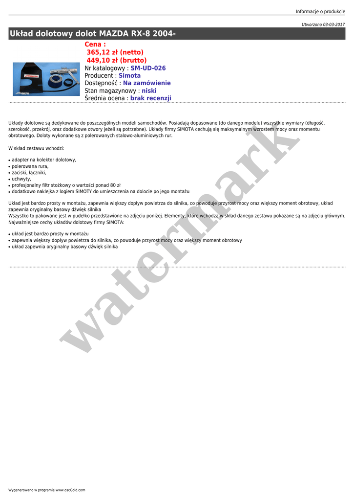Informacje o produkcie Utworzono 03-03-2017 Układ dolotowy dolot MAZDA RX-8 2004Cena : 365,12 zł (netto) 449,10 zł (brutto) Nr katalogowy : SM-UD-026 Producent : Simota Dostępność : Na zamówienie Stan magazynowy : niski Średnia ocena : brak recenzji W skład zestawu wchodzi: ● ● ● ● ● ● er m ar k Układy dolotowe są dedykowane do poszczególnych modeli samochodów. Posiadają dopasowane (do danego modelu) wszystkie wymiary (długość, szerokość, przekrój, oraz dodatkowe otwory jeżeli są potrzebne). Układy firmy SIMOTA cechują się maksymalnym wzrostem mocy oraz momentu obrotowego. Doloty wykonane są z polerowanych stalowo-aluminiowych rur. adapter na kolektor dolotowy, polerowana rura, zaciski, łączniki, uchwyty, profesjonalny filtr stożkowy o wartości ponad 80 zł dodatkowo naklejka z logiem SIMOTY do umieszczenia na dolocie po jego montażu Układ jest bardzo prosty w montażu, zapewnia większy dopływ powietrza do silnika, co powoduje przyrost mocy oraz większy moment obrotowy, układ zapewnia oryginalny basowy dźwięk silnika Wszystko to pakowane jest w pudełko przedstawione na zdjęciu poniżej. Elementy, które wchodzą w skład danego zestawu pokazane są na zdjęciu głównym. Najważniejsze cechy układów dolotowy firmy SIMOTA: ● ● w at ● układ jest bardzo prosty w montażu zapewnia większy dopływ powietrza do silnika, co powoduje przyrost mocy oraz większy moment obrotowy układ zapewnia oryginalny basowy dźwięk silnika Wygenerowano w programie www.oscGold.com