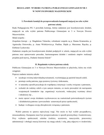 REGULAMIN WYBORU PATRONA PUBLICZNEGO GIMNAZJUM NR 3 W NOWYM DWORZE MAZOWIECKIM I. Powołanie komisji do przeprowadzenia kampanii mającej na celu wybór patrona szkoły. Rada Pedagogiczna PG 3 powołała komisję, której zadaniem jest koordynowanie działań, mających na celu wybór patrona Publicznego Gimnazjum nr 3 w Nowym Dworze Mazowieckim. Skład zespołu : Zespołem kieruje – p. Magdalena Tokarska, członkami zespołu są p. Hanna Kramarska, p. Agnieszka Ostrowska, p. Anna Wiórkiewicz,p. Paulina. Hajda p. Marzenna. Rączka, p. Elżbieta Cychowska Zadaniem zespołu jest koordynowanie działań podjętych w szkole, mających na celu wybór patrona oraz opracowanie procedur, harmonogramu działań i ustalenie etapów realizacji projektu pod nazwą „Nadanie Imienia Szkole” II. Regulamin wyboru patrona szkoły Publiczne Gimnazjum nr 3 w Nowym Dworze Mazowieckim to placówka, która ma wiele osiągnięć. Poprzez nadanie imienia szkoła: uzyskuje swoistą indywidualną tożsamość, wyróżniającą ją spośród innych szkół, promuje osobę patrona, jego postawę życiową i dokonania, w naturalny sposób pozyskuje do współpracy instytucje i osoby związane z patronem, wchodzi do rodziny szkół o tym samym imieniu, co może prowadzić do nawiązania wzajemnych kontaktów (np. organizacji wycieczek, wakacyjnej wymiany dzieci i młodzieży itp. , może oprzeć swoje działania wychowawcze na wartościach potwierdzonych życiem i działalnością patrona i powszechnie uznawanych przez społeczność, buduje i wzbogaca swoją obrzędowość związaną z patronem. Wybór patrona to sprawa najwyższej wagi. Nie może to być wybór przypadkowy, nieuzasadniony. Kampania musi być przeprowadzona w sposób przemyślany i kontrolowany. Przy wyborze społeczność szkolna (rodzice, uczniowie, nauczyciele, pracownicy administracji i obsługi) muszą kierować się rangą szkoły i rolą, jaką odgrywa w środowisku. Imię patrona – imię szkoły powinno nawiązywać do historii lub współczesności miasta, regionu lub Polski. Zasady W wyborach bierze udział cała społeczność szkoły : uczniowie, rodzice, nauczyciele, pracownicy administracji i obsługi. Wszyscy realizują projekt pod nazwą „Nadanie Imienia Szkole”. Terminy realizacji poszczególnych etapów wyboru patrona ustala zespół wyznacza osoby koordynujący w porozumieniu z dyrekcją. Dyrekcja w porozumieniu z zespołem koordynującym odpowiedzialne za realizację zadań szczegółowych. Dyrekcja kontroluje sprawny przebieg poszczególnych etapów i rozlicza osoby odpowiedzialne za ich realizację. Protokół z realizacji projektu „Nadanie Imienia Szkole” oraz wniosek o nadanie szkole imienia zostanie skierowane przez dyrektora szkoły do Burmistrza Miasta Nowy Dwór Mazowiecki. Zgłoszenie kandydatury osoby żyjącej wymaga jej pisemnej zgody. III. Procedury wyboru patrona Publicznego Gimnazjum nr 3 w Nowym Dworze Maz. W procesie wyboru patrona uczestniczą nauczyciele, pracownicy administracji i obsługi, rodzice i uczniowie Publicznego Gimnazjum nr 3 w Nowym Dworze Maz. Każda społeczność przedstawia swoich kandydatów. Nad przebiegiem wyboru patrona przez rodziców czuwa: wicedyrektor szkoły, wychowawcy, zespół koordynujący oraz przewodniczący Rady Rodziców. Nad przebiegiem wyboru patrona przez nauczycieli czuwają: wicedyrektor szkoły oraz wyznaczeni nauczyciele. Nad przebiegiem wyboru patrona przez uczniów czuwają: wychowawcy klas, Samorząd Uczniowski wraz z opiekunem. Nad przebiegiem wyboru patrona przez pracowników administracji i obsługi: czuwa wicedyrektor szkoły, zespół koordynujący, pracownik administracji oraz pracownik obsługi. Wychowawcy gromadzą propozycje zgłaszane przez rodziców. Zespół koordynujący jest odpowiedzialny za przeprowadzenie kampanii reklamującej akcję wybierania kandydatów na patrona szkoły. Wybory są trzyetapowe. ETAP I Wybory kandydata na patrona przez uczniów Wychowawcy przeprowadzą lekcje wychowawcze na temat: W poszukiwaniu autorytetu - Kto może być patronem szkoły? Na godzinach wychowawczych odbędą się dyskusje, prezentacje kandydatów na patrona szkoły. Uczniowie każdej klasy wytypują jednego kandydata, który uzyska największą ilość głosów. Jeśli taką samą liczbę głosów uzyska kilku kandydatów, głosowanie zostanie powtórzone. Wybory w klasach odbędą się przez głosowanie: tajne, równe, bezpośrednie, powszechne, większościowe. Gospodarze klas wraz z wychowawcą sporządzą protokół z głosowania i przekażą go koordynatorom projektu. Zespoły klasowe pod kierunkiem wychowawcy przygotują krótką prezentację multimedialną swojego kandydata. Spośród zgłoszonych propozycji uczniowie w tajnym głosowaniu wybiorą dwie kandydatury. Zwyciężą kandydatury, które uzyskają największą liczbę głosów. Jeśli taką samą liczbę głosów uzyska kilku kandydatów, głosowanie zostanie powtórzone. Głosowanie przeprowadzi Samorząd Uczniowski. Z przebiegu głosowania zostanie sporządzony protokół. Wybory kandydata na patrona przez nauczycieli Nauczyciele zgłaszają swoich kandydatów do koordynatorów projektu. Spośród zgłoszonych propozycji nauczyciele wybierają jednego kandydata. Wybory odbędą się przez głosowanie tajne, równe, bezpośrednie, powszechne, większościowe. Jeśli taką samą liczbę głosów uzyska kilku kandydatów, głosowanie zostanie powtórzone. Do przeliczenia głosów zostanie powołana Komisja Skrutacyjna w składzie : - Wicedyrektor szkoły jako przewodniczący - Wyznaczeni pracownicy- jako członkowie. Z pracy Komisji zostanie sporządzony protokół Wybory kandydata na patrona przez rodziców Na stronie internetowej szkoły zostanie zamieszczona informacja o realizacji przez szkołę projektu „ Nadanie Imienia Szkole”; Wychowawcy klas poinformują rodziców o realizacji przez szkołę projektu „ Nadanie Imienia Szkole”. Rodzice przekazują swoje propozycje 
