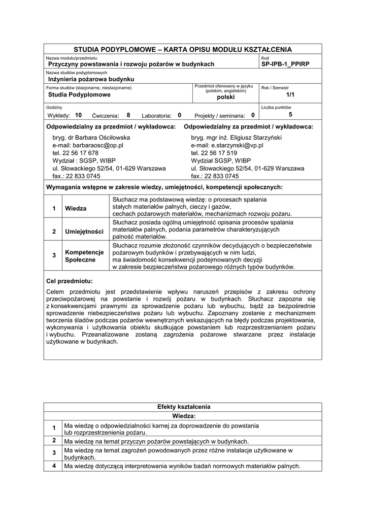 STUDIA PODYPLOMOWE – KARTA OPISU MODUŁU KSZTAŁCENIA Nazwa modułu/przedmiotu Kod Przyczyny powstawania i rozwoju pożarów w budynkach SP-IPB-1_PPIRP Nazwa studiów podyplomowych Inżynieria pożarowa budynku Przedmiot oferowany w języku (polskim, angielskim) Forma studiów (stacjonarne, niestacjonarne) Studia Podyplomowe Rok / Semestr 1/1 polski Liczba punktów Godziny Wykłady: 10 Ćwiczenia: 8 Laboratoria: Odpowiedzialny za przedmiot / wykładowca: bryg. dr Barbara Ościłowska e-mail: [email protected] tel. 22 56 17 678 Wydział : SGSP, WIBP ul. Słowackiego 52/54, 01-629 Warszawa fax.: 22 833 0745 0 Projekty / seminaria: 0 5 Odpowiedzialny za przedmiot / wykładowca: bryg. mgr inż. Eligiusz Starzyński e-mail: [email protected] tel. 22 56 17 519 Wydział SGSP, WIBP ul. Słowackiego 52/54, 01-629 Warszawa fax.: 22 833 0745 Wymagania wstępne w zakresie wiedzy, umiejętności, kompetencji społecznych: 1 Wiedza 2 Umiejętności 3 Kompetencje Społeczne Słuchacz ma podstawową wiedzę: o procesach spalania stałych materiałów palnych, cieczy i gazów, cechach pożarowych materiałów, mechanizmach rozwoju pożaru. Słuchacz posiada ogólną umiejętność opisania procesów spalania materiałów palnych, podania parametrów charakteryzujących palność materiałów. Słuchacz rozumie złożoność czynników decydujących o bezpieczeństwie pożarowym budynków i przebywających w nim ludzi, ma świadomość konsekwencji podejmowanych decyzji w zakresie bezpieczeństwa pożarowego różnych typów budynków. Cel przedmiotu: Celem przedmiotu jest przedstawienie wpływu naruszeń przepisów z zakresu ochrony przeciwpożarowej na powstanie i rozwój pożaru w budynkach. Słuchacz zapozna się z konsekwencjami prawnymi za sprowadzenie pożaru lub wybuchu, bądź za bezpośrednie sprowadzenie niebezpieczeństwa pożaru lub wybuchu. Zapoznany zostanie z mechanizmem tworzenia śladów podczas pożarów wewnętrznych wskazujących na błędy podczas projektowania, wykonywania i użytkowania obiektu skutkujące powstaniem lub rozprzestrzenianiem pożaru i wybuchu. Przeanalizowane zostaną zagrożenia pożarowe stwarzane przez instalacje użytkowane w budynkach. Efekty kształcenia Wiedza: 1 2 3 4 Ma wiedzę o odpowiedzialności karnej za doprowadzenie do powstania lub rozprzestrzenienia pożaru. Ma wiedzę na temat przyczyn pożarów powstających w budynkach. Ma wiedzę na temat zagrożeń powodowanych przez różne instalacje użytkowane w budynkach. Ma wiedzę dotyczącą interpretowania wyników badań normowych materiałów palnych. 1 Umiejętności: Dysponuje wiedzą na temat rozpoznawania i identyfikowania zagrożeń pożarami i wybuchami. 2 Umie zidentyfikować i zinterpretować ślady pożarowe. 3 Potrafi stworzyć i zweryfikować hipotezy o przyczynie pożaru lub wybuchu. 4 Umie zidentyfikować zagrożenia mogące prowadzić do powstania pożaru lub wybuchu. Kompetencje społeczne: 1 Ma świadomość ważności i rozumie pozatechniczne aspekty i skutki działań. Rozumie, że musi postępować zgodnie z obowiązującym prawem i zasadami etyki. 2 Potrafi myśleć i działać w sposób kreatywny i przedsiębiorczy. W sposób asertywny reaguje na próby lekceważenia zagrożeń pożarowych występujących w budynkach. 3 Potrafi odpowiednio określić priorytety czynności i decyzji wykonywanych podczas usuwania zagrożeń występujących w budynkach, uwzględniające ochronę życia, zdrowia, mienia i środowiska. TREŚCI PROGRAMOWE Lp. Problematyka ogólna 1 Konsekwencje prawne związane ze sprowadzeniem pożaru lub bezpośredniego niebezpieczeństwa pożaru 2 Mechanizm tworzenia śladów pożarowych 3 Przyczyny pożarów 4 Zagrożenia pożarowe powodowane przez instalacje użytkowe 5 Wpływ identyfikacji zagrożeń pożarowych w budynkach na profilaktykę pożarową Zagadnienia szczegółowe Definicje pojęcia pożar. Pojęcia: zagrożenie dla zdrowia lub życia wielu osób, dla mienia w wielkich rozmiarach. Sprowadzenie pożaru. Sprowadzenie bezpośredniego niebezpieczeństwa pożaru Ognisko pożaru, wtórne ślady palenia. Ślady ogniska pożaru, ślady rozprzestrzeniania pożaru Relacja bodziec inicjujący – materiał palny. Inicjatory fizyczne, biologiczne i chemiczne. Podpalenia. Tworzenie i weryfikacja wersji o przyczynie pożaru. Zagrożenia powodowane przez instalacje elektryczne, gazowe, ogrzewcze i kominowe, wentylacyjne, instalacje z materiałami niebezpiecznymi pożarowo. Zagrożenia powodowane przez wyładowania atmosferyczne i elektryczność statyczną. Wnioskowanie w zakresie ograniczenia stosowania w budynkach określonych grup materiałów oraz rozwiązań technicznych na rzecz stwarzających mniejsze zagrożenie w warunkach pożarowych dla ludzi i mienia. L. godzin 2 2 6 6 2 Sposoby sprawdzenia efektów kształcenia 1) F – ocena formująca (cząstkowa) ; P – ocena podsumowująca 2) F Obecność i aktywność na ćwiczeniach prowadzonych w ramach przedmiotu. Obecność i aktywność podczas wykładów konwersacyjnych. Dyskusja problemów poruszanych podczas zajęć i konsultacji. Ocena dodatkowej aktywności indywidualnej słuchacza. P Uzyskanie pozytywnego wyniku testu zaliczeniowego. Literatura podstawowa: 1. Ruszkowski Z.: Fizykochemia kryminalistyczna. Wydawnictwo Centralnego Lababoratorium Kryminalistyki Komendy Głównej Policji, Warszawa, 1992. 2. Praktyczny poradnik dla specjalisty ochrony przeciwpożarowej, Wydawnictwo Informacji Zawodowej WEKA, Warszawa, 1999. 3. Chybowski R.: Bezpieczeństwo pożarowe i porażeniowe eksploatacji urządzeń elektrycznych. Szkoła Główna Służby Pożarniczej, Warszawa, 2012. Literatura uzupełniająca: 4. Badanie Przyczyn Pożarów, Konferencja Międzynarodowa, Poznań, 2003. 5. Badanie Przyczyn Pożarów, II Międzynarodowa Konferencja, Poznań, 2005. 6. Badanie Przyczyn Pożarów, III Międzynarodowa Konferencja, Poznań, 2007. Obciążenie pracą studenta forma aktywności godzin Godziny kontaktowe z nau