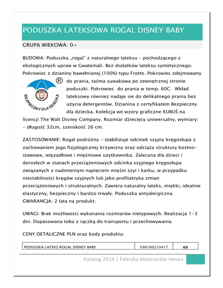 PODUSZKA LATEKSOWA ROGAL DISNEY BABY GRUPA WIEKOWA: 0+ BUDOWA: Poduszka „rogal” z naturalnego lateksu – pochodzącego z ekologicznych upraw w Gwatemali. Bez dodatków lateksu syntetycznego. Pokrowiec z dzianiny bawełnianej (100%) typu Frotte. Pokrowiec zdejmowany do prania, taśma suwakowa po zewnętrznej stronie poduszki. Pokrowiec do prania w temp. 60C. Wkład lateksowy równiez nadaje sie do delikatnego prania bez użycia detergentów. Dzianina z certyfikatem Bezpieczny dla dziecka. Kolekcja we wzory graficzne KUBUŚ na licencji The Walt Disney Company. Rozmiar dziecięcy uniwersalny, wymiary: - długość 32cm, szerokość 26 cm. ZASTOSOWANIE: Rogal podróżny - stabilizuje odcinek szyjny kręgosłupa z zachowaniem jego fizjologicznej krzywizny oraz odciąża struktury kostnostawowe, więzadłowe i mięśniowe użytkownika. Zalecana dla dzieci i dorosłych w stanach przeciążeniowych odcinka szyjnego kręgosłupa związanych z nadmiernym napięciem mięśni szyi i karku, w przypadku niestabilności kręgów szyjnych lub jako profilaktyka zmian przeciążeniowych i strukturalnych. Zawiera naturalny lateks, miękki, idealnie elastyczny, bezpieczny i bardzo trwały. Poduszka antyalergiczna. GWARANCJA: 2 lata na produkt. UWAGI: Brak możliwości wykonania rozmiarów nietypowych. Realizacja 1-3 dni. Dopasowana toba z rączką do transportu i przechowywania. CENY DETALICZNE PLN oraz kody produktu: PODUSZKA LATEKS ROGAL DISNEY BABY 590160210417 69 Katalog 2014 | Fabryka Materaców Hevea Katalog 2014 | Fabryka Materaców Hevea