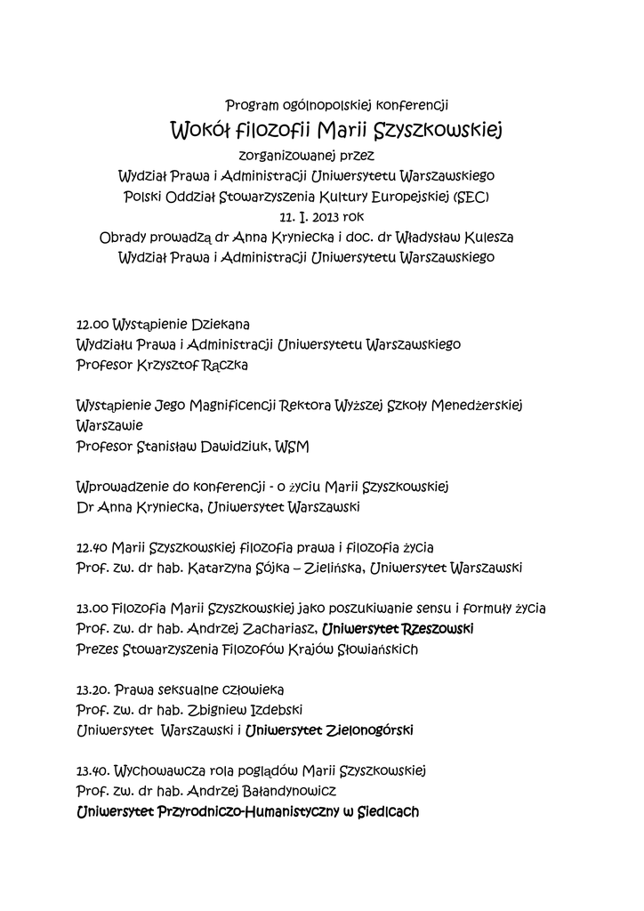 Program ogólnopolskiej konferencji Wokół filozofii Marii Szyszkowskiej zorganizowanej przez Wydział Prawa i Administracji Uniwersytetu Warszawskiego Polski Oddział Stowarzyszenia Kultury Europejskiej (SEC) 11. I. 2013 rok Obrady prowadzą dr Anna Kryniecka i doc. dr Władysław Kulesza Wydział Prawa i Administracji Uniwersytetu Warszawskiego 12.oo Wystąpienie Dziekana Wydziału Prawa i Administracji Uniwersytetu Warszawskiego Profesor Krzysztof Rączka Wystąpienie Jego Magnificencji Rektora Wyższej Szkoły Menedżerskiej Warszawie Profesor Stanisław Dawidziuk, WSM Wprowadzenie do konferencji - o życiu Marii Szyszkowskiej Dr Anna Kryniecka, Uniwersytet Warszawski 12.4o Marii Szyszkowskiej filozofia prawa i filozofia życia Prof. zw. dr hab. Katarzyna Sójka – Zielińska, Uniwersytet Warszawski 13.oo Filozofia Marii Szyszkowskiej jako poszukiwanie sensu i formuły życia Prof. zw. dr hab. Andrzej Zachariasz, Uniwersytet Rzeszowski Prezes Stowarzyszenia Filozofów Krajów Słowiańskich 13.2o. Prawa seksualne człowieka Prof. zw. dr hab. Zbigniew Izdebski Uniwersytet Warszawski i Uniwersytet Zielonogórski 13.40. Wychowawcza rola poglądów Marii Szyszkowskiej Prof. zw. dr hab. Andrzej Bałandynowicz Uniwersytet PrzyrodniczoPrzyrodniczo-Humanistyczny w Siedlcach 2 14.oo.Marii Szyszkowskiej „Zamyślenia” Doc. dr Kiejstut Szymański, Wyższa Szkoła Menedżerska we Warszawie 14.15. Elita w myśli Marii Szyszkowskiej Doc. dr Władysław Kulesza, Uniwersytet Warszawski 14.35. Znaczenie humanistycznej interpretacji Konstytucji Doc. dr Ryszard Piotrowski, Uniwersytet Warszawski 14.55. Dyskusja Przerwa na posiłek 15.3o Wkład Marii Szyszkowskiej w rozwój kultury europejskiej Eugeniusz Kabatc, Pisarz, Prezes Polskiego Oddziału Stowarzyszenia Kultury Europejskiej (SEC) 15.5o. Propozycje reform społecznych Marii Szyszkowskiej Redaktor Adam Cioch, Łódź ód 16.1o Kultura miłości Prof. dr hab. Lucjan Turos, Wszechnica Polska, Warszawa 16.3o. O Marii Szyszkowskiej filozofii farmacji Prof. dr hab. Stefan Symotiuk, UMCS, Lublin 16.5o Marii Szyszkowskiej stosunek do zwierząt Dr Jacek Andrychiewicz Wiceprzewodniczący Pacyfistycznego Stowarzyszenia, Lublin 17.1o. O humanizmie Marii Szyszkowskiej Zdzisław Łączkowski, Poeta, Redaktor, Dziennikarz, Członek SPP 17.3o. Niecodzienna filozofia codzienności Dr hab. Jacek Breczko, Uniwersytet Medyczny, Biał Białystok 3 17.50. Maria Szyszkowska o trudnej sztuce bycia w codzienności Dr Małgorzata Derc, Wyższa Wy sza Szkoł Szkoła Bankowa, Toruń Toru 18.10. Dyskusja Przerwa na kawę 18.45 Walka Marii Szyszkowskiej o prawa mniejszości w demokratycznym państwie prawnym Mecenas Piotr Lisowski, Wiceprezes Kliniki Prawno-Medycznej w Krakowie 19.05. Marii Szyszkowskiej niezgoda na świat Mecenas Agnieszka Metelska, Warszawa 19.25. Marii Szyszkowskiej idea społeczeństwa politycznego Dr Katarzyna Cwynar, Uniwersytet Rzeszowski 19.45. Znaczenie terminu tolerancja w filozofii Marii Szyszkowskiej Dr Katarzyna Karaskiewicz, ASP, Warszawa 2o.00. Maria Szyszkowska w mediach Dr Tadeusz Mędzelowski, Wyższa Szkoła Biznesu, Nowy Sącz S cz 20.15. Książka Marii Szyszkowskiej „W opozycji do przeciętności” Dr Tomasz Kozłowski, Uniwersytet Warszawski 20.30. Moja droga do filozofii Prof. zw. dr hab. Maria Szyszkowska 20.40. Dyskusja 21.15. Zamknięcie obrad Dr Anna Kryniecka, Uniwersytet Warszawski
