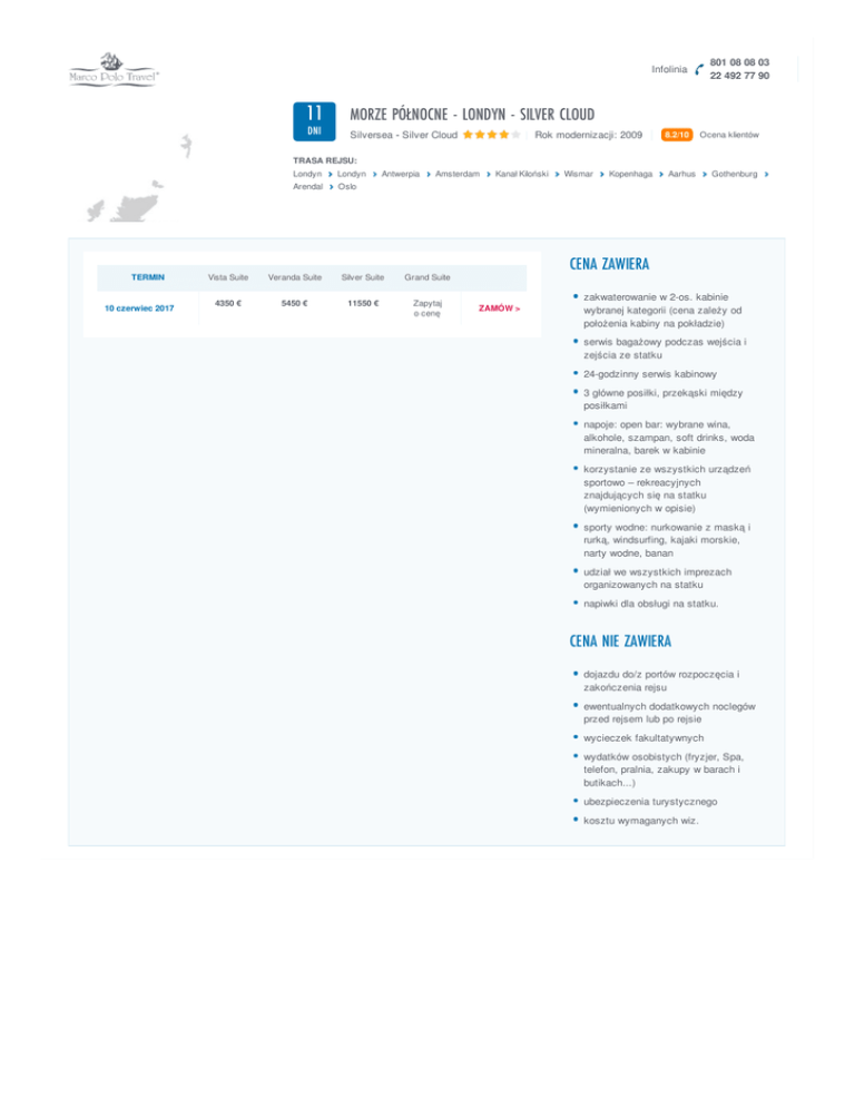 801 08 08 03 22 492 77 90 Infolinia 11 MORZE PÓŁNOCNE - LONDYN - SILVER CLOUD DNI Silversea - Silver Cloud | Rok modernizacji: 2009 | 8.2/10 Ocena klientów TRASA REJSU: TERMIN 10 czerwiec 2017 Londyn Londyn Arendal Oslo Antwerpia Amsterdam Vista Suite Veranda Suite Silver Suite Grand Suite 4350 € 5450 € 11550 € Zapytaj o cenę Kanał Kiloński Wismar Kopenhaga Aarhus Gothenburg CENA ZAWIERA ZAMÓW > zakwaterowanie w 2-os. kabinie wybranej kategorii (cena zależy od położenia kabiny na pokładzie) serwis bagażowy podczas wejścia i zejścia ze statku 24-godzinny serwis kabinowy 3 główne posiłki, przekąski między posiłkami napoje: open bar: wybrane wina, alkohole, szampan, soft drinks, woda mineralna, barek w kabinie korzystanie ze wszystkich urządzeń sportowo – rekreacyjnych znajdujących się na statku (wymienionych w opisie) sporty wodne: nurkowanie z maską i rurką, windsurfing, kajaki morskie, narty wodne, banan udział we wszystkich imprezach organizowanych na statku napiwki dla obsługi na statku. CENA NIE ZAWIERA dojazdu do/z portów rozpoczęcia i zakończenia rejsu ewentualnych dodatkowych noclegów przed rejsem lub po rejsie wycieczek fakultatywnych wydatków osobistych (fryzjer, Spa, telefon, pralnia, zakupy w barach i butikach...) ubezpieczenia turystycznego kosztu wymaganych wiz.