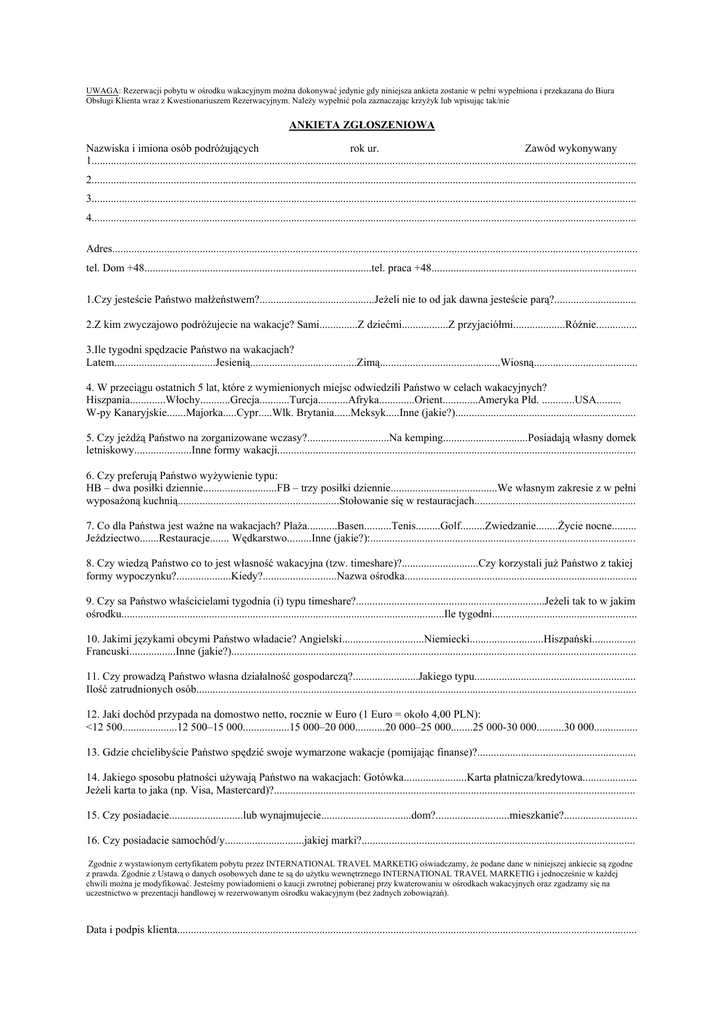 UWAGA: Rezerwacji pobytu w ośrodku wakacyjnym można dokonywać jedynie gdy niniejsza ankieta zostanie w pełni wypełniona i przekazana do Biura Obsługi Klienta wraz z Kwestionariuszem Rezerwacyjnym. Należy wypełnić pola zaznaczając krzyżyk lub wpisując tak/nie ANKIETA ZGŁOSZENIOWA Nazwiska i imiona osób podróżujących rok ur. Zawód wykonywany 1....................................................................................................................................................................................................... 2....................................................................................................................................................................................................... 3....................................................................................................................................................................................................... 4....................................................................................................................................................................................................... Adres................................................................................................................................................................................................ tel. Dom +48...................................................................................tel. praca +48........................................................................... 1.Czy jesteście Państwo małżeństwem?..........................................Jeżeli nie to od jak dawna jesteście parą?.............................. 2.Z kim zwyczajowo podróżujecie na wakacje? Sami..............Z dziećmi.................Z przyjaciółmi...................Różnie............... 3.Ile tygodni spędzacie Państwo na wakacjach? Latem.....................................Jesienią.......................................Zimą............................................Wiosną...................................... 4. W przeciągu ostatnich 5 lat, które z wymienionych miejsc odwiedzili Państwo w celach wakacyjnych? Hiszpania.............Włochy...........Grecja...........Turcja...........Afryka.............Orient.............Ameryka Płd. ............USA......... W-py Kanaryjskie.......Majorka.....Cypr.....Wlk. Brytania......Meksyk.....Inne (jakie?).................................................................. 5. Czy jeżdżą Państwo na zorganizowane wczasy?..............................Na kemping...............................Posiadają własny domek letniskowy.....................Inne formy wakacji................................................................................................................................... 6. Czy preferują Państwo wyżywienie typu: HB – dwa posiłki dziennie...........................FB – trzy posiłki dziennie.......................................We własnym zakresie z w pełni wyposażoną kuchnią...........................................................Stołowanie się w restauracjach........................................................... 7. Co dla Państwa jest ważne na wakacjach? Plaża...........Basen..........Tenis.........Golf.........Zwiedzanie........Życie nocne......... Jeździectwo.......Restauracje....... Wędkarstwo.........Inne (jakie?):................................................................................................. 8. Czy wiedzą Państwo co to jest własność wakacyjna (tzw. timeshare)?............................Czy korzystali już Państwo z takiej formy wypoczynku?....................Kiedy?...........................Nazwa ośrodka..................................................................................... 9. Czy sa Państwo właścicielami tygodnia (i) typu timeshare?.....................................................................Jeżeli tak to w jakim ośrodku......................................................................................................................Ile tygodni..................................................... 10. Jakimi językami obcymi Państwo władacie? Angielski..............................Niemiecki...........................Hiszpański................ Francuski.................Inne (jakie?).................................................................................................................................................... 11. Czy prowadzą Państwo własna działalność gospodarczą?........................Jakiego typu........................................................... Ilość zatrudnionych osób................................................................................................................................................................. 12. Jaki dochód przypada na domostwo netto, rocznie w Euro (1 Euro = około 4,00 PLN): <12 500....................12 500–15 000.................15 000–20 000...........20 000–25 000........25 000-30 000..........30 000................ 13. Gdzie chcielibyście Państwo spędzić swoje wymarzone wakacje (pomijając finanse)?.......................................................... 14. Jakiego sposobu płatności używają Państwo na wakacjach: Gotówka.......................Karta płatnicza/kredytowa.................... Jeżeli karta to jaka (np. Visa, Mastercard)?.................................................................................................................................... 15. Czy posiadacie...........................lub wynajmujecie.................................dom?...........................mieszkanie?........................... 16. Czy posiadacie samochód/y.............................jakiej marki?.................................................................................................... Zgodnie z wystawionym certyfikatem pobytu przez INTERNATIONAL TRAVEL MARKETIG oświadczamy, że po