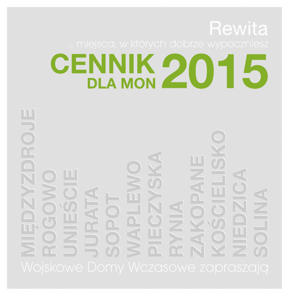Rewita WDW Międzyzdroje Cennik Wczasowy ................................................................................................................................................................................................................................................................... 1 Rewita WDW Rogowo Cennik Wczasowy .................................................................................................................................................................................................................................................................. 2 Rewita WDW Unieście Cennik Wczasowy .................................................................................................................................................................................................................................................................. 3 Rewita WDW Jurata JANTAR & DELFIN / Cennik Hotelowo-Wczasowy ............................................................................................................................................................................................. CZAJKA & ALBATROS / Cennik Wczasowy ............................................................................................................................................................................................................ KORMORAN / Cennik Wczasowy ................................................................................................................................................................................................................................ HEL / Cennik Wczasowy ..................................................................................................................................................................................................................................................... 4 5 6 7 Rewita WDW Sopot Cennik Hotelowy ...................................................................................................................................................................................................................................................................... 8 Cennik Wczasowy .................................................................................................................................................................................................................................................................. 9 Rewita WDW Waplewo Cennik Wczasowy .................................................................................................................................................................................................................................................................. 10 Rewita WDW Pieczyska Cennik Hotelowo-Wczasowy ...........................................................................................................................................................................................................................................11 Rewita WDW Rynia Cennik Hotelowo-Wczasowy ...........................................................................................................................................................................................................................................12 Rewita WDW Zakopane Cennik Wczasowy .................................................................................................................................................................................................................................................................. 13 Rewita WDW Niedzica Cennik Wczasowy .................................................................................................................................................................................................................................................................. 14 Rewita WDW Solina Cennik Wczasowy .................................................................................................................................................................................................................................................................. 15 Obozy i kolonie w Polsce Unieście / Waplewo / Solina .................................................................................................................................................................................................................................................... 16 Oferta dla emerytów i rencistów wojskowych ............................................................................................................................................................................. 17 Międzynarodowe obozy młodzieżowe Hiszpania / Włochy / Niemcy / Czechy / Polska ....................................................................................................................................................................................................... 20 Zagraniczny wypoczynek grupowy Hiszpania / Węgry / Bułgaria / Grecja / Portugalia / Włochy ......................................................................................................................................................................... 21 Zagraniczne wczasy indywidualne Austria / Niemcy / Szwajcaria / Francja / Włochy / Grecja / Czechy Hiszpania / Portugalia / Bułgaria / Rumunia / Węgry ........................................................................................................................................................................................... 22 31.01 – 30.05 26.09 – 19.12 30.05 – 27.06 29.08 – 26.09 19.12 – 02.01 95* PLN 115* PLN 125 PLN 130 PLN 86* PLN 105* PLN 118 PLN 120 PLN pok. 3-/4-os. 77* PLN 100* PLN 108 PLN 110 PLN pok. 1-os. 81* PLN 96* PLN 100 PLN 105 PLN 72* PLN 87* PLN 94 PLN 96 PLN 63* PLN 78* PLN 85 PLN 87 PLN 81* PLN 100* PLN 113 PLN 115 PLN 72* P