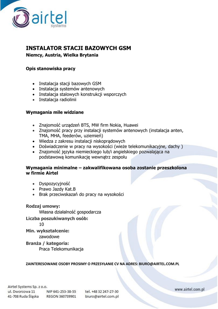 INSTALATOR STACJI BAZOWYCH GSM Niemcy, Austria, Wielka Brytania Opis stanowiska pracy Instalacja Instalacja Instalacja Instalacja stacji bazowych GSM systemów antenowych stalowych konstrukcji wsporczych radiolinii Wymagania mile widziane Znajomość urządzeń BTS, MW firm Nokia, Huawei Znajomość pracy przy instalacji systemów antenowych (instalacja anten, TMA, MHA, feederów, uziemień) Wiedza z zakresu instalacji niskoprądowych Doświadczenie w pracy na wysokości (wieże telekomunikacyjne, dachy ) Znajomość języka niemieckiego lub/i angielskiego pozwalająca na podstawową komunikację wewnątrz zespołu Wymagania minimalne – zakwalifikowana osoba zostanie przeszkolona w firmie Airtel Dyspozycyjność Prawo Jazdy Kat.B Brak przeciwskazań do pracy na wysokości Rodzaj umowy: Własna działalność gospodarcza Liczba poszukiwanych osób: 10 Min. wykształcenie: zawodowe Branża / kategoria: Praca Telekomunikacja ZAINTERESOWANE OSOBY PROSIMY O PRZESYŁANIE CV NA ADRES: [email protected]