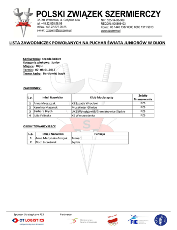 POLSKI ZWIĄZEK SZERMIERCZY 02-094 Warszawa, ul. Grójecka 65A tel. +48.22.828.58.06 tel/fax. +48.22.827.28.25 e-mail: [email protected] NIP: 525-14-08-089 REGON: 000866403 Konto: 63 1440 1387 0000 0000 1311 9813 www.pzszerm.pl LISTA ZAWODNICZEK POWOŁANYCH NA PUCHAR ŚWIATA JUNIORÓW W DIJON Konkurencja: szpada kobiet Kategoria wiekowa: junior Miejsce: Dijon Termin: 07- 08.01.2017 Trener kadry: Bartłomiej Język ZAWODNICY: L.p. 1 2 3 4 Imię i Nazwisko Anna Mroszczak Karolina Mazanek Barbara Brych Julia Falińska Klub Macierzysty KS Szpada Wrocław Muszkieter Gliwice UKS Wołodyjowski Siemianowice Śląskie KS Warszawianka OSOBY TOWARZYSZĄCE L.p. Imię i Nazwisko 1 Anna Medyńska-Tercjak 2 Piotr Szcześniak Sponsor Strategiczny PZS Partnerzy Funkcja Trener Sędzia Źródło finansowania PZS PZS PZS PZS
