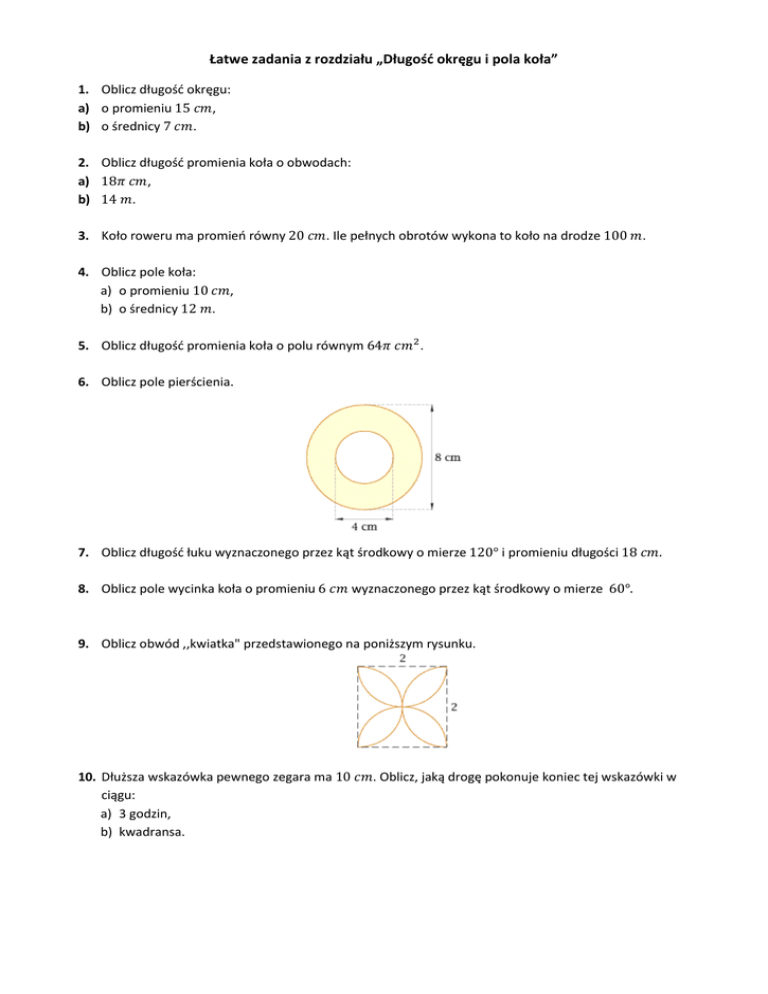 Łatwe zadania z rozdziału „Długość okręgu i pola koła” 1. Oblicz długośd okręgu: a) o promieniu , b) o średnicy . 2. Oblicz długośd promienia koła o obwodach: a) , b) . 3. Koło roweru ma promieo równy 4. Oblicz pole koła: a) o promieniu b) o średnicy . Ile pełnych obrotów wykona to koło na drodze . , . 5. Oblicz długośd promienia koła o polu równym . 6. Oblicz pole pierścienia. 7. Oblicz długośd łuku wyznaczonego przez kąt środkowy o mierze 8. Oblicz pole wycinka koła o promieniu i promieniu długości wyznaczonego przez kąt środkowy o mierze 9. Oblicz obwód ,,kwiatka" przedstawionego na poniższym rysunku. 10. Dłuższa wskazówka pewnego zegara ma ciągu: a) 3 godzin, b) kwadransa. . Oblicz, jaką drogę pokonuje koniec tej wskazówki w