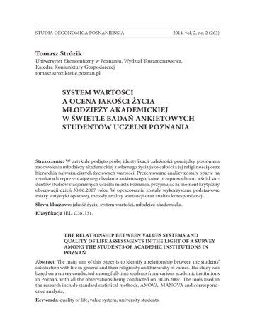STUDIA OECONOMICA POSNANIENSIA 2014, vol. 2, no. 2 (263) Tomasz Strózik Uniwersytet Ekonomiczny w Poznaniu, Wydział Towaroznawstwa, Katedra Koniunktury Gospodarczej [email protected] SYSTEM WARTOŚCI A OCENA JAKOŚCI ŻYCIA MŁODZIEŻY AKADEMICKIEJ W ŚWIETLE BADAŃ ANKIETOWYCH STUDENTÓW UCZELNI POZNANIA Streszczenie: W artykule podjęto próbę identyfikacji zależności pomiędzy poziomem zadowolenia młodzieży akademickiej z własnego życia jako całości a jej religijnością oraz hierarchią najważniejszych życiowych wartości. Prezentowane analizy zostały oparte na rezultatach reprezentatywnego badania ankietowego, które przeprowadzono wśród studentów studiów stacjonarnych uczelni miasta Poznania, przyjmując za moment krytyczny obserwacji dzień 30.06.2007 roku. W opracowaniu zostały wykorzystane podstawowe miary statystyki opisowej, metody analizy wariancji oraz analiza korespondencji. Słowa kluczowe: jakość życia, system wartości, młodzież akademicka. Klasyfikacja JEL: C38, I31. THE RELATIONSHIP BETWEEN VALUES SYSTEMS AND QUALITY OF LIFE ASSESSMENTS IN THE LIGHT OF A SURVEY AMONG THE STUDENTS OF ACADEMIC INSTITUTIONS IN POZNAŃ Abstract: The main aim of this paper is to identify a relationship between the students’ satisfaction with life in general and their religiosity and hierarchy of values. The study was based on a survey conducted among full-time students from various academic institutions in Poznań, with all the observations being conducted on 30.06.2007. The tools used in the research include standard statistical methods, ANOVA, MANOVA and correspondence analysis. Keywords: quality of life, value system, university students. 6 Tomasz Strózik Wstęp W naukach społecznych przyjmuje się powszechnie, że badania aksjologiczne pozwalają na wyjaśnienie i przewidywanie zachowań ludzi oraz całych społeczeństw poprzez identyfikację właściwych im systemów wartości. Wartościowanie jest uniwersalnym procesem wpływającym w sposób bezpośredni na podejmowane przez człowieka decyzje i prezentowane przezeń postawy. Sam proces wartościowania oznacza zarówno formułowanie sądów oceniających, jak i akceptowanie lub negowanie pewnych stanów rzeczy. Wszystkie poczynania jednostki są podyktowane preferowaniem pewnych wartości – dążeniem do tego, co dobre, słuszne bądź korzystne [Ross 1973]. Pojęcie wartości nie jest jednoznaczne, a tym samym rodzi pewne problemy w procesie badawczym. W ujęciu socjologicznym terminem wartość określa się ideę lub instytucję, przedmiot rzeczywisty lub wyimaginowany, w stosunku do których jednostki lub zbiorowości przyjmują postawę szacunku, przypisując im ważną rolę w swoim życiu, a dążenie do ich osiągnięcia odczuwają jako swoisty przymus [Szczepański 1967, s. 58]. Przez system wartości rozumiemy zazwyczaj systemy kategorii poznawczych człowieka, służące mu do opisu i oceny świata oraz stanowiące podstawę dokonywanych przezeń wyborów pomiędzy pewną liczbą stanów docelowych. Systemy te nie są kategorią uniwersalną i nie we wszystkich subpopulacjach określone cele mają taką samą ważność. Dany system wartości w dużym stopniu kształtuje się pod wpływem zindywidualizowanych potrzeb, postaw i aspiracji jednostki [Ignatczyk 2002, s. 17–22]. Kwestie systemów wartości, determinujących społeczno-ekonomiczne zachowania ludności, stanowią jeden z ważniejszych problemów teoretycznych związanych ze zrozumieniem istoty oraz z pomiarem jakości życia człowieka. Jakość życia jest pojęciem względnym, które zależy nie tylko od zakresu objętych obserwacją i pomiarem obszarów ludzkiej egzystencji, lecz również od aspektów aksjologicznych i praktykowanych w życiu systemów wartości [Borys 2004, s. 30]. Każdy człowiek dąży w życiu do pewnych wartości, które kształtują jego decyzje i determinują postawy wobec otaczającej go rzeczywistości. Tym samym indywidualna ocena jakości życia powinna uwzględniać odpowiedzi na pytania: jakiej postaci życia własnego i życia innych ludzi pragniemy oraz do jakiego kształtu ludzkiego świata i własnego życia chcemy się przyczynić [Grzegorczyk 1993, s. 96]. Wyznawane systemy wartości stanowią przesłankę do zróżnicowania percepcji jakości życia ludności przy względnie takich samych warunkach życia w ich obiektywnym ujęciu, a tym samym decydują o komplementarnym charakterze obiektywi- System wartości a ocena jakości życia młodzieży akademickiej 7 stycznych i subiektywistycznych koncepcji pomiaru tej kategorii [Campbell 1976]. Jedną z ważniejszych grup społecznych, z punktu widzenia każdego kraju, jest młodzież, a zwłaszcza ta jej część, która pozostaje na ostatnim etapie procesu kształcenia – młodzież studiująca. Szczególną rolę młodzieży akademickiej określają, jak pisze J. Piechnik-Borusowska [1998], „korelaty procesu jej funkcjonowania – […] pozorna samodzielność (»dorosłość«) nieobciążona szerszymi obowiązkami i niezmuszająca do stabilizacji psychologia »wszechobecności studentów«, względnie duża ruchliwość, obecność silnych autorytetów społecznych, swoista »otwartość« na nowe pomysły i propozycje społeczne, kulturowe i ideowe”. Młodzież stanowi też naturalny, choć nie zawsze wystarczająco doceniany, kapitał każdego społeczeństwa, a zarazem jest swoistym barometrem społecznym, który odgrywa rolę wyraziciela opinii znacznej części społeczeństwa [Wawro 2004, s. 7]. Odrębność populacji młodzieży oraz potencjał, jakim ta warstwa społeczna dysponuje w procesie tworzenia oraz przekazu dziedzictwa kulturowego i cywilizacyjnego, czynią ją istotnym podmiotem badawczym w obszarze badań nad jakością życia. Celem niniejszego artykułu jest próba identyfikacji istniejących zależności pomiędzy poziomem zadowolenia młodzieży akademickiej z życia jako całości a jej religijnością i hierar