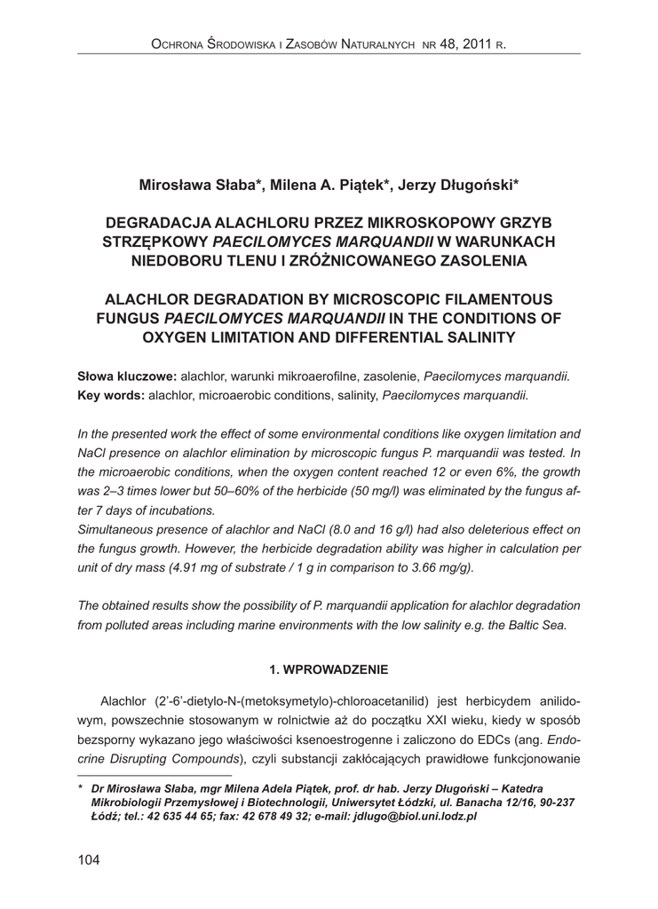 Ochrona Środowiska i Zasobów Naturalnych nr 48, 2011 r. Mirosława Słaba*, Milena A. Piątek*, Jerzy Długoński* DEGRADACJA ALACHLORU PRZEZ MIKROSKOPOWY GRZYB STRZĘPKOWY PAECILOMYCES MARQUANDII W WARUNKACH NIEDOBORU TLENU I ZRÓŻNICOWANEGO ZASOLENIA ALACHLOR DEGRADATION BY MICROSCOPIC FILAMENTOUS FUNGUS PAECILOMYCES MARQUANDII IN THE CONDITIONS OF OXYGEN LIMITATION AND DIFFERENTIAL SALINITY Słowa kluczowe: alachlor, warunki mikroaerofilne, zasolenie, Paecilomyces marquandii. Key words: alachlor, microaerobic conditions, salinity, Paecilomyces marquandii. In the presented work the effect of some environmental conditions like oxygen limitation and NaCl presence on alachlor elimination by microscopic fungus P. marquandii was tested. In the microaerobic conditions, when the oxygen content reached 12 or even 6%, the growth was 2–3 times lower but 50–60% of the herbicide (50 mg/l) was eliminated by the fungus after 7 days of incubations. Simultaneous presence of alachlor and NaCl (8.0 and 16 g/l) had also deleterious effect on the fungus growth. However, the herbicide degradation ability was higher in calculation per unit of dry mass (4.91 mg of substrate / 1 g in comparison to 3.66 mg/g). The obtained results show the possibility of P. marquandii application for alachlor degradation from polluted areas including marine environments with the low salinity e.g. the Baltic Sea. 1. WPROWADZENIE Alachlor (2’-6’-dietylo-N-(metoksymetylo)-chloroacetanilid) jest herbicydem anilidowym, powszechnie stosowanym w rolnictwie aż do początku XXI wieku, kiedy w sposób bezsporny wykazano jego właściwości ksenoestrogenne i zaliczono do EDCs (ang. Endocrine Disrupting Compounds), czyli substancji zakłócających prawidłowe funkcjonowanie * Dr Mirosława Słaba, mgr Milena Adela Piątek, prof. dr hab. Jerzy Długoński – Katedra Mikrobiologii Przemysłowej i Biotechnologii, Uniwersytet Łódzki, ul. Banacha 12/16, 90-237 Łódź; tel.: 42 635 44 65; fax: 42 678 49 32; e-mail: [email protected] 104 Degradacja alachloru przez mikroskopowy grzyb strzępkowy Paecilomyces marquandii... układu hormonalnego ludzi i zwierząt [Tessier i Clark 1995; Quiang i in. 2010]. Ksenobiotyk ten jest dobrze rozpuszczalny w wodzie (242 mg/l, w temp. 20°C), szybko przenika do wód powierzchniowych i gruntowych oraz łatwo wiąże się zarówno ze składnikami osadów dennych, jak i składnikami gleby [Fava i in. 2000; Hladik i in. 2005; 2008]. Dlatego też wciąż istnieje realne ryzyko skażenia zbiorników wodnych alachlorem oraz jego toksycznymi pochodnymi [Chirnside i in. 2007; Chang i in. 2009]. Zgodnie z dyrektywą 2008/105/EC Parlamentu i Rady Europejskiej z roku 2008 (Official Journal of the European Union L 348/84, 24.12.2008) [Dyrektywa... 2008] oraz rozporządzeniem Ministra Środowiska Rzeczypospolitej Polskiej z dnia 2 lipca 2010 r. [Rozporządzenie Ministra Środowiska... 2010] alachlor został umieszczony na liście substancji szczególnie niebezpiecznych dla środowiska wodnego, które powinny być całkowicie z niego wyeliminowane. We wcześniejszej pracy autorów wykazano, że badany przez nas mikroskopowy grzyb strzępkowy Paecilomyces marquandii, w optymalnych warunkach wzrostu, jest zdolny do efektywnej (ponad 85%) degradacji alachloru, w czasie 7 dni hodowli, przy stężeniu wyjściowym ksenobiotyku 50 mg/l. Zidentyfikowane zostały również 2 produkty wytwarzane przez badany szczep w trakcie rozkładu alachloru [Słaba i in. 2009]. W warunkach naturalnych nie zawsze można zapewnić parametry optymalne z punktu widzenia wzrostu drobnoustrojów, czy biodegradacji ksenobiotyków. U grzybów, szczególnie istotną rolę w przebiegu tych procesów odgrywa dostępność tlenu oraz zasolenie środowiska. Dlatego w prezentowanej pracy sprawdzono, jaki wpływ na wysoką zdolność degradacyjną Paecilomyces marquandii ma ograniczenie dostępu tlenu oraz zwiększone zasolenie hodowli, spowodowane wprowadzeniem do badanych układów NaCl. 2. MATERIAŁY I METODY Drobnoustrój. W badaniach użyto mikroskopowy grzyb strzępkowy Paecilomyces marquandii (Ascomycota), wchodzący w skład kolekcji szczepów Katedry Mikrobiologii Przemysłowej i Biotechnologii Uniwersytetu Łódzkiego, oznaczony numerem IM 6003. Szczep ten został uprzednio wyizolowany z odpadów poflotacyjnych huty metali nieżelaznych. Odczynniki. Alachlor (2’-6’-dietylo-N-(metoksymetylo)-chloroacetanilid) (Fluka) wprowadzano do hodowli w postaci stężonego roztworu etanolowego (10 mg/ml, w 96% alkoholu etylowym). NaCl (POCH) dodawano do hodowli w postaci uprzednio wyjałowianego, stężonego roztworu wodnego (250 mg/ml). Do ekstrakcji używano octanu etylu (POCH), a do odwadniania prób bezwodny siarczan sodu (Chempur). Zarówno w czasie przygotowywania prób, jak i do analizy chromatograficznej, stosowano rozpuszczalniki organiczne: metanol i acetonitryl (Baker). 105 Mirosława Słaba, Milena Adela Piątek, Jerzy Długoński Hodowle P. marquandii z dodatkiem alachloru w warunkach deficytu tlenu i/lub w obecności NaCl. Zarodniki pochodzące z hodowli 7-, 10-dniowych, na skosach ZT, zmywano podłożem grzybowym Sabouraud. Zawiesinę zarodników, pozbawioną resztek grzybni, inkubowano w temperaturze 28°C w kolbach stożkowych o objętości 100 ml na wytrząsarce obrotowej (160 obr/min.). Po 24 godzinach pasażowano homogenną grzybnię (15% objętości) do nowej porcji podłoża i inkubowano przez kolejne 24 godziny. Szczegółowy tok przygotowania hodowli P. marquandii opisano we wcześniejszych pracach autorów [Słaba i Długoński 2004; Słaba i in. 2009; 2010]. Następnie do kolb z podłożem Sabouraud dodawano 0,1 ml stężonego roztworu alachloru, aby uzyskać w hodowlach wyjściowe stężenie herbicydu 50 mg/l i/lub odpowiednią objętość roztworu NaCl oraz inokulum (15%). Jednocześnie zakładano kontrole biotyczne, zawierające podłoże i inokulum, oraz kontrole abiotyczne, z samym podłożem i alachlorem lub pod