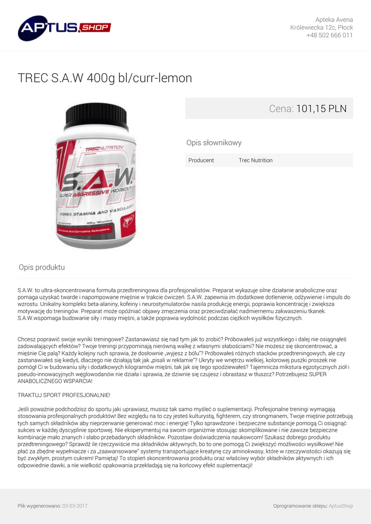 Apteka Avena Królewiecka 12c, Płock +48 502 666 011 TREC S.A.W 400g bl/curr-lemon Cena: 101,15 PLN Opis słownikowy Producent Trec Nutrition Opis produktu S.A.W. to ultra-skoncentrowana formuła przedtreningowa dla profesjonalistów. Preparat wykazuje silne działanie anaboliczne oraz pomaga uzyskać twarde i napompowane mięśnie w trakcie ćwiczeń. S.A.W. zapewnia im dodatkowe dotlenienie, odżywienie i impuls do wzrostu. Unikalny kompleks beta-alaniny, kofeiny i neurostymulatorów nasila produkcję energii, poprawia koncentrację i zwiększa motywację do treningów. Preparat może opóźniać objawy zmęczenia oraz przeciwdziałać nadmiernemu zakwaszeniu tkanek. S.A.W.wspomaga budowanie siły i masy mięśni, a także poprawia wydolność podczas ciężkich wysiłków fizycznych. Chcesz poprawić swoje wyniki treningowe? Zastanawiasz się nad tym jak to zrobić? Próbowałeś już wszystkiego i dalej nie osiągnąłeś zadowalających efektów? Twoje treningi przypominają nierówną walkę z własnymi słabościami? Nie możesz się skoncentrować, a mięśnie Cię palą? Każdy kolejny ruch sprawia, że dosłownie „wyjesz z bólu”? Próbowałeś różnych stacków przedtreningowych, ale czy zastanawiałeś się kiedyś, dlaczego nie działają tak jak „pisali w reklamie”? Ukryty we wnętrzu wielkiej, kolorowej puszki proszek nie pomógł Ci w budowaniu siły i dodatkowych kilogramów mięśni, tak jak się tego spodziewałeś? Tajemnicza mikstura egzotycznych ziół i pseudo-innowacyjnych węglowodanów nie działa i sprawia, że dziwnie się czujesz i obrastasz w tłuszcz? Potrzebujesz SUPER ANABOLICZNEGO WSPARCIA! TRAKTUJ SPORT PROFESJONALNIE! Jeśli poważnie podchodzisz do sportu jaki uprawiasz, musisz tak samo myśleć o suplementacji. Profesjonalne treningi wymagają stosowania profesjonalnych produktów! Bez względu na to czy jesteś kulturystą, fighterem, czy strongmanem, Twoje mięśnie potrzebują tych samych składników aby nieprzerwanie generować moc i energię! Tylko sprawdzone i bezpieczne substancje pomogą Ci osiągnąć sukces w każdej dyscyplinie sportowej. Nie eksperymentuj na swoim organizmie stosując skomplikowane i nie zawsze bezpieczne kombinacje mało znanych i słabo przebadanych składników. Pozostaw doświadczenia naukowcom! Szukasz dobrego produktu przedtreningowego? Sprawdź ile rzeczywiście ma składników aktywnych, bo to one pomogą Ci zwiększyć możliwości wysiłkowe! Nie płać za zbędne wypełniacze i za „zaawansowane” systemy transportujące kreatynę czy aminokwasy, które w rzeczywistości okazują się być zwykłym, prostym cukrem! Pamiętaj! To stopień skoncentrowania produktu oraz właściwy wybór składników aktywnych i ich odpowiednie dawki, a nie wielkość opakowania przekładają się na końcowy efekt suplementacji! Plik wygenerowano: 03-03-2017 Oprogramowanie sklepu: AptusShop Apteka Avena Królewiecka 12c, Płock +48 502 666 011 SKONCENTROWANA SIŁA Chcesz aby Twoje mięśnie były większe i mocniejsze, a ruchy szybsze, silniejsze i bardziej precyzyjne? Chcesz oko w oko stanąć ze swoimi słabościami i maksymalnie wykorzystać tkwiący w twoim organizmie potencjał? Wypróbuj S.A.W. – najsilniejszy stack przedtreningowy jaki kiedykolwiek powstał w laboratoriach TREC NUTRITION. Wyostrz swoje zmysły! Poczuj niesamowity przypływ energii i otwórz się na zupełnie nowe doznania treningowe. Od teraz Twój mózg uzyska absolutną kontrolę nad pracą mięśni! Przenieś swoje ćwiczenia na najwyższy poziom intensywności, o którym wcześniej nawet nie myślałeś. Zamień zwykły trening na SUPER ANABOLIC WORKOUT! ABSOLUTNA SYNERGIA, TYLKO SPRAWDZONE SKŁADNIKI S.A.W. to formuła łącząca wyłącznie przebadane, bezpieczne i skuteczne substancje czynne, które pomogą Ci przezwyciężyć zastój treningowy już po pierwszym użyciu. Niezwykle wysoka koncentracja składników aktywnych nadaje suplementacji przedtreningowej zupełnie nowy wymiar. S.A.W. to czysta esencja wspomagania – produkt wolny od zbędnych cukrów, dodatków i wypełniaczy. Oszałamiająco wysoki stopień koncentracji (blisko 96% receptury preparatu to substancje czynne) i najwyższej jakości surowce sprawiają, że każda 5 g miarka preparatu kryje w sobie olbrzymi potencjał anaboliczny i ergogeniczny. Synergistycznie działające składniki produktu drastycznie zwiększają możliwości organizmu do pracy pod dużym obciążeniem. Dzięki czemu nie tylko możesz trenować dłużej i intensywniej, ale także twój wysiłek przyniesie o wiele lepsze rezultaty. Aktywująca główne szlaki anaboliczne formuła preparatu pomoże Ci w szybkim czasie zbudować wysokiej jakości zdolne do podejmowania ciężkiej pracy mięśnie i to bez ryzyka zbędnego otłuszczenia. SUPER Pump Vasodilators Zaawansowany matrix niezwykle silnych boosterów tlenku azotu (NO), których działanie wielokrotnie potwierdzono w badaniach naukowych. Odpowiednie dawki Alfa-Ketoglutaranu i Jabłczanu L-Argininy w połączeniu z Jabłczanem Cytruliny szybko zwiększają syntezę NO w organizmie. Aby maksymalnie wykorzystać drzemiący w tych składnikach potencjał do produktu dodano ViNitrox™ – opatentowany ekstrakt z jabłek i winogron. Zawarte w nim naturalne roślinne polifenole aktywują enzym nadzorujący produkcję tlenku azotu w organizmie. Dzięki czemu zwiększa się jej wydajność, powstaje więcej NO i wydłuża się jego aktywność. Efekt tego działania obserwowany jest już od samego początku ćwiczeń, a pełna waskularyzacja nie zanika i utrzymuje się o wiele dłużej niż w przypadku innych preparatów. Przez cały trening mięśnie są lepiej ukrwione i nieustannie otrzymują niezbędne do pracy składniki odżywcze oraz tlen. ANABOLIC Energy Maximizer To specjalna receptura składników maksymalizujących wytwarzanie energii w trakcie długotrwałych i ciężkich ćwiczeń. Wysoka dawka Beta-Alaniny przeciwdziała przedwczesne