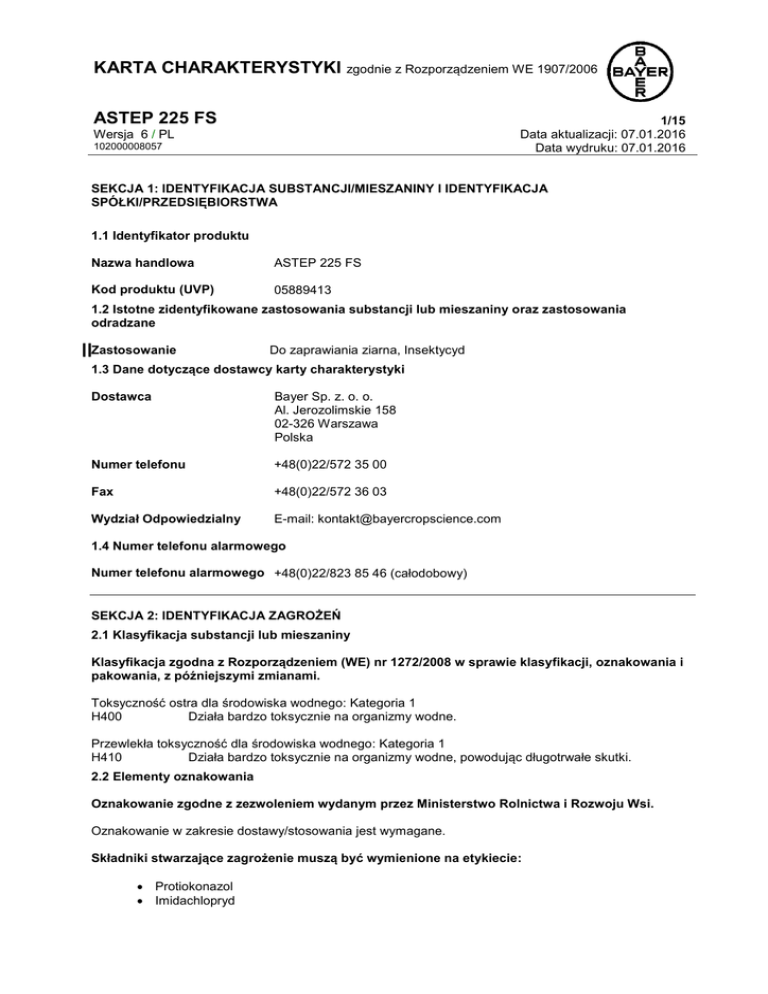 KARTA CHARAKTERYSTYKI zgodnie z Rozporządzeniem WE 1907/2006 ASTEP 225 FS 1/15 Data aktualizacji: 07.01.2016 Data wydruku: 07.01.2016 Wersja 6 / PL 102000008057 SEKCJA 1: IDENTYFIKACJA SUBSTANCJI/MIESZANINY I IDENTYFIKACJA SPÓŁKI/PRZEDSIĘBIORSTWA 1.1 Identyfikator produktu Nazwa handlowa ASTEP 225 FS Kod produktu (UVP) 05889413 1.2 Istotne zidentyfikowane zastosowania substancji lub mieszaniny oraz zastosowania odradzane Zastosowanie Do zaprawiania ziarna, Insektycyd 1.3 Dane dotyczące dostawcy karty charakterystyki Dostawca Bayer Sp. z. o. o. Al. Jerozolimskie 158 02-326 Warszawa Polska Numer telefonu +48(0)22/572 35 00 Fax +48(0)22/572 36 03 Wydział Odpowiedzialny E-mail: [email protected] 1.4 Numer telefonu alarmowego Numer telefonu alarmowego +48(0)22/823 85 46 (całodobowy) SEKCJA 2: IDENTYFIKACJA ZAGROŻEŃ 2.1 Klasyfikacja substancji lub mieszaniny Klasyfikacja zgodna z Rozporządzeniem (WE) nr 1272/2008 w sprawie klasyfikacji, oznakowania i pakowania, z późniejszymi zmianami. Toksyczność ostra dla środowiska wodnego: Kategoria 1 H400 Działa bardzo toksycznie na organizmy wodne. Przewlekła toksyczność dla środowiska wodnego: Kategoria 1 H410 Działa bardzo toksycznie na organizmy wodne, powodując długotrwałe skutki. 2.2 Elementy oznakowania Oznakowanie zgodne z zezwoleniem wydanym przez Ministerstwo Rolnictwa i Rozwoju Wsi. Oznakowanie w zakresie dostawy/stosowania jest wymagane. Składniki stwarzające zagrożenie muszą być wymienione na etykiecie: Protiokonazol Imidachlopryd KARTA CHARAKTERYSTYKI zgodnie z Rozporządzeniem WE 1907/2006 ASTEP 225 FS 2/15 Data aktualizacji: 07.01.2016 Data wydruku: 07.01.2016 Wersja 6 / PL 102000008057 Hasło ostrzegawcze: Uwaga Zwroty wskazujące rodzaj zagrożenia H410 EUH401 EUH208 Działa bardzo toksycznie na organizmy wodne, powodując długotrwałe skutki. W celu uniknięcia zagrożeń dla zdrowia ludzi i środowiska, należy postępować zgodnie z instrukcją użycia. Zawiera 2-[2-(1-Chlorocyklopropylo)-2-hydroksy-3-fenylopropylo]-2,4-dihydro-3H-1,2,4triazolo-3-tion. Może powodować wystąpienie reakcji alergicznej. Zwroty wskazujące środki ostrożności P280 Stosować rękawice ochronne/odzież ochronną. 2.3 Inne zagrożenia Inne zagrożenia nie są znane. SEKCJA 3: SKŁAD/INFORMACJA O SKŁADNIKACH 3.2 Mieszaniny Charakterystyka chemiczna Płynny koncentrat do zaprawiania nasion (FS) Imidachlopryd 175 g/l, Protiokonazol 50 g/l Składniki stwarzające zagrożenie Zwroty wskazujące rodzaj zagrożenia zgodnie z Rozporządzeniem WE 1272/2008 Nazwa Imidachlopryd Nr CAS / Nr WE / Nr rejestracji REACH 138261-41-3 428-040-8 Klasyfikacja Rozporządzenie (WE) NR 1272/2008 Acute Tox. 4, H302 Aquatic Acute 1, H400 Aquatic Chronic 1, H410 Aquatic Acute 1, H400 Aquatic Chronic 1, H410 Aquatic Chronic 3, H412 Stężenie [%] 15,1 Protiokonazol 178928-70-6 4,31 Sulfonian poliarylofenyloeteru, sól amonowa Gliceryna / Glicerol 119432-41-6 56-81-5 200-289-5 Nie sklasyfikowany >1 Mieszanina poreakcyjna 5-chloro-2-metylo-4- 55965-84-9 Acute Tox. 3, H331 Acute Tox. 3, H311 ≥ 0,0002 i ≤ 0,0015 > 1 i < 25 KARTA CHARAKTERYSTYKI zgodnie z Rozporządzeniem WE 1907/2006 ASTEP 225 FS 3/15 Data aktualizacji: 07.01.2016 Data wydruku: 07.01.2016 Wersja 6 / PL 102000008057 izotiazolin-3-onu [nr WE 247-500-7] i 2-metylo-2Hizotiazol-3-onu [nr WE 220-239-6] (3:1) Acute Tox. 3, H301 Skin Sens. 1, H317 Skin Corr. 1B, H314 Aquatic Acute 1, H400 Aquatic Chronic 1, H410 Dalsze informacje Imidachlopryd Protiokonazol 138261-41-3 178928-70-6 Współczynnik M: 10 (acute), 10 (chronic) Współczynnik M: 10 (acute) Pełny tekst zwrotów H przytoczonych w tej Sekcji znajduje się w Sekcji 16. SEKCJA 4: ŚRODKI PIERWSZEJ POMOCY 4.1 Opis środków pierwszej pomocy Porady ogólne Usunąć z zagrożonej strefy. Ułożyć i transportować poszkodowanego w stabilnej pozycji (bocznej ustalonej). Natychmiast zdjąć całą zanieczyszczoną odzież i usunąć w bezpieczny sposób. W przypadku awarii lub jeżeli źle się poczujesz, niezwłocznie zasięgnij porady lekarza – jeżeli to możliwe, pokaż etykietę. Wdychanie Przenieść na świeże powietrze. Zapewnić poszkodowanemu ciepło i spokój. Natychmiast wezwać lekarza lub powiadomić ośrodek toksykologiczny. Kontakt ze skórą Dokładnie zmyć dużą ilością wody z mydłem, jeżeli to możliwe z glikolem polietylenowym 400, a następnie spłukać wodą. Jeśli objawy utrzymują się, wezwać lekarza. Kontakt z oczami Natychmiast płukać dużą ilością wody, także pod powiekami przynajmniej przez 15 minut. Usunąć soczewki kontaktowe, jeżeli są obecne, po pierwszych 5 minutach, potem kontynuować płukanie oczu. Uzyskać pomoc medyczną w przypadku pojawienia się i utrzymywania podrażnienia. Połknięcie Wypłukać usta. NIE prowokować wymiotów. Natychmiast wezwać lekarza lub powiadomić ośrodek toksykologiczny. 4.2 Najważniejsze ostre i opóźnione objawy oraz skutki narażenia Objawy Jeśli doszło do połknięcia dużych ilości, mogą wystąpić następujące objawy: zawroty głowy, ból brzucha, mdłości KARTA CHARAKTERYSTYKI zgodnie z Rozporządzeniem WE 1907/2006 ASTEP 225 FS 4/15 Data aktualizacji: 07.01.2016 Data wydruku: 07.01.2016 Wersja 6 / PL 102000008057 4.3 Wskazania dotyczące wszelkiej natychmiastowej pomocy lekarskiej i szczególnego postępowania z poszkodowanym Pierwsza pomoc Leczenie objawowe. Wymagane monitorowanie funkcji oddechowych i krążenia. Płukanie żołądka powinno być brane pod uwagę w ciągu pierwszej godziny (lub pierwszych dwóch godzin) w przypadku przyjęcia dużych dawek. Mimo to zalecane jest podanie węgla aktywowanego i siarczanu sodu. Nie ma specyficznego antidotum. SEKCJA 5: POSTĘPOWANIE W PRZYPADKU POŻARU 5.1 Środki gaśnicze Odpowiednie Rozproszony strumień wodny, dwutlenek węgla (CO2), piana, piasek Niewłaściwe Silny strumień wody 5.2 Szczególne zagrożenia związane z substancją lub mieszaniną W razie pożaru mogą uwalniać si