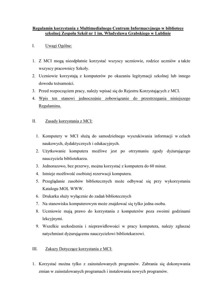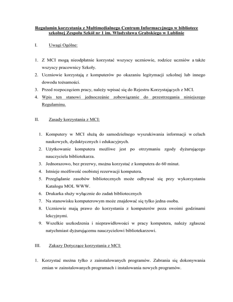 Regulamin korzystania z Multimedialnego Centrum Informacyjnego w bibliotece szkolnej Zespołu Szkół nr 1 im. Władysława Grabskiego w Lublinie I. Uwagi Ogólne: 1. Z MCI mog nieodpłatnie korzysta wszyscy uczniowie, rodzice uczniów a tak e wszyscy pracownicy Szkoły. 2. Uczniowie korzystaj z komputerów po okazaniu legitymacji szkolnej lub innego dowodu to samo ci. 3. Przed rozpocz ciem pracy, nale y wpisa si do Rejestru Korzystaj cych z MCI. 4. Wpis ten stanowi jednocze nie zobowi zanie do przestrzegania niniejszego Regulaminu. II. Zasady korzystania z MCI: 1. Komputery w MCI słu do samodzielnego wyszukiwania informacji w celach naukowych, dydaktycznych i edukacyjnych. 2. U ytkowanie komputera mo liwe jest po otrzymaniu zgody dy uruj cego nauczyciela bibliotekarza. 3. Jednorazowo, bez przerwy, mo na korzysta z komputera do 60 minut. 4. Istnieje mo liwo osobistej rezerwacji komputera. 5. Przegl danie zasobów bibliotecznych mo e odbywa si przy wykorzystaniu Katalogu MOL WWW. 6. Drukarka słu y wył cznie do zada bibliotecznych 7. Na stanowisku komputerowym mo e znajdowa si tylko jedna osoba. 8. Uczniowie maj prawo do korzystania z komputerów poza swoimi godzinami lekcyjnymi. 9. Wszelkie uszkodzenia i nieprawidłowo ci w pracy komputera, nale y zgłasza natychmiast dy uruj cemu nauczycielowi bibliotekarzowi. III. Zakazy Dotycz ce korzystania z MCI: 1. Korzysta mo na tylko z zainstalowanych programów. Zabrania si dokonywania zmian w zainstalowanych programach i instalowania nowych programów. 2. Nie wolno wykonywa adnych poł cze technicznych bez zgody bibliotekarza (np. wł cza i rozł cza kabli zasilaj cych, wył cza komputera). 3. U ytkownicy maj zachowa cisz , nie wolno im wnosi na stanowiska komputerowe jedzenia i picia, zmiennego obuwia oraz odzie y wierzchniej. 4. Komputerów zainstalowanych w MCI nie mo na wykorzystywa do prowadzenia prywatnej korespondencji, gier, zabaw oraz do u ytkowania wszelkich komunikatorów. 5. W przypadku nieprzestrzegania przez u ytkownika postanowie niniejszego Regulaminu nauczyciel bibliotekarz ma prawo do natychmiastowego przerwania pracy u ytkownika. 6. Niestosowanie si do Regulaminu powoduje ograniczenie lub pozbawienie prawa do korzystania z komputerów w bibliotece oraz zobowi zuje do naprawienia wyrz dzonych szkód. IV. Zasady Bezpiecze stwa i Higiena Pracy przy korzystaniu z MCI 1. Przed dopuszczeniem do korzystania z MCI, dy uruj cy nauczyciel bibliotekarz ma obowi zek: • Sprawdzi , czy stan stanowisk komputerowych, zewn trznej instalacji elektrycznej, okablowania, a tak e inne warunki rodowiska pracy nie stanowi zagro enia dla bezpiecze stwa u ytkowników. • Dba o wła ciwe o wietlenie stanowisk komputerowych, ład i porz dek w pomieszczeniu MCI oraz dro no • Nadzorowa dróg ewakuacyjnych. korzystanie przez u ytkowników udost pnionych stanowisk komputerowych. • Reagowa na niewła ciwe zachowanie u ytkowników. • Niezwłocznie przerwa korzystanie z komputerów, je eli powstanie stan zagro enia, awaria lub spadek napi cia. • Po zako czeniu dy uru przekaza obejmuj cemu dy ur nauczycielowi – bibliotekarzowi uwagi i spostrze enia o pracy MCI. • Po zako czeniu pracy wył czy sprawdzi ich stan oraz zamkn wszystkie stanowiska komputerowe, pomieszczenie biblioteki szkolnej. 2. Podczas korzystania z komputerów u ytkownikom nie wolno: • Wykonywa poł cze technicznych bez zgody nauczyciela bibliotekarza (np. wł cza i wył cza kabli zasilaj cych, wył cza komputera, samodzielnie usuwa usterek i awarii). • Przemieszcza i przenosi sprz tu. V. Uwagi ko cowe 1. Korzystaj cy z MCI, ma obowi zek niezwłocznego poinformowania nauczyciela bibliotekarza o doznanych urazach lub wypadku, które zdarzyły si podczas u ytkowania komputera. 2. Korzystaj cy z komputerów maj obowi zek szanowania udost pnionego sprz tu oraz oprogramowania. 3. Korzystaj cy z komputerów ponosz odpowiedzialno za wszelkie straty powstałe z ich winy. Je eli ucze jest niepełnoletni, wówczas odpowiedzialno ponosz rodzice lub opiekunowie. 4. W pomieszczeniu MCI, w widocznym i łatwo dost pnym miejscu wywieszona jest „Instrukcja bhp przy obsłudze komputera i drukarki”.