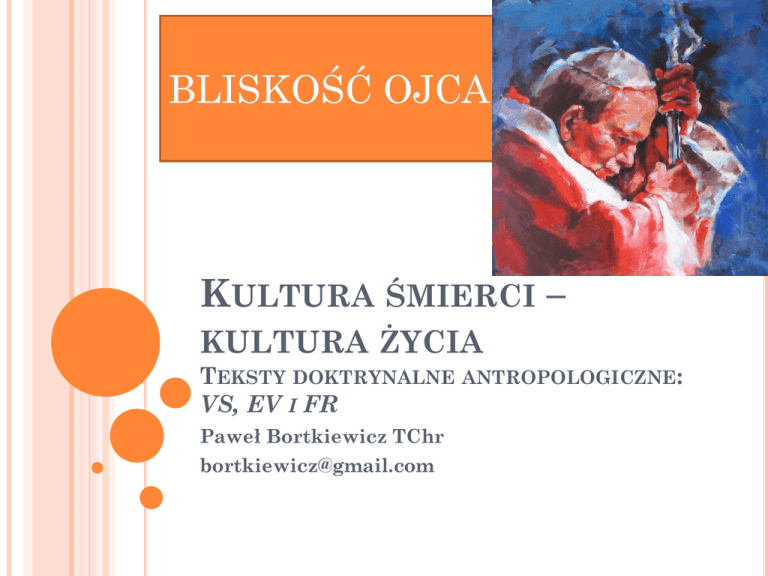 BLISKOŚĆ OJCA KULTURA ŚMIERCI – KULTURA ŻYCIA TEKSTY DOKTRYNALNE ANTROPOLOGICZNE: VS, EV I FR Paweł Bortkiewicz TChr [email protected] postęp nauki i techniki początek nowym formom zamachów na godność ludzkiej istoty. usprawiedliwianie przestępstwa przeciw życiu w imię prawa do indywidualnej wolności kryzys moralny (por. n. 4) wiele państw sankcjonuje czyny przestępcze wielu lekarzy dokonuje czynów sprzecznych z ich powołaniem = bardzo „groźny i niepokojący jest fakt, że nawet ludzkie sumienie zostaje jak gdyby zaćmione […] w sprawach dotyczących fundamentalnej wartości ludzkiego życia” (por. n. 4). KULTURA ŚMIERCI AKTUALNE ZAGROŻENIA ŻYCIA LUDZKIEGO źródła biblijne: tajemnica śmierci w stworzonym przez Boga świecie zawiść ze strony diabła (por. Rdz 3, 1. 4-5) zabójstwo Abla przez Kaina (por. Rdz 4, 2-16) eskalacja zła zło szerzy się z przerażającą szybkością: do buntu człowieka przeciw Bogu w rajskim ogrodzie, dołącza się śmiertelna walka człowieka przeciw człowiekowi (por. n. 8) AKTUALNE ZAGROŻENIA ŻYCIA LUDZKIEGO kto podnosi rękę na życie człowieka, podnosi niejako rękę na samego Boga zabójcza przemoc całkowicie odmienia środowisko życia człowieka samotność i oddalenie od Boga (por. n. 9). AKTUALNE ZAGROŻENIA ŻYCIA LUDZKIEGO reakcja Boga po czynie Kaina kara dialog przypomnienie wolności wobec zła: człowiek może zapanować nad grzechem AKTUALNE ZAGROŻENIA ŻYCIA LUDZKIEGO SFERA ZJAWISKA przykłady zachowań przeciwko życiu wojny, masowe mordy, niebezpieczeństwo głodu, plaga niedożywienia, handel bronią, zasiew śmierci na skutek handlu narkotykami „przez propagowanie wzorców zachowań w dziedzinie życia płciowego, które nie tylko są moralnie nie do przyjęcia, ale rodzą także poważne niebezpieczeństwa dla życia” AKTUALNE ZAGROŻENIA ŻYCIA LUDZKIEGO SFERA ZJAWISKA „mentalność antykoncepcyjna” • zamykając się na nowe życie, promuje hedonistyczne i egoistyczne postawy • życie staje się „wrogiem”, którego trzeba bezwzględnie unikać (por. n. 13) AKTUALNE ZAGROŻENIA ŻYCIA LUDZKIEGO SFERA ZJAWISKA techniki sztucznej reprodukcji możliwość nowych zamachów na życie: „embriony nadliczbowe” zabijane lub utylizowane badania prenatalne mogą prowadzić do aborcji eugenicznej powszechne dzieciobójstwo powrót do epoki barbarzyństwa (por. n. 14). AKTUALNE ZAGROŻENIA ŻYCIA LUDZKIEGO SFERA ZJAWISKA sytuacja człowieka nieuleczalnie chorego i umierającego w społeczeństwie, któremu trudno przyjąć i znosić cierpienie wielu ludzi pod wpływem atmosfery kulturowej nie dostrzega żadnego znaczenia czy wartości cierpienia brak im też motywacji religijnej pokusa eutanazji (por. n. 15) AKTUALNE ZAGROŻENIA ŻYCIA LUDZKIEGO SFERA ZJAWISKA przemiany demograficzne gwałtowny spadek urodzin w bogatych krajach, w krajach ubogich polityka antynatalistyczna (por. n. 16) nowe zamachy na życie - w XX wieku masowe = „spisek przeciw życiu” udział środków społecznego przekazu promują stosowanie antykoncepcji, sterylizacji, aborcji i eutanazji postawę bezwarunkowej obrony życia ukazują jako wrogą wolności i postępowi (por. n. 17) AKTUALNE ZAGROŻENIA ŻYCIA LUDZKIEGO SFERA LEGALIZACJI zagrożenia przeciw życiu poczętemu lub życiu, które zbliża się do końca często nie uważane za <<przestępstwa>> nawet status <<prawa>> kryzys kultury zagubienie na polu etyki utrata rozumienia sensu ludzkiego życia, małżeństwa i rodziny AKTUALNE ZAGROŻENIA ŻYCIA LUDZKIEGO SFERA LEGALIZACJI niepewność moralna zmniejszanie odpowiedzialność poszczególnych osób • „struktury grzechu” i „kultura śmierci” • społeczeństwa anty-solidarne • „spisek przeciw życiu” - wymiar globalny AKTUALNE ZAGROŻENIA ŻYCIA LUDZKIEGO SFERA ANTROPOLOGICZNO-ETYCZNA przyczyny braku poszanowania względem życia • trudne/dramatyczne doświadczenia głębokiego cierpienia, samotności, depresji i lęku o przyszłość AKTUALNE ZAGROŻENIA ŻYCIA LUDZKIEGO SFERA ANTROPOLOGICZNO-ETYCZNA kultura sprzeczności uroczysta proklamacja nienaruszalnych praw osoby i deklaracje wartości życia prawo do życia jest łamane i deptane AKTUALNE ZAGROŻENIA ŻYCIA LUDZKIEGO SFERA ANTROPOLOGICZNO-ETYCZNA „racja siły” i złe rozumienie pojęcia wolności • absolutyzuje znaczenie jednostki ludzkiej • przekreśla jej odniesienie do solidarności z drugimi • całkowicie indywidualistyczne pojęcie wolności AKTUALNE ZAGROŻENIA ŻYCIA LUDZKIEGO SFERA ANTROPOLOGICZNO-ETYCZNA „wolność zapiera się samej siebie, zmierza do autodestrukcji i do zniszczenia drugiego człowieka, gdy przestaje uznawać i respektować konstytutywną więź, jaka łączy ją z prawdą. Człowiek przestaje być wtedy zdolny jak odróżniać dobro od zła. Gdy przyjmiemy moralny relatywizm, wtedy wszystko staje się przedmiotem umowy i negocjacji, nawet ludzkie życie, zwłaszcza to najbardziej bezbronne dzieci nienarodzonych. Pierwotne i niezbywalne prawo do życia staje się przedmiotem dyskusji lub zanegowane na mocy głosowania parlamentu. W ten sposób demokracja, sprzeniewierzając się własnym zasadom, przeradza się w istocie w system totalitarny” (por. n. 20) AKTUALNE ZAGROŻENIA ŻYCIA LUDZKIEGO SFERA TEOLOGICZNA najgłębszą przyczyną walki pomiędzy „kulturą życia” a „kulturą śmierci” - osłabienie wrażliwości na Boga i człowieka (por. n. 21 zapomina się o transcendentnym wymiarze człowieka bez odniesienia do Boga człowiek traci sens swego życia, odrzuca ideę prawdy o stworzeniu, żyje tak <<jakby Bóg nie istniał>> (por. n. 22). materializm praktyczny i utylitaryzm cierpienie w tym kontekście jest odrzucane jako bezużyteczne KULTURA ŻYCIA WYBIERAĆ „KULTURĘ ŻYCIA” Ewangelia miłości Boga do człowieka, Ewangelia godności osoby Ewangelia życia CHRZEŚCIJAŃSKIE ORĘDZIE O ŻYCIU EWANGELIA MIŁOŚCI BOGA DO CZŁOWIEKA = PRAWDA „Ewangelia życia jest 