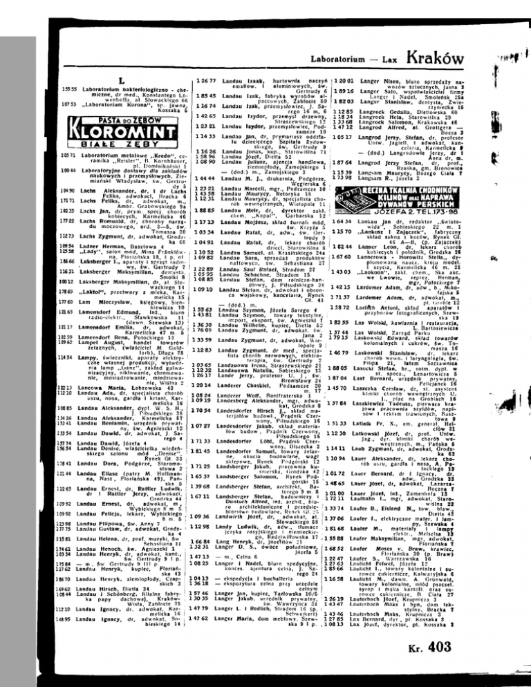 Laboratorium — Lax 1 2 6 7 7 155 55 Laboratorium bakterlologlczno - che miczne, dr med., Konstantego Löwenhoffa al. Słowackiego 66 I K A « 10753 „Laboratorium Korona", sp. jawna, 185 45 Kossaka 6 l i * 74 14265 LOROMINT 1 BIAŁE ZEBY 123 21 i 114 33 Kraków hurtownia naczyń 120 01 Unger Nlsen. biuro sprzedaży naaluminiowych, św. wozów sztucznych asna 3 w—r» " ' ^ 189 16 Unger Salo, współwłaściciel Iirmy i a t u t u , ! wsiir łahrvka wvrobów al• Langer i Nadel, Smoleńsk 25a r Landau lzak,Jąbryka^7 a °° 0 ° i e Langer Stanisław, dentysta, Zwie Landau lzak, przemysłowiec.^J^Sa^ Landau Izydor, P « « » r t - « « - - » . J»» emaliowi emanów. Q ft g 5 9 1 8 2 0 3 D l e C k a 6 0 1 6 s Landau Izydor, przemysłowiec, Podzamcze 10 Landau Jan, dr, prymarlusz oddzfalu dziecięcego Szpitala żydow skiego, łw. Oertrudy 9 Landau Jonas, kup.. Starowiślna 71 Landau Józef, Dietla 52 Landau Juliusz, ajencja handlowa, ziemiopłody. Zamojskiego 1 (dod.) m., Zamojskiego 3 Landau M. J., drukarnia, Podgórze, Węgierska 6 Landau Marceli, mgr.. Podzamcze 10 Landau Maurycy, Retoryka 18 Landau Maurycy, dr, specjalista cho rób wewnętrznych, Wielopole 11 Landau Meir, dr, dyrektor zakl. chem. „Kopal", Garbarska 12 Landau Mojżesz, skład .żurnali mód, św. Krzyża Landau Rafał, dr. adw., łw. Oer trudy 9 Landau Rafał, dr, lekarz chorób dzieci. Starowiślna 8 Landau Samuel, al. Krasińskiego 24a Landau Sara, sptzedaż produktów naitowych, sw. Sebastiana 27 Landau Sani Rafael, Stradom 27 Landau Schachne, Stradom 15 Landau Stefan, dom rolnlczo-han- 14712 Langrod Alfred, al. Grottgera — . Boczą » 110517 Langrod Jerzy, Stefan, dr Uniw. Jagiell. I adwokat, kan celaria. Karmelicka 9 — (dod.) Langrodowle Jerzy, dr I Anna dr, m. 187 64 Langrod Jerzy Stefan, dr, prof., Rzaska, gm. Bronowlct 115 39 Langsam Maurycy, Bożego Ciała 7 173 98 Langsam R., Józefa 2 116 26 20571 Laboratorium metalowa „Kredo", ce 1 58 96 ramika „Relsler", B. Kornhauser, 108 90 pl. Dominikański 1 100 44 Laboratoryjne dostawy dla zakładów naukowych i przemysłowych, Zie 144 44 miański Władysław, Św. Gertrudy 6 1 23 21 10490 Lachs Aleksander, dr, I dr Lachs 143 58 Feliks, adwokaci, Bracka 6 112 3 1 17171 Lachs Feliks, dr, adwokat, m., Ambr. Grabowskiego 9a 102 35 Lachs Jan, dr, prym. specj. chorób 188 85 kobiecych. Karmelicka 4 C' 116434 m .Jan dr, redaktor _„śwjato17722 Lachs Romuald, dr, choroby narzą 11713 wida", Sobieskiego 22 m. 1 du moczowego, ord. 3—5, św. 11570 „Lankosz I Zajączek", fabryczny Tomasza 30 103 34 skład sukna 1 koców, Rynek Ot. 112 73 Lachs Zygmunt, dr, adwokat. Grodz 46 A—B, (p. Zajączek) ka 60' 104 91 182 44 Lanner Leon, dr, lekarz chorób 10954 Ladner Herman, Basztowa 4 kobiecych i położnik, Orodzka 26 12558 „Lady", salon mód. Mina Fränklów- i 110 52 167 60 Lannerowa - Horowitz Stella,, dy na. Floriańska 18, I p. o l . [ 109 82 plomowana naucz, kroju model. 18666 Laksberger I., aparaty i sprzęt radioI szycia, Karmelicka 46 m. 21 wy, sw. Gertrudy 7 122 89 143 03 „Laokoon", zakł. chem., Ska akc. 11631 Laksberger Maksymilian, dentysta, 105 95 we Lwowie, reprez. Herman, Smolki 8 108 85 200 12 Laksberger Maksymilian, dr, al. Sło wackiego 14 10910 Landau S t e Ä Ä a Ä o n ? | « « » " e r Adam, lijska 6 17869 „Laktol", przetwory z mleka, Kar ca wojskowy, kancelaria, Rynek 117137 Lardemer Adam, dr, adwokat, m., melicka 15 Gł. 41 pl. Groble 12 177 60 Lam Mieczysław, księgowy, Sien — (dod.) m. 158 72 Lariśhh Antoni, sktad aparatów i kiewicza 10 155 63 Landau Szymon, Józefa Sarego 4 przyborów fotograllcsnych, Szew? 12165 Lamensdort Edmund, inż., biuro 143 81 Landau Szymon, towary tekstylne, ska 19 radio-elektr., Sławkowska 11 Import, eksport, łw. Agnieszki 1 (dawn. Szewsks 13) 136 30 Landau Wilhelm, kupiec, Dietla 62 182 55 Las Wolski, kawiarnia I restauracja, L. Bartosiewicza 12117 Lamensdort Emilia, dr, adwokat, 17605 Landau Zygmunt, dr, adwokat, łw. 44 Las Wolski, Zarząd Parku Karmelicka 47 m. 6 Jana 2 137 17915 Laskowski Edward, skład towarów 102 59 Lamensdort Rena, Potockiego 13 133 59 Landau Zygmunt, dr, adwokat, Wie kolonialnych I cukrów, św. To 10962 Lampel August, handel towarów lopole 9 masza 16 żelaznych, (właściciel M. Gold- 112 83 Landau Zygmunt, dr med., specja Stanisław, dr, lekarz łarb). Długa 78 lista chorób nerwowych, elektro- 146 79 Laskowski chorób wewn. 1 laryngologia, Św. 11454 Lampy, świeczniki, aparaty elektry terapia, św. Gertrudy 2 Filipa 21, latem Szczawnica czne własnej produkcji, wytwór 103 65 Landauowa Irena, Straszewskiego 21 nia lamp „Cianz", zakład galwa- 112 32 Landauowa Natalia, Sobieskiego 15 1 88 05 Lasocki Stefan, hr., rotm. dypl. w st. spocz., Lenartowicza 6 nizacyjny, niklowanie, chromowa 12617 Lande Jerzy, prolesor U. J , łw. prywatny. nie, mosiądzowanie, miedziowa Bronisławy 24 187 04 Last Bernard, urzędnikFelicjanek 16 nie, Wiślna 2 12014 Landerer Cbasklei, Podzamcze 20 145 70 Laszczka Czesław, dr, st. asystent [12213 Lancowa Maria, Łobzowska 43 kliniki chorób wewnętrznych U. . 11210 Landau Ada, dr, specjalista chorób 108 24 Landerer Wolf, Bonifraterska m.1 17 J., plac na Groblach 16 uszu, nosa, gardła I krtani. Kar 10919 Landesberg Aleksander, mgr, adwo Tadeusz, pierwsza kra melicka 16 kat, Orodzka 8 1 37 84 Laszklewfcz jowa pracownia szyldów, napi 108 85 Landau Aleksander, dypl. W. S. H., 170 54 Landesdorfer Hlrsch J., skfad ma sów I reklam trawionych. Basz J. Piłsudskiego 38 teriałów budowl., Prądnik Czer towa 9 114 26 Landau Aleksander, Karmelicka 67 Piłsudskiego 16 Hel153 41 Landau Beniamin, urzędnik prywat 107 27 Landesdorfer wony, Jakub, skład materia- i 15133 Latinlk Fr. X., em. generał. clów 21 ny, św. Agnieszki 12 łów budów., Prądnik Czerwony, Józef, dr, prof. Uniw. 13354 Landau Dawid, dr, adwokat, J. Sa Piłsudskiego 16 112 30 Latkowski Jag., dyr. kliniki chorób we; rego 4 17133 Landesdorfer Löbl, Prądnik Czer wnętrznyc