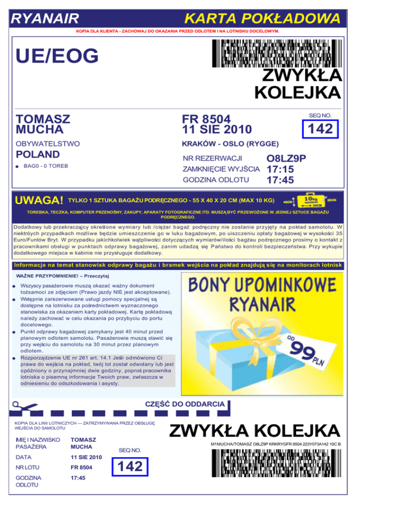 RYANAIR KARTA POKŁADOWA KOPIA DLA KLIENTA ZACHOWAJ DO OKAZANIA PRZED ODLOTEM I NA LOTNISKU DOCELOWYM. UE/EOG ZWYKŁA KOLEJKA SEQ NO. TOMASZ MUCHA FR 8504 11 SIE 2010 OBYWATELSTWO KRAKÓW OSLO (RYGGE) POLAND NR REZERWACJI l BAG0 0 TOREB ZAMKNIĘCIE WYJŚCIA GODZINA ODLOTU UWAGA! 142 O8LZ9P 17:15 17:45 TYLKO 1 SZTUKA BAGAŻU PODRĘCZNEGO 55 X 40 X 20 CM (MAX 10 KG) TOREBKA, TECZKA, KOMPUTER PRZENOŚNY, ZAKUPY, APARATY FOTOGRAFICZNE ITD. MUSZĄ BYĆ PRZEWOŻONE W JEDNEJ SZTUCE BAGAŻU PODRĘCZNEGO. Dodatkowy lub przekracząjcy określone wymiary lub /ciężar bagaż podręczny nie zostanie przyjęty na pokład samolotu. W niektróych przypadkach możliwe będzie umieszczenie go w luku bagażowym, po uiszczeniu opłaty bagażowej w wysokości 35 Euro/Funtów Bryt. W przypadku jakichkolwiek wątpliwości dotyczących wymiarów/ilości bagżau podręcznego prosimy o kontakt z pracownikami obsługi w punktach odprawy bagażowej, zanim udadzą się Państwo do kontroli bezpieczeństwa. Przy wykupie dodatkowego miejsca w kabinie nie przysługuje dodatkowy. Informacje na temat stanowisk odprawy bagażu i bramek wejścia na pokład znajdują się na monitorach lotnisk WAŻNE PRZYPOMNIENIE! – Przeczytaj Wszyscy pasażerowie muszą okazać ważny dokument tożsamoci ze zdjęciem (Prawo jazdy NIE jest akceptowane). l Wstępnie zarezerwowane usługi pomocy specjalnej są dostępne na lotnisku za pośrednictwem wyznaczonego stanowiska za okazaniem karty pokładowej. Kartę pokładową należy zachować w celu okazania po przybyciu do portu docelowego. l Punkt odprawy bagażowej zamykany jest 40 minut przed planowym odlotem samolotu. Pasażerowie muszą stawić się przy wejściu do samolotu na 30 minut przez planowym odlotem. l Rozporządzenie UE nr 261 art. 14.1 Jeśli odmówiono Ci prawa do wejścia na pokład, twój lot został odwołany lub jest opóźniony o przynajmniej dwie godziny, poproś pracownika lotniska o pisemną informacje Twoich praw, zwłaszcza w odniesieniu do odszkodowania i asysty. l CZĘŚĆ DO ODDARCIA KOPIA DLA LINII LOTNICZYCH — ZATRZYMYWANA PRZEZ OBSŁUGĘ WEJŚCIA DO SAMOLOTU IMIĘ I NAZWISKO PASAŻERA TOMASZ MUCHA DATA 11 SIE 2010 NR LOTU FR 8504 GODZINA ODLOTU 17:45 ZWYKŁA KOLEJKA M1MUCHA/TOMASZ O8LZ9P KRKRYGFR 8504 223Y073A142 10C B SEQ NO. 142 RYANAIR KARTA POKŁADOWA KOPIA DLA KLIENTA ZACHOWAJ DO OKAZANIA PRZED ODLOTEM I NA LOTNISKU DOCELOWYM. UE/EOG ZWYKŁA KOLEJKA SEQ NO. TOMASZ MUCHA FR 8503 16 SIE 2010 OBYWATELSTWO OSLO (RYGGE) KRAKÓW POLAND NR REZERWACJI l BAG0 0 TOREB ZAMKNIĘCIE WYJŚCIA GODZINA ODLOTU UWAGA! 65 O8LZ9P 14:45 15:15 TYLKO 1 SZTUKA BAGAŻU PODRĘCZNEGO 55 X 40 X 20 CM (MAX 10 KG) TOREBKA, TECZKA, KOMPUTER PRZENOŚNY, ZAKUPY, APARATY FOTOGRAFICZNE ITD. MUSZĄ BYĆ PRZEWOŻONE W JEDNEJ SZTUCE BAGAŻU PODRĘCZNEGO. Dodatkowy lub przekracząjcy określone wymiary lub /ciężar bagaż podręczny nie zostanie przyjęty na pokład samolotu. W niektróych przypadkach możliwe będzie umieszczenie go w luku bagażowym, po uiszczeniu opłaty bagażowej w wysokości 35 Euro/Funtów Bryt. W przypadku jakichkolwiek wątpliwości dotyczących wymiarów/ilości bagżau podręcznego prosimy o kontakt z pracownikami obsługi w punktach odprawy bagażowej, zanim udadzą się Państwo do kontroli bezpieczeństwa. Przy wykupie dodatkowego miejsca w kabinie nie przysługuje dodatkowy. Informacje na temat stanowisk odprawy bagażu i bramek wejścia na pokład znajdują się na monitorach lotnisk WAŻNE PRZYPOMNIENIE! – Przeczytaj Wszyscy pasażerowie muszą okazać ważny dokument tożsamoci ze zdjęciem (Prawo jazdy NIE jest akceptowane). l Wstępnie zarezerwowane usługi pomocy specjalnej są dostępne na lotnisku za pośrednictwem wyznaczonego stanowiska za okazaniem karty pokładowej. Kartę pokładową należy zachować w celu okazania po przybyciu do portu docelowego. l Punkt odprawy bagażowej zamykany jest 40 minut przed planowym odlotem samolotu. Pasażerowie muszą stawić się przy wejściu do samolotu na 30 minut przez planowym odlotem. l Rozporządzenie UE nr 261 art. 14.1 Jeśli odmówiono Ci prawa do wejścia na pokład, twój lot został odwołany lub jest opóźniony o przynajmniej dwie godziny, poproś pracownika lotniska o pisemną informacje Twoich praw, zwłaszcza w odniesieniu do odszkodowania i asysty. l CZĘŚĆ DO ODDARCIA KOPIA DLA LINII LOTNICZYCH — ZATRZYMYWANA PRZEZ OBSŁUGĘ WEJŚCIA DO SAMOLOTU IMIĘ I NAZWISKO PASAŻERA TOMASZ MUCHA DATA 16 SIE 2010 NR LOTU FR 8503 GODZINA ODLOTU 15:15 RYANAIR M1MUCHA/TOMASZ O8LZ9P RYGKRKFR 8503 228Y034B65 10C B SEQ NO. 65 ZWYKŁA KOLEJKA KARTA POKŁADOWA RYANAIR KARTA POKŁADOWA KOPIA DLA KLIENTA ZACHOWAJ DO OKAZANIA PRZED ODLOTEM I NA LOTNISKU DOCELOWYM. UE/EOG ZWYKŁA KOLEJKA SEQ NO. KAMILA STOKOWIEC FR 8504 11 SIE 2010 OBYWATELSTWO KRAKÓW OSLO (RYGGE) POLAND NR REZERWACJI l BAG0 0 TOREB ZAMKNIĘCIE WYJŚCIA GODZINA ODLOTU UWAGA! 143 O8LZ9P 17:15 17:45 TYLKO 1 SZTUKA BAGAŻU PODRĘCZNEGO 55 X 40 X 20 CM (MAX 10 KG) TOREBKA, TECZKA, KOMPUTER PRZENOŚNY, ZAKUPY, APARATY FOTOGRAFICZNE ITD. MUSZĄ BYĆ PRZEWOŻONE W JEDNEJ SZTUCE BAGAŻU PODRĘCZNEGO. Dodatkowy lub przekracząjcy określone wymiary lub /ciężar bagaż podręczny nie zostanie przyjęty na pokład samolotu. W niektróych przypadkach możliwe będzie umieszczenie go w luku bagażowym, po uiszczeniu opłaty bagażowej w wysokości 35 Euro/Funtów Bryt. W przypadku jakichkolwiek wątpliwości dotyczących wymiarów/ilości bagżau podręcznego prosimy o kontakt z pracownikami obsługi w punktach odprawy bagażowej, zanim udadzą się Państwo do kontroli bezpieczeństwa. Przy wykupie dodatkowego miejsca w kabinie nie przysługuje dodatkowy. Informacje na temat stanowisk odprawy bagażu i bramek wejścia na pokład znajdują się na monitorach lotnisk WAŻNE PRZYPOMNIENIE! – Przeczytaj Wszyscy pasażerowie muszą okazać ważny dokument tożsamoci ze zdjęciem (Prawo jazdy NIE jest akceptowane). l Wstępnie zarezerwowane usługi pomo