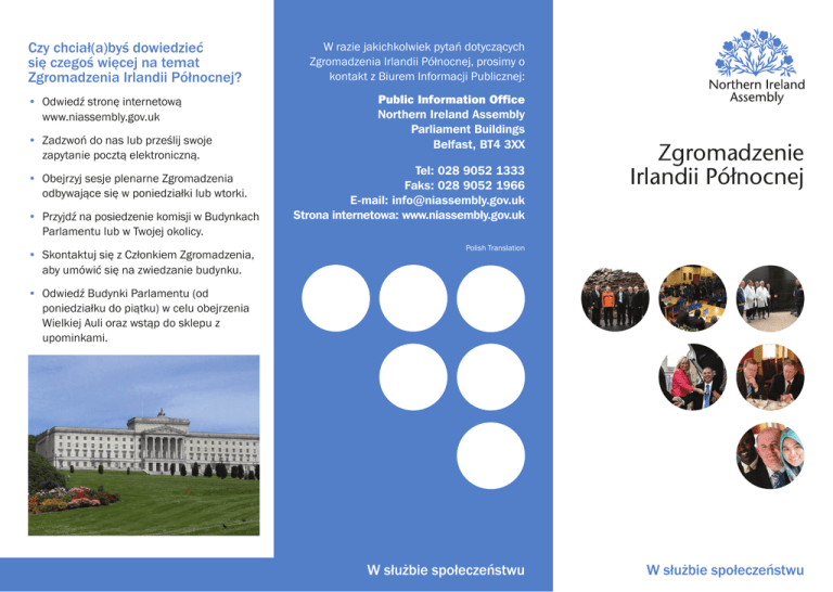 Czy chciał(a)byś dowiedzieć się czegoś więcej na temat Zgromadzenia Irlandii Północnej? • Odwiedź stronę internetową www.niassembly.gov.uk • Zadzwoń do nas lub prześlij swoje zapytanie pocztą elektroniczną. • Obejrzyj sesje plenarne Zgromadzenia odbywające się w poniedziałki lub wtorki. • Przyjdź na posiedzenie komisji w Budynkach Parlamentu lub w Twojej okolicy. • Skontaktuj się z Członkiem Zgromadzenia, aby umówić się na zwiedzanie budynku. W razie jakichkolwiek pytań dotyczących Zgromadzenia Irlandii Północnej, prosimy o kontakt z Biurem Informacji Publicznej: Public Information Office Northern Ireland Assembly Parliament Buildings Belfast, BT4 3XX Tel: 028 9052 1333 Faks: 028 9052 1966 E-mail: [email protected] Strona internetowa: www.niassembly.gov.uk Zgromadzenie Irlandii Północnej Polish Translation • Odwiedź Budynki Parlamentu (od poniedziałku do piątku) w celu obejrzenia Wielkiej Auli oraz wstąp do sklepu z upominkami. W służbie społeczeństwu W służbie społeczeństwu Zgromadzenie Irlandii Północnej (Northern Ireland Assembly)… jest zdecentralizowanym Rządem Irlandii Północnej. Posiada moc ustanawiania praw regulujących szeroki zakres przedmiotów, łącznie z gospodarką mieszkaniową, zatrudnieniem, oświatą, zdrowiem, rolnictwem oraz środowiskiem. Zgromadzenie zbiera się w Budynkach Parlamentu w Belfaście. Członkowie Zgromadzenia Ustawodawczego (MLA – Members of the Legislative Assembly)… wybierani są przez mieszkańców Irlandii Północnej. Zgromadzenie składa się ze 108 członków, po 6 z każdego z 18 okręgów wyborczych Irlandii Północnej. Wybory do Zgromadzenia odbywają się co cztery lata. Do obowiązków Członków Zgromadzenia Ustawodawczego należą m.in. ustanawianie prawa oraz kontrola pracy ministrów i ministerstw. Sesje plenarne… Budynki Parlamentu… to pełne zebrania Zgromadzenia w sali posiedzeń. Członkowie Zgromadzenia Ustawodawczego debatują podczas nich nad sprawami dotyczącymi mieszkańców Irlandii Północnej, a także ustanawiają prawo. Sesje plenarne odbywają się w poniedziałki oraz wtorki i transmitowane są na żywo na stronie internetowej Zgromadzenia. Sesje plenarne można również obserwować z galerii dla publiczności z widokiem na salę posiedzeń. są otwarte dla zwiedzających od poniedziałku do piątku w godzinach od 9:00 do 16:00. Można zorganizować zwiedzanie imponującego gmachu Parlamentu, kontaktując się z Członkiem Zgromadzenia lub naszym Serwisem Edukacyjnym. Komisje Zgromadzenia… to grupy robocze, składające się z 11 Członków Zgromadzenia Ustawodawczego. Każda komisja specjalizuje się w konkretnej dziedzinie. Komisje analizują propozycje nowych praw, weryfikują pracę ministrów oraz ministerstw, a także kontrolują sprawy związane z działalnością Zgromadzenia. Od 2007 r. komisje Zgromadzenia spotkały się z setkami osób i rozważyły wiele różnych kwestii dotyczących mieszkańców Irlandii Północnej. Kwestie te obejmowały m.in. problemy zdrowotne, opłaty za wodę, szkolne egzaminy przejściowe, ceny energii elektrycznej, bezpieczeństwo drogowe oraz dostępność mieszkalnictwa. Zgromadzenie Irlandii Północnej… oferuje program zwiedzania dla szkół i grup osób pragnących dowiedzieć się czegoś więcej na temat Zgromadzenia Irlandii Północnej. Serwis zapewnia również materiały edukacyjne jako pomoc w nauczaniu oraz uczeniu się. Istnieje także społeczny program informacyjny, w ramach którego odwiedzane są lokalne społeczności i przedstawiane są informacje na temat Zgromadzenia. Komisje mają zwykle zebrania we wtorki, środy i czwartki. Każdy zainteresowany może przyjść na posiedzenie komisji, aby posłuchać dyskusji Członków Zgromadzenia. W służbie społeczeństwu