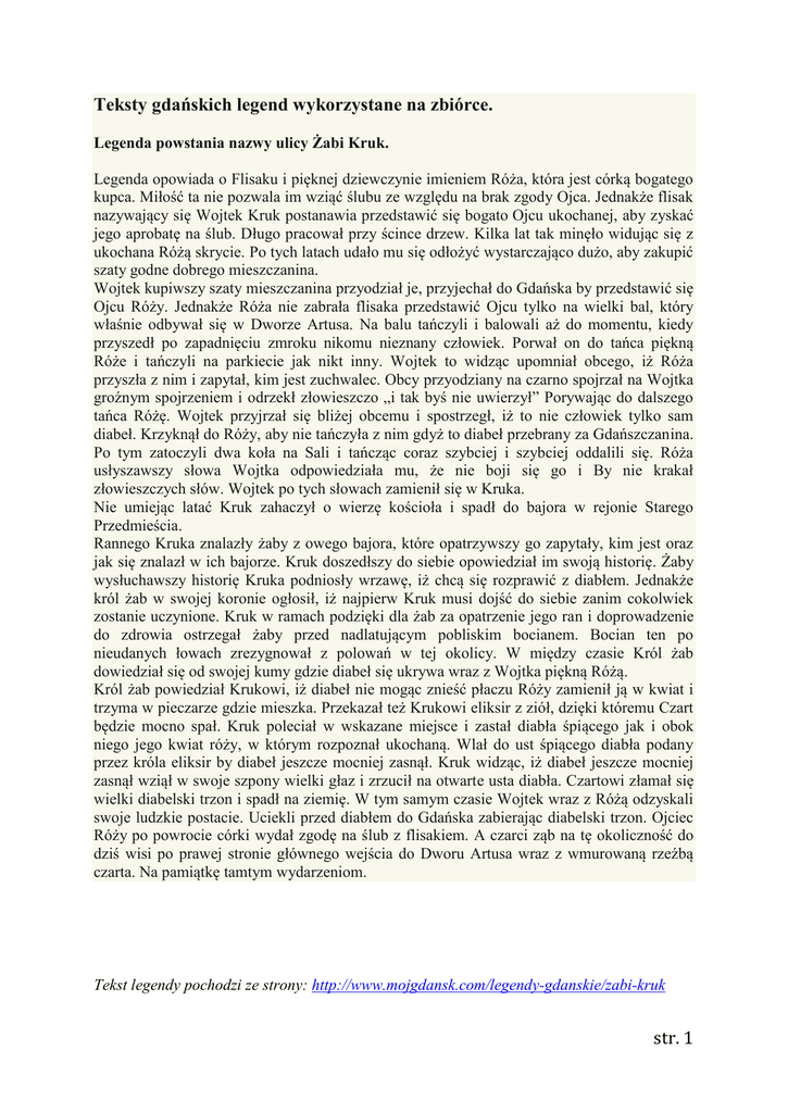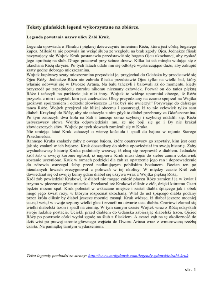 Teksty gdańskich legend wykorzystane na zbiórce. Legenda powstania nazwy ulicy Żabi Kruk. Legenda opowiada o Flisaku i pięknej dziewczynie imieniem Róża, która jest córką bogatego kupca. Miłość ta nie pozwala im wziąć ślubu ze względu na brak zgody Ojca. Jednakże flisak nazywający się Wojtek Kruk postanawia przedstawić się bogato Ojcu ukochanej, aby zyskać jego aprobatę na ślub. Długo pracował przy ścince drzew. Kilka lat tak minęło widując się z ukochana Różą skrycie. Po tych latach udało mu się odłożyć wystarczająco dużo, aby zakupić szaty godne dobrego mieszczanina. Wojtek kupiwszy szaty mieszczanina przyodział je, przyjechał do Gdańska by przedstawić się Ojcu Róży. Jednakże Róża nie zabrała flisaka przedstawić Ojcu tylko na wielki bal, który właśnie odbywał się w Dworze Artusa. Na balu tańczyli i balowali aż do momentu, kiedy przyszedł po zapadnięciu zmroku nikomu nieznany człowiek. Porwał on do tańca piękną Róże i tańczyli na parkiecie jak nikt inny. Wojtek to widząc upomniał obcego, iż Róża przyszła z nim i zapytał, kim jest zuchwalec. Obcy przyodziany na czarno spojrzał na Wojtka groźnym spojrzeniem i odrzekł złowieszczo „i tak byś nie uwierzył” Porywając do dalszego tańca Różę. Wojtek przyjrzał się bliżej obcemu i spostrzegł, iż to nie człowiek tylko sam diabeł. Krzyknął do Róży, aby nie tańczyła z nim gdyż to diabeł przebrany za Gdańszczanina. Po tym zatoczyli dwa koła na Sali i tańcząc coraz szybciej i szybciej oddalili się. Róża usłyszawszy słowa Wojtka odpowiedziała mu, że nie boji się go i By nie krakał złowieszczych słów. Wojtek po tych słowach zamienił się w Kruka. Nie umiejąc latać Kruk zahaczył o wierzę kościoła i spadł do bajora w rejonie Starego Przedmieścia. Rannego Kruka znalazły żaby z owego bajora, które opatrzywszy go zapytały, kim jest oraz jak się znalazł w ich bajorze. Kruk doszedłszy do siebie opowiedział im swoją historię. Żaby wysłuchawszy historię Kruka podniosły wrzawę, iż chcą się rozprawić z diabłem. Jednakże król żab w swojej koronie ogłosił, iż najpierw Kruk musi dojść do siebie zanim cokolwiek zostanie uczynione. Kruk w ramach podzięki dla żab za opatrzenie jego ran i doprowadzenie do zdrowia ostrzegał żaby przed nadlatującym pobliskim bocianem. Bocian ten po nieudanych łowach zrezygnował z polowań w tej okolicy. W między czasie Król żab dowiedział się od swojej kumy gdzie diabeł się ukrywa wraz z Wojtka piękną Różą. Król żab powiedział Krukowi, iż diabeł nie mogąc znieść płaczu Róży zamienił ją w kwiat i trzyma w pieczarze gdzie mieszka. Przekazał też Krukowi eliksir z ziół, dzięki któremu Czart będzie mocno spał. Kruk poleciał w wskazane miejsce i zastał diabła śpiącego jak i obok niego jego kwiat róży, w którym rozpoznał ukochaną. Wlał do ust śpiącego diabła podany przez króla eliksir by diabeł jeszcze mocniej zasnął. Kruk widząc, iż diabeł jeszcze mocniej zasnął wziął w swoje szpony wielki głaz i zrzucił na otwarte usta diabła. Czartowi złamał się wielki diabelski trzon i spadł na ziemię. W tym samym czasie Wojtek wraz z Różą odzyskali swoje ludzkie postacie. Uciekli przed diabłem do Gdańska zabierając diabelski trzon. Ojciec Róży po powrocie córki wydał zgodę na ślub z flisakiem. A czarci ząb na tę okoliczność do dziś wisi po prawej stronie głównego wejścia do Dworu Artusa wraz z wmurowaną rzeźbą czarta. Na pamiątkę tamtym wydarzeniom. Tekst legendy pochodzi ze strony: http://www.mojgdansk.com/legendy-gdanskie/zabi-kruk str. 1 Lwy gdańskie Gdańsk słynął niegdyś z wybitnych kamieniarzy, jednak żaden z nich nie był tak zdolny i tak znany jak Daniel. To spod jego ręki wychodziły największe arcydzieła, a rzeźbione w kamieniu przedmioty wyglądały jak żywe. Najchętniej Daniel rzeźbił lwy. Uwielbiał to do tego stopnia, że mieszkańcy miasta żartowali, że mistrz ma szczęście do tych zwierząt niczym jego biblijny imiennik, który wtrącony do jamy pełnej lwów zaprzyjaźnił się z nimi. Gdy rada miejska uchwaliła, by przyozdobić ratusz nowym herbem, zwrócono się z tym zadaniem do Daniela. Nie zdziwiło to nikogo, bo kto inny mógłby lepiej wyrzeźbić herbowe lwy, które strzegły korony i dwóch krzyży? Były to niespokojne czasy. Polska chyliła się ku upadkowi, nękana ze wszystkich stron przez wrogo nastawionych sąsiadów. Zwłaszcza pruski król spoglądał na Gdańsk, chcąc przyłączyć go do swych ziem. Rozwinięte, portowe miasto było dla niego łakomym kąskiem. Daniel nieraz rozmyślał o tym w czasie pracy, był jednak przekonany, że lwy pilnują polskiej korony, którą nad dwoma herbowymi krzyżami zawiesił kiedyś Kazimierz Wielki. Niebawem mistrz skończył pracę i zorganizowano wielkie święto z okazji odsłonięcia nowo wyrzeźbionego herbu. Wszyscy ze zniecierpliwieniem czekali na moment, w którym ujrzą dzieło. Kiedy odsłonięto herb, przez tłum przebiegł szmer zachwytu. Jednak po chwili zabrzmiały zdumione głosy. - Mistrz musiał się pomylić! - Zakpił z nas! - Czyżby nie znał herbu własnego miasta? Ludzie zaczęli się przekrzykiwać i powstał jeden wielki hałas i zamieszanie. I rzeczywiście, nowy herb różnił się od tego, który widniał na wszystkich chorągwiach i pieczęciach. Tam lwy były zwrócone ku sobie, a ich wzrok spotykał się nad trzymaną w łapach tarczą. Ale wtedy z tłumu wystąpił starzec z długą, siwą brodą. Zgromadzeni rozpoznali w nim sławnego niegdyś mistrza kamieniarstwa, Krzysztofa. - Nie ma tu żadnej pomyłki - powiedział donośnym głosem. - Mistrz Daniel dobrze wiedział co robi. Spójrzcie na te lwy, ich wzrok biegnie ku Złotej i Wyżynnej Bramie, a tam zaczyna się królewska droga. Gdańskie lwy patrzą ku Rzeczpospolitej, oczekując od niej opieki i pomocy dla naszego miasta
