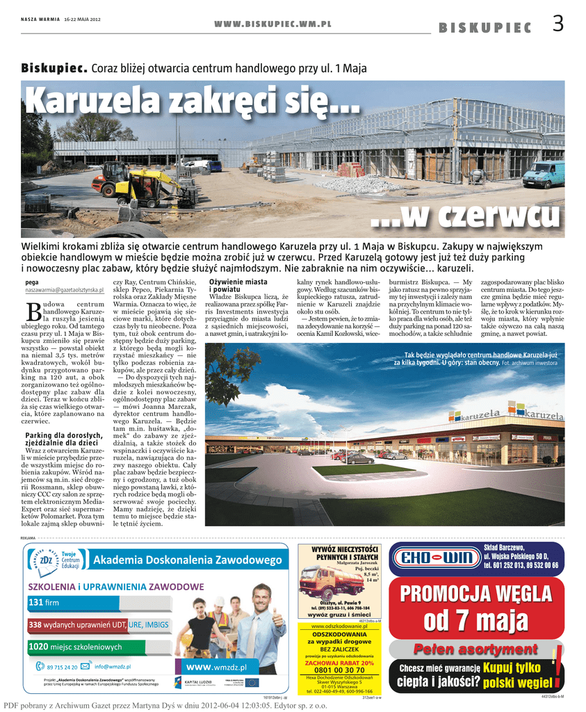 N A S Z A W A R M I A 16-22 MAJA 2012 3 BISKUPIEC W W W. B I S K U P I E C . W M . P L B is kupie c. Coraz bliżej otwarcia centrum handlowego przy ul. 1 Maja Karuzela zakręci się... ...w czerwcu Wielkimi krokami zbliża się otwarcie centrum handlowego Karuzela przy ul. 1 Maja w Biskupcu. Zakupy w największym obiekcie handlowym w mieście będzie można zrobić już w czerwcu. Przed Karuzelą gotowy jest już też duży parking i nowoczesny plac zabaw, który będzie służyć najmłodszym. Nie zabraknie na nim oczywiście... karuzeli. pega [email protected] B udowa centrum handlowego Karuzela ruszyła jesienią ubiegłego roku. Od tamtego czasu przy ul. 1 Maja w Biskupcu zmieniło się prawie wszystko — powstał obiekt na niemal 3,5 tys. metrów kwadratowych, wokół budynku przygotowano parking na 120 aut, a obok zorganizowano też ogólnodostępny plac zabaw dla dzieci. Teraz w końcu zbliża się czas wielkiego otwarcia, które zaplanowano na czerwiec. Parking dla dorosłych, zjeżdżalnie dla dzieci Wraz z otwarciem Karuzeli w mieście przybędzie przede wszystkim miejsc do robienia zakupów. Wśród najemców są m.in. sieć drogerii Rossmann, sklep obuwniczy CCC czy salon ze sprzętem elektronicznym MediaExpert oraz sieć supermarketów Polomarket. Poza tym lokale zajmą sklep obuwni- czy Ray, Centrum Chińskie, sklep Pepco, Piekarnia Tyrolska oraz Zakłady Mięsne Warmia. Oznacza to więc, że w mieście pojawią się sieciowe marki, które dotychczas były tu nieobecne. Poza tym, tuż obok centrum dostępny będzie duży parking, z którego będą mogli korzystać mieszkańcy — nie tylko podczas robienia zakupów, ale przez cały dzień. — Do dyspozycji tych najmłodszych mieszkańców będzie z kolei nowoczesny, ogólnodostępny plac zabaw — mówi Joanna Marczak, dyrektor centrum handlowego Karuzela. — Będzie tam m.in. huśtawka, „domek“ do zabawy ze zjeżdżalnią, a także stożek do wspinaczki i oczywiście karuzela, nawiązująca do nazwy naszego obiektu. Cały plac zabaw będzie bezpieczny i ogrodzony, a tuż obok niego powstaną ławki, z których rodzice będą mogli obserwować swoje pociechy. Mamy nadzieję, że dzięki temu to miejsce będzie stale tętnić życiem. Ożywienie miasta i powiatu Władze Biskupca liczą, że realizowana przez spółkę Farris Investments inwestycja przyciągnie do miasta ludzi z sąsiednich miejscowości, a nawet gmin, i uatrakcyjni lo- kalny rynek handlowo-usługowy. Według szacunków biskupieckiego ratusza, zatrudnienie w Karuzeli znajdzie około stu osób. — Jestem pewien, że to zmiana zdecydowanie na korzyść — ocenia Kamil Kozłowski, wice- burmistrz Biskupca. — My jako ratusz na pewno sprzyjamy tej inwestycji i zależy nam na przychylnym klimacie wokół niej. To centrum to nie tylko praca dla wielu osób, ale też duży parking na ponad 120 samochodów, a także schludnie zagospodarowany plac blisko centrum miasta. Do tego jeszcze gmina będzie mieć regularne wpływy z podatków. Myślę, że to krok w kierunku rozwoju miasta, który wpłynie także ożywczo na całą naszą gminę, a nawet powiat. Tak będzie wyglądało centrum handlowe Karuzela już za kilka tygodni. U góry: stan obecny. Fot. archiwum inwestora REKLAMA Skład Barczewo, ul. Wojska Polskiego 50 D, tel. 601 252 013, 89 532 00 66 WYWÓZ NIECZYSTOŚCI PŁYNNYCH I STAŁYCH Małgorzata Jaroszuk Poj. beczki 8,5 m3, 14 m3 PROMOCJA WĘGLA Olsztyn, ul. Pawia 9 tel. (89) 523-83-11, 606 708-184 wywóz gruzu i śmieci 46212otbs-a-M www.odszkodowanie.pl ODSZKODOWANIA za wypadki drogowe BEZ ZALICZEK prowizja po uzyskaniu odszkodowania ZACHOWAJ RABAT 20% 0801 00 30 70 Hexa Dochodzenie Odszkodowań Skwer Wyszyńskiego 5 01-015 Warszawa tel. 022-460-49-49, 600-996-166 161912otbr-j -W PDF pobrany z Archiwum Gazet przez Martyna Dyś w dniu 2012-06-04 12:03:05. Edytor sp. z o.o. 312see1-a-w od 7 maja Pełen asortyment ! ! Kupuj tylko ciepła i jakości? polski węgiel Chcesz mieć gwarancję 44312otbs-b-M