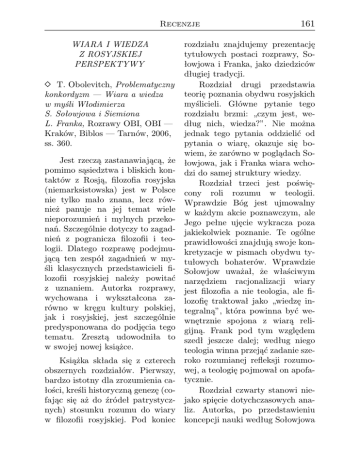 Recenzje WIARA I WIEDZA Z ROSYJSKIEJ PERSPEKTYWY T. Obolevitch, Problematyczny konkordyzm — Wiara a wiedza w myśli Włodimierza S. Sołowjowa i Siemiona L. Franka, Rozrawy OBI, OBI — Kraków, Biblos — Tarnów, 2006, ss. 360. Jest rzeczą zastanawiającą, że pomimo sąsiedztwa i bliskich kontaktów z Rosją, filozofia rosyjska (niemarksistowska) jest w Polsce nie tylko mało znana, lecz również panuje na jej temat wiele nieporozumień i mylnych przekonań. Szczególnie dotyczy to zagadnień z pogranicza filozofii i teologii. Dlatego rozprawę podejmującą ten zespół zagadnień w myśli klasycznych przedstawicieli filozofii rosyjskiej należy powitać z uznaniem. Autorka rozprawy, wychowana i wykształcona zarówno w kręgu kultury polskiej, jak i rosyjskiej, jest szczególnie predysponowana do podjęcia tego tematu. Zresztą udowodniła to w swojej nowej książce. Książka składa się z czterech obszernych rozdziałów. Pierwszy, bardzo istotny dla zrozumienia całości, kreśli historyczną genezę (cofając się aż do źródeł patrystycznych) stosunku rozumu do wiary w filozofii rosyjskiej. Pod koniec 161 rozdziału znajdujemy prezentację tytułowych postaci rozprawy, Sołowjowa i Franka, jako dziedziców długiej tradycji. Rozdział drugi przedstawia teorię poznania obydwu rosyjskich myślicieli. Główne pytanie tego rozdziału brzmi: „czym jest, według nich, wiedza?”. Nie można jednak tego pytania oddzielić od pytania o wiarę, okazuje się bowiem, że zarówno w poglądach Sołowjowa, jak i Franka wiara wchodzi do samej struktury wiedzy. Rozdział trzeci jest poświęcony roli rozumu w teologii. Wprawdzie Bóg jest ujmowalny w każdym akcie poznawczym, ale Jego pełne ujęcie wykracza poza jakiekolwiek poznanie. Te ogólne prawidłowości znajdują swoje konkretyzacje w pismach obydwu tytułowych bohaterów. Wprawdzie Sołowjow uważał, że właściwym narzędziem racjonalizacji wiary jest filozofia a nie teologia, ale filozofię traktował jako „wiedzę integralną”, która powinna być wewnętrznie spojona z wiarą religijną. Frank pod tym względem szedł jeszcze dalej; według niego teologia winna przejąć zadanie szeroko rozumianej refleksji rozumowej, a teologię pojmował on apofatycznie. Rozdział czwarty stanowi niejako spięcie dotychczasowych analiz. Autorka, po przedstawieniu koncepcji nauki według Sołowjowa 162 Recenzje i Franka, omawia relację pomiędzy wiarą a wiedzą naukową wedle tych autorów. Dokonuje również krytycznej oceny ich stanowisk. Porównanie z ujęciami „nauka a wiara” w „myśli zachodniej” jest oczywiście nieuniknione. I tu właśnie pojawia się tytułowe „oskarżenie” obu autorów o konkordyzm, ale jest to konkordyzm rozumiany specyficznie, nie chodzi w nim bowiem o uzgadnianie prawd religijnych z twierdzeniami nauki, lecz o stworzenie „wiedzy integralnej”, w której zarówno nauka, jak i religia uzyskałyby swoje naturalne miejsce. Wybór Sołowjowa i Franka jako przedmiot analiz nie jest przypadkowy. Wyboru Włodzimierza Sołowjowa nie potrzeba uzasadniać, gdyż autor ten jest powszechnie uznawany za najwybitniejszego przedstawiciela religijnej filozofii rosyjskiej XIX wieku (lub w ogóle filozofii rosyjskiej tego okresu). Siemion Ludwigowicz Frank, o 22 lata młodszy od Sołowijowa, był nie tylko spadkobiercą jego myśli, ale ją w sposób twórczy rozwijał, w wielu przypadkach znacznie ulepszając system swojego poprzednika. Co więcej, Frank był myślicielem oryginalnym, którego nie można uważać za zwykłego kontynuatora idei Sołowjowa. Należy uznać, że poglądy obu tych myślicieli stanowią „reprezentatywną próbkę” ro- syjskiego stylu filozofowania tego okresu. Autorka rozprawy zwykle rozpoczyna analizy danego zagadnienia od przedstawienia stanowiska Sołowjowa, by je potem skonfrontować z często bardziej radykalnymi poglądami Franka. Z oczywistych względów pracę tę czyta się pod kątem porównań rosyjskiego stylu filozofowania ze stylem zachodnim. Pozwolę sobie wypunktować (wybiórczo) różnice, które najbardziej mnie uderzyły: 1. Istotna różnica ujawnia się w stosunku do zagadnienia „nauka a wiara”. Dobrze różnicę tę przedstawia Kiriejewski: Pomiędzy nauką objawioną a naukami ludzkimi (włączając w nie naukę Kościoła) istnieje przepaść. „Myśl religijna, choćby nie wiedzieć jak usiłowała pogodzić rozum z wiarą, nigdy nie uzna żadnego dogmatu Objawienia za zwykły wynik rozumowania, nigdy wyniku rozumowania nie obdarzy autorytetem dogmatu Objawienia”. Zabezpiecza to prawdy religijne przed niewłaściwymi interpretacjami rozumu, ale i chroni naukę przed ingerencją kościelnych autorytetów. 2. Myśl rosyjska (nie tylko teologia) jest przesiąknięta podejściem apofatycznym. Zachodni myśliciele często podkreślali via negativa w poznaniu Boga, ale na ogół pozostawało to w sferze mniej lub bardziej teoretycznych deklaracji, podczas gdy myśl Recenzje rosyjska rzeczywiście zatrzymuje się „na progu tajemnicy”. Prowadzi to do nastawienia mistycznego. Oczywiście na Zachodzie także istnieje mistyka, ale na ogół jest ona oddzielona od akademickiej teologii. W Prawosławiu granica między mistyką a teologią zaciera się. Nawet gdy Sołowjow deklaruje się jako zwolennik teologii katafatycznej, myśli on mistycznie, a jego idea „nauki integralnej” bardziej przypomina koncepcje wizjonerskie niż racjonalny dyskurs. Frank nie czyni nawet deklaracji w tym kierunku. Jego doktryna o docta ignorantia jest postawieniem kropki nad i. 3. Równocześnie zarówno Sołowjow, jak i Frank (a także inni myśliciele rosyjscy) chętnie odwołują się do filozofów zachodnich, nawet tak bardzo racjonalistycznie nastawionych jak Kartezjusz, Spinoza czy Leibniz. Najchętniej jednak czerpią z idealizmu niemieckiego, najczęściej z Hegla. Nie trzeba przy tym dodawać, że ich interpretacja filozofów zachodnich bywa bardzo s