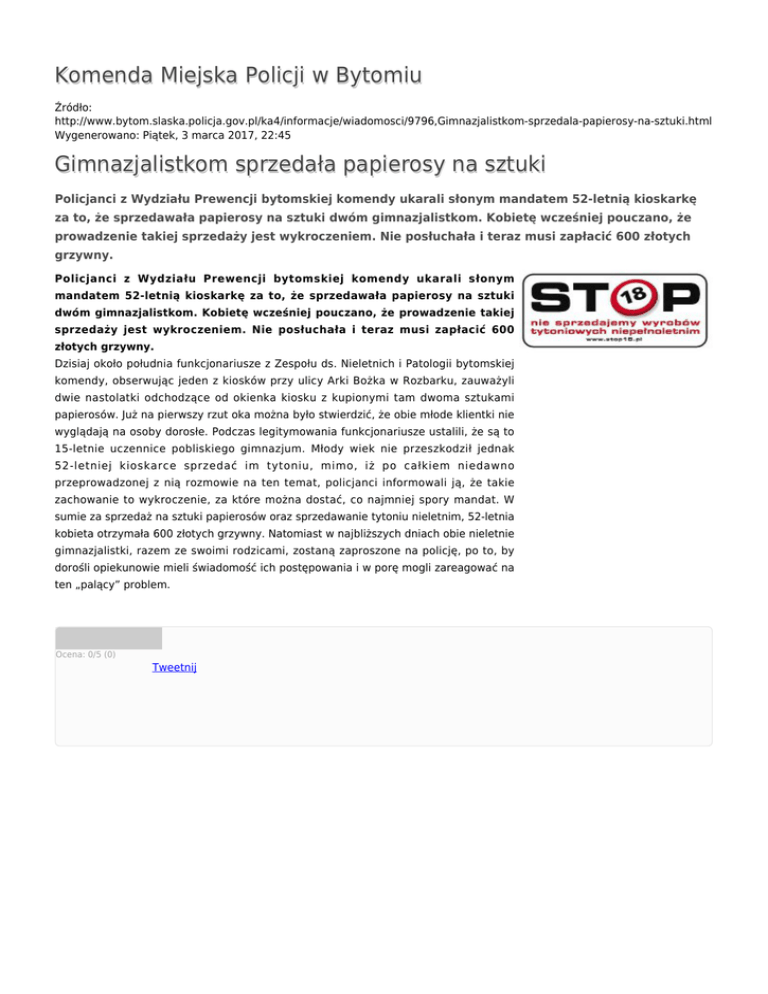 Komenda Miejska Policji w Bytomiu Źródło: http://www.bytom.slaska.policja.gov.pl/ka4/informacje/wiadomosci/9796,Gimnazjalistkom-sprzedala-papierosy-na-sztuki.html Wygenerowano: Piątek, 3 marca 2017, 22:45 Gimnazjalistkom sprzedała papierosy na sztuki Policjanci z Wydziału Prewencji bytomskiej komendy ukarali słonym mandatem 52-letnią kioskarkę za to, że sprzedawała papierosy na sztuki dwóm gimnazjalistkom. Kobietę wcześniej pouczano, że prowadzenie takiej sprzedaży jest wykroczeniem. Nie posłuchała i teraz musi zapłacić 600 złotych grzywny. Policjanci z Wydziału Prewencji bytomskiej komendy ukarali słonym mandatem 52-letnią kioskarkę za to, że sprzedawała papierosy na sztuki dwóm gimnazjalistkom. Kobietę wcześniej pouczano, że prowadzenie takiej sprzedaży jest wykroczeniem. Nie posłuchała i teraz musi zapłacić 600 złotych grzywny. Dzisiaj około południa funkcjonariusze z Zespołu ds. Nieletnich i Patologii bytomskiej komendy, obserwując jeden z kiosków przy ulicy Arki Bożka w Rozbarku, zauważyli dwie nastolatki odchodzące od okienka kiosku z kupionymi tam dwoma sztukami papierosów. Już na pierwszy rzut oka można było stwierdzić, że obie młode klientki nie wyglądają na osoby dorosłe. Podczas legitymowania funkcjonariusze ustalili, że są to 15-letnie uczennice pobliskiego gimnazjum. Młody wiek nie przeszkodził jednak 52-letniej kioskarce sprzedać im tytoniu, mimo, iż po całkiem niedawno przeprowadzonej z nią rozmowie na ten temat, policjanci informowali ją, że takie zachowanie to wykroczenie, za które można dostać, co najmniej spory mandat. W sumie za sprzedaż na sztuki papierosów oraz sprzedawanie tytoniu nieletnim, 52-letnia kobieta otrzymała 600 złotych grzywny. Natomiast w najbliższych dniach obie nieletnie gimnazjalistki, razem ze swoimi rodzicami, zostaną zaproszone na policję, po to, by dorośli opiekunowie mieli świadomość ich postępowania i w porę mogli zareagować na ten „palący” problem. Ocena: 0/5 (0) Tweetnij
