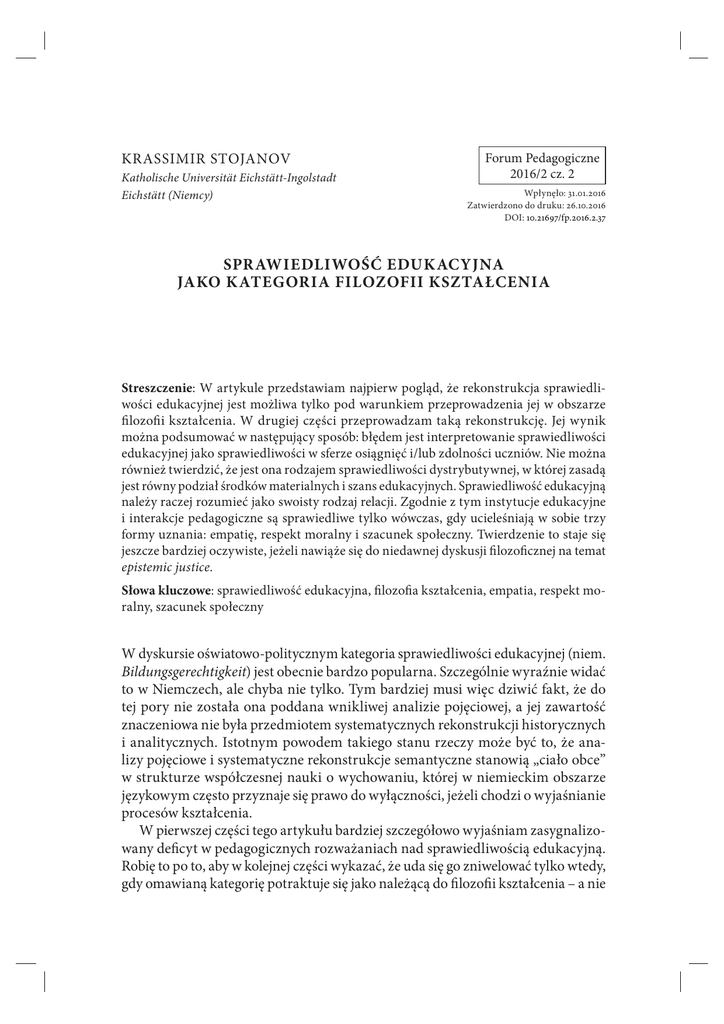 KRASSIMIR STOJANOV Katholische Universität Eichstätt-Ingolstadt Eichstätt (Niemcy) Forum Pedagogiczne 2016/2 cz. 2 Wpłynęło: 31.01.2016 Zatwierdzono do druku: 26.10.2016 DOI: 10.21697/fp.2016.2.37 SPRAWIEDLIWOŚĆ EDUKACYJNA JAKO KATEGORIA FILOZOFII KSZTAŁCENIA Streszczenie: W artykule przedstawiam najpierw pogląd, że rekonstrukcja sprawiedliwości edukacyjnej jest możliwa tylko pod warunkiem przeprowadzenia jej w obszarze filozofii kształcenia. W drugiej części przeprowadzam taką rekonstrukcję. Jej wynik można podsumować w następujący sposób: błędem jest interpretowanie sprawiedliwości edukacyjnej jako sprawiedliwości w sferze osiągnięć i/lub zdolności uczniów. Nie można również twierdzić, że jest ona rodzajem sprawiedliwości dystrybutywnej, w której zasadą jest równy podział środków materialnych i szans edukacyjnych. Sprawiedliwość edukacyjną należy raczej rozumieć jako swoisty rodzaj relacji. Zgodnie z tym instytucje edukacyjne i interakcje pedagogiczne są sprawiedliwe tylko wówczas, gdy ucieleśniają w sobie trzy formy uznania: empatię, respekt moralny i szacunek społeczny. Twierdzenie to staje się jeszcze bardziej oczywiste, jeżeli nawiąże się do niedawnej dyskusji filozoficznej na temat epistemic justice. Słowa kluczowe: sprawiedliwość edukacyjna, filozofia kształcenia, empatia, respekt moralny, szacunek społeczny W dyskursie oświatowo-politycznym kategoria sprawiedliwości edukacyjnej (niem. Bildungsgerechtigkeit) jest obecnie bardzo popularna. Szczególnie wyraźnie widać to w Niemczech, ale chyba nie tylko. Tym bardziej musi więc dziwić fakt, że do tej pory nie została ona poddana wnikliwej analizie pojęciowej, a jej zawartość znaczeniowa nie była przedmiotem systematycznych rekonstrukcji historycznych i analitycznych. Istotnym powodem takiego stanu rzeczy może być to, że analizy pojęciowe i systematyczne rekonstrukcje semantyczne stanowią „ciało obce” w strukturze współczesnej nauki o wychowaniu, której w niemieckim obszarze językowym często przyznaje się prawo do wyłączności, jeżeli chodzi o wyjaśnianie procesów kształcenia. W pierwszej części tego artykułu bardziej szczegółowo wyjaśniam zasygnalizowany deficyt w pedagogicznych rozważaniach nad sprawiedliwością edukacyjną. Robię to po to, aby w kolejnej części wykazać, że uda się go zniwelować tylko wtedy, gdy omawianą kategorię potraktuje się jako należącą do filozofii kształcenia – a nie 188 KRASSIMIR STOJANOV wyłącznie do nauki o wychowaniu. Rozdział trzeci i czwarty są poświęcone rekonstrukcji najbardziej charakterystycznych cech kategorii sprawiedliwości edukacyjnej i normatywnym implikacjom, które z niej wynikają. W tym celu oddzielam najpierw tę kategorię od spokrewnionej z nią sprawiedliwości zdolności i osiągnięć, a następnie stawiam tezę, że sprawiedliwości edukacyjnej nie należy odczytywać jako specyficznego rodzaju sprawiedliwości rozdzielczej, lecz wyłącznie jako sprawiedliwość polegającą na uznaniu drugiego człowieka w jego osobowej godności (niem. Anerkennungsgerechtigkeit). W ostatniej części artykułu to rozumienie sprawiedliwości edukacyjnej zostaje wyjaśnione przez odwołanie do toczącej się od kilku lat międzynarodowej dyskusji wokół pojęcia epistemic injustice, które moim zdaniem można zinterpretować jako niesprawiedliwość edukacyjną wynikającą z braku lub niedostatecznego uznania drugiej osoby. Rozbieżność między interesem publicznym odnośnie do sprawiedliwości edukacyjnej a stanem analiz tego pojęcia Przed kilkoma laty Peter J. Brenner trafnie zauważył, że chociaż pojęcie sprawiedliwości edukacyjnej wkrótce po ogłoszeniu wyników badań PISA w 2000 roku zawładnęło debatą polityczną w Niemczech, to jednak w naukach o wychowaniu i kształceniu – jak do tej pory – nie dokonano szczegółowego dookreślenia go jako kategorii naukowej (Brenner 2009, s. 29). W prowadzonej swego czasu dyskusji na temat wyników PISA trzeba właściwie uznać za rodzaj skandalu to, że zaniedbano problematyzacji tego pojęcia, nie mówiąc już o jego wyjaśnieniu. Sprawiedliwość systemu oświatowego była w niej ukazywana prawie wyłącznie jako kwestia zależności osiągnięć edukacyjnych i związanych z nimi karier zawodowych uczniów od ich pochodzenia społeczno-kulturowego. Nie zapytano natomiast w ogóle o to, dlaczego i w jakim stopniu uzależnienie procesów kształcenia od pochodzenia społeczno-kulturowego jest przyczyną niesprawiedliwości edukacyjnej oraz czy istnieją w niemieckim systemie oświaty inne jeszcze formy tej niesprawiedliwości (tamże, s. 34). Powyższa ocena prowadzonej wówczas dyskusji jest nadal aktualna. Ten sam deficyt ujawnia się również w nowszych studiach. Co prawda w najnowszym narodowym raporcie na temat wyników badania PISA, który został ogłoszony w 2012 roku, termin „sprawiedliwość edukacyjna” (odpowiadający „równości szans”) jest używany z dużą ostrożnością, jednak bez jakiejkolwiek (choćby tylko zalążkowej) analizy systematycznej. Jego autorzy zadowalają się enigmatycznie sformułowanym wskazaniem na stan odnośnej dyskusji w ramach teorii sprawiedliwości. Zdaniem niektórych badaczy we wspomnianej publikacji termin „sprawiedliwość edukacyjna” jest tożsamy po prostu z equity (Müller, Ehmke 2013, s. 245). Poza tym jej autorzy całkowicie ignorują fakt, że istnieje cały szereg znanych i uznanych koncepcji sprawiedliwości nieegalitarnej i że w międzynarodowej dyskusji odnośnie do kategorii sprawiedliwości rozważa się rozmaite odmiany SPRAWIEDLIWOŚĆ EDUKACYJNA… 189 egalitaryzmu i różne formy equity. Niektóre z tych odmian i form zostaną omówione w dalszej części artykułu. Wskazane powyżej w znacznej mierze zaniedbane zadanie systematycznej i możliwie wszechstronnej analizy kategorii sprawiedliwości edukacyjnej w ramach skoncentrowa