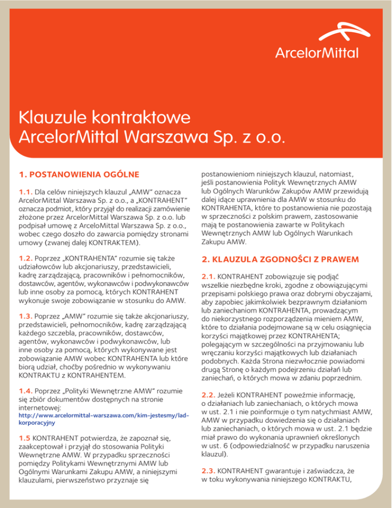 Klauzule kontraktowe ArcelorMittal Warszawa Sp. z o.o. 1. POSTANOWIENIA OGÓLNE 1.1. Dla celów niniejszych klauzul „AMW” oznacza ArcelorMittal Warszawa Sp. z o.o., a „KONTRAHENT” oznacza podmiot, który przyjął do realizacji zamówienie złożone przez ArcelorMittal Warszawa Sp. z o.o. lub podpisał umowę z ArceloMittal Warszawa Sp. z o.o., wobec czego doszło do zawarcia pomiędzy stronami umowy (zwanej dalej KONTRAKTEM). 1.2. Poprzez „KONTRAHENTA” rozumie się także udziałowców lub akcjonariuszy, przedstawicieli, kadrę zarządzającą, pracowników i pełnomocników, dostawców, agentów, wykonawców i podwykonawców lub inne osoby za pomocą, których KONTRAHENT wykonuje swoje zobowiązanie w stosunku do AMW. 1.3. Poprzez „AMW” rozumie się także akcjonariuszy, przedstawicieli, pełnomocników, kadrę zarządzającą każdego szczebla, pracowników, dostawców, agentów, wykonawców i podwykonawców, lub inne osoby za pomocą, których wykonywane jest zobowiązanie AMW wobec KONTRAHENTA lub które biorą udział, choćby pośrednio w wykonywaniu KONTRAKTU z KONTRAHENTEM. 1.4. Poprzez „Polityki Wewnętrzne AMW” rozumie się zbiór dokumentów dostępnych na stronie internetowej: http://www.arcelormittal-warszawa.com/kim-jestesmy/ladkorporacyjny 1.5 KONTRAHENT potwierdza, że zapoznał się, zaakceptował i przyjął do stosowania Polityki Wewnętrzne AMW. W przypadku sprzeczności pomiędzy Politykami Wewnętrznymi AMW lub Ogólnymi Warunkami Zakupu AMW, a niniejszymi klauzulami, pierwszeństwo przyznaje się postanowieniom niniejszych klauzul, natomiast, jeśli postanowienia Polityk Wewnętrznych AMW lub Ogólnych Warunków Zakupów AMW przewidują dalej idące uprawnienia dla AMW w stosunku do KONTRAHENTA, które to postanowienia nie pozostają w sprzeczności z polskim prawem, zastosowanie mają te postanowienia zawarte w Politykach Wewnętrznych AMW lub Ogólnych Warunkach Zakupu AMW. 2. KLAUZULA ZGODNOŚCI Z PRAWEM 2.1. KONTRAHENT zobowiązuje się podjąć wszelkie niezbędne kroki, zgodne z obowiązującymi przepisami polskiego prawa oraz dobrymi obyczajami, aby zapobiec jakimkolwiek bezprawnym działaniom lub zaniechaniom KONTRAHENTA, prowadzącym do niekorzystnego rozporządzenia mieniem AMW, które to działania podejmowane są w celu osiągnięcia korzyści majątkowej przez KONTRAHENTA; polegającym w szczególności na przyjmowaniu lub wręczaniu korzyści majątkowych lub działaniach podobnych. Każda Strona niezwłocznie powiadomi drugą Stronę o każdym podejrzeniu działań lub zaniechań, o których mowa w zdaniu poprzednim. 2.2. Jeżeli KONTRAHENT poweźmie informację, o działaniach lub zaniechaniach, o których mowa w ust. 2.1 i nie poinformuje o tym natychmiast AMW, AMW w przypadku dowiedzenia się o działaniach lub zaniechaniach, o których mowa w ust. 2.1 będzie miał prawo do wykonania uprawnień określonych w ust. 6 (odpowiedzialność w przypadku naruszenia klauzul). 2.3. KONTRAHENT gwarantuje i zaświadcza, że w toku wykonywania niniejszego KONTRAKTU, KONTRAHENT będzie postępować zgodnie z przepisami prawa a także Politykami Wewnętrznymi AMW, a w przypadku naruszenia niniejszego zobowiązania przez KONTRAHENTA, KONTRAHENT zwolni AMW z wszelkich roszczeń osób trzecich kierowanych do AMW z tytułu naruszenia przepisów prawa lub Polityk Wewnętrznych AMW. 2.4. KONTRAHENT przyjmuje do wiadomości, że AMW zawarł niniejszy KONTRAKT z KONTRAHENTEM polegając na poniższych zapewnieniach KONTRAHENTA: a) KONTRAHENT nie przyjmie, nie zaoferuje ani nie wręczy, lub też nie zgodzi się na wręczenie AMW podarunku, prowizji lub innego typu płatności, jako wynagrodzenia za wykonanie lub niewykonanie określonej czynności przez AMW lub też udzielenia określonej preferencji KONTRAHENTOWI lub też okazanie nieprzychylności innemu podmiotowi w związku z zawarciem lub wykonaniem tej lub jakiejkolwiek innej umowy z AMW (z wyjątkiem sytuacji dozwolonych w ustawodawstwie polskim i Politykach Wewnętrznych AMW), b) KONTRAHENT oświadcza, że nie zapłacił ani nie uzgodnił z AMW żadnej prowizji nieprzewidzianej w KONTRAKCIE zawartym z AMW w związku z tym lub jakimkolwiek innym KONTRAKTEM zawartym z AMW. 3. KLAZULA O ZAKAZIE PRACY DZIECI 3.1. Strony oświadczają, że sprzeciwiają się pracy dzieci. KONTRAHENT potwierdza, że bezpośrednio ani pośrednio nie zatrudnia żadnej osoby młodocianej (z wyjątkiem przypadków zatrudniania młodocianych dozwolonych w prawie polskim). 4. KLAUZULA ANTYKORUPCYJNA 4.1. KONTRAHENT zgadza się w pełni przestrzegać wszystkich obowiązujących przepisów antykorupcyjnych, z uwzględnieniem przepisów przewidzianych jurysdykcją swojego kraju rejestracji i prawem polskim (jeśli są to różne kraje) oraz przestrzegać wytycznych zawartych w Politykach Wewnętrznych AMW dotyczących zapobiegania korupcji oraz przyjmowania i przekazywania prezentów i zaproszeń na imprezy rozrywkowe dostępnych pod adresami: http://www.arcelormittal-warszawa.com/upload/files/lad _korporacyjny/4_Wytyczne_ArcelorMittal_w_zakresie _zapobiegana_korupcj.pdf http://www.arcelormittal-warszawa.com/upload/files/lad _korporacyjny/5_Procedura_prezenty_pl.pdf 4.2. KONTRAHENT oświadcza, że jego przedstawiciel jest upoważniony do zawarcia niniejszego KONTRAKTU oraz że nie jest urzędnikiem ani pracownikiem administracji publicznej kraju rejestracji ani w chwili obecnej ani nie będzie sprawował takiej funkcji w trakcie obowiązywania niniejszego KONTRAKTU. KONTRAHENT niezwłocznie powiadomi AMW o powołaniu jego przedstawiciela na którąkolwiek z wyżej określonych funkcji. W przypadku, gdy według oceny AMW powołanie takiej osoby na stanowisko określone powyżej może negatywnie rzutować na przestrzeganie zasad określonych niniejszymi klauzulami, AMW przysługuje uprawnienie określone w ust. 6.2. pkt a). 4.3. KONTRAHENT wyraża zgodę, aby wszystkie płatności na rzecz KONTRAHENTA były realizowane po ot