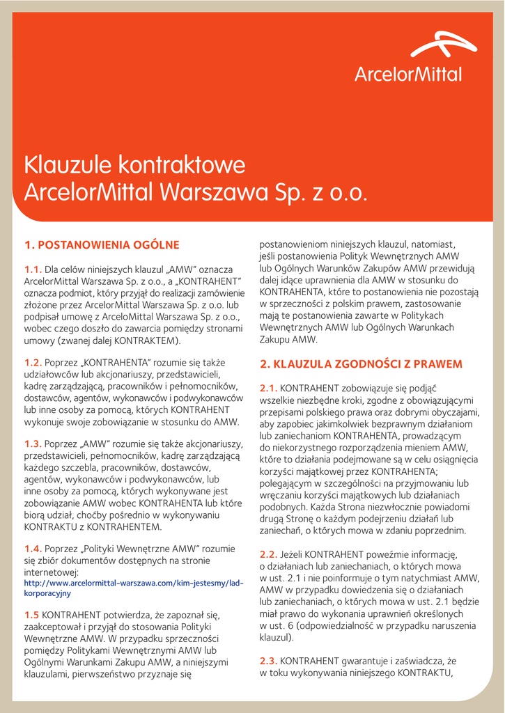 Klauzule kontraktowe ArcelorMittal Warszawa Sp. z o.o.