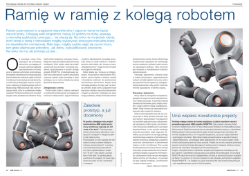 Koncepcja robota do montażu małych części Innowacje Ramię w ramię z kolegą robotem Roboty przemysłowe to urządzenia niezwykle silne i odporne niemal na każde warunki pracy. Dźwigają setki kilogramów, malują 24 godziny na dobę, spawają z niezwykłą szybkością i precyzją i... nie skarżą się. Na rynku nie ma jednak robota, który ramię w ramię z człowiekiem mógłby wykonywać precyzyjne manualne prace na niewielkiej linii montażowej. Mało tego, mógłby szybko zająć się czymś innym, tam gdzie właśnie jest potrzebny. Jak dobry, wykwalifikowany pracownik. Na rynku nie ma, ale prototyp już jest... O d pewnego czasu firmy zajmujące się produkcją elementów wymagających precyzji i szybkości zgłaszały zapotrzebowanie na rozwiązania w zakresie automatyki przemysłowej. Szczególnie zainteresowana robotyzacją była branża elektroniki użytkowej, gdzie na liniach montażowych wykorzystuje się małe elementy, a zmienność produkcji jest znaczna. Inżynierowie i naukowcy z Korporacyjnego Centrum Badawczego ABB pracowali więc nad koncepcją robota, który te oczekiwania mógłby zaspokoić. Podczas teoretycznych rozważań przyjęto cztery podstawowe założenia. Nowy robot ma być: bezpieczny, precyzyjny i zwinny, elastyczny, łatwy do zastosowania i ponownej konfiguracji. Dość szybko udało się przejść „od pomysłu do przemysłu” i koncepcja urządzenia, opracowywana w ramach dużego projektu ROSETTA, zmaterializowała się. Dziś nowy robot jest już w pełni funkcjonalną maszyną, jednak wciąż pozostaje w fazie prototypu, by na rynku znalazła się wersja absolutnie dopracowana. Zintegrowany i zwinny Potrafi radzić sobie z małymi częściami w systemach produkcyjnych wymagających zwinności i elastyczności. Jego konstrukcja i systemy zabezpieczeń pozwalają pracować ramię w ramię robotom i ludziom, zarówno obok siebie, jak i twarzą w twarz. „Współpracownicy” mogą również wchodzić we wzajemne interakcje. Robot składa się z korpusu ze zintegrowanym nowoczesnym sterownikiem IRC5, dwóch ramion (każde o siedmiu osiach) i chwytaków zdolnych do podnoszenia różnorodnych elementów. Każde ramię ma zasięg podobny do tego, jaki ma dorosły człowiek, dzięki czemu urządzenie może pracować w bardzo ciasnych przestrzeniach i sięgać po elementy znajdujące się poza swoją podstawą. Dzięki kinematycznemu przesztywnieniu ramion, łokcie robota mogą manewrować niezależnie od centralnego punktu urządzenia i pobierać części ułożone na najwyższych półkach. Taka zwinność jest nieznana w standardowych robotach sześcioosiowych. Używając algorytmów unikania kolizji w czasie rzeczywistym, zagwarantowanie wolnych od kolizji trajektorii ruchu obu ramion jest zapewnione bez ingerencji i zaangażowania użytkownika. Cały system może być również wyposażony w kamerę wizyjną. W grudniu ubiegłego roku projekt konstruktorów ABB został wyróżniony prestiżową nagrodą red dot „best of the best”. Prototypowego robota uhonorowano jako jedno z najlepszych rozwiązań w kategorii projektu dla miejsca pracy. Przyznawana co roku nagroda red dot stanowi znaną na arenie międzynarodowej „pieczęć jakości”, ocenianą i przyznawaną przez przemysłowe tuzy tylko najwybitniejszym projektom. W 2011 roku tytułem „red dot: best of the best” za wybitną jakość wyróżniono 34 projekty. W sumie zgłoszono do oceny 3,5 tys. konstrukcji i rozwiązań. 22 ABB Dzisiaj 1|12 Fot. na kolumnach: Arch ABB Zaledwie prototyp, a już doceniony Przenośny i bezpieczny Nowy robot to rozwiązanie kompaktowe, pasujące do ergonomicznie zaprojektowanych miejsc pracy ludzi. To pozwala na łatwą zamianę na stanowisku pracy między robotem a jego ludzkim kolegą współpracownikiem, kiedy zmienia się zamówienie produkcyjne albo projekt do realizacji. Robot został zaprojektowany tak, by można go było w łatwy sposób przenosić między różnymi stanowiskami montażowymi i by umożliwić połączenie pracy zrobotyzowanej i ręcznej przy niskim ryzyku, bez konieczności stosowania dodatkowych wymogów bezpieczeństwa, w ten sposób redukując próg dla automatyki. Jego waga jest niewielka, a przenoszenie nie wymaga żadnego mechanicznego wsparcia. Z jednofazowym wtykiem przewodu zasilającego urządzenie może być zainstalowane w jakimkolwiek miejscu na linii montażowej. Przy swojej iskrobezpiecznej konstrukcji stawia wymogi dotyczące przeprowadzania oceny bezpieczeństwa instalacji na poziomie minimalnym. Do użytkowania robota nie jest wymagana żadna ochrona ani obudowa, co pozwala na jego szybką instalację, uruchomienie i zmianę miejsca pracy. Oprac. Sławomir Dolecki Unia wspiera nowatorskie projekty Prototyp małego robota do ścisłej współpracy z ludźmi powstał w ramach prowadzonego przez ABB projektu ROSETTA. Cały program nazwany Robot Control for Skilled ExecuTion of Tasks (Sterowanie Robotem do Wykwalifikowanego Wykonywania Zadań) koncentruje się na naturalnej interakcji maszyny z człowiekiem. Według założeń roboty przemysłowe będę nie tylko przypominać człowieka, ale również współpracować z nim w sposób bezpieczny, a przy tym będą odbierane i postrzegane naturalnie. Takie roboty będą oprogramowane w sposób intuicyjny i nieskomplikowany, umożliwiając łatwe adaptowanie ich do nowych zadań, kiedy na linii produkcyjnej pojawi się nowy produkt. Projekt ma na celu wsparcie przemysłu poprzez rozwój technologii ułatwiających zastosowanie i integrację robotów przemysłowych do manualnie obsługiwanych linii produkcyjnych. Drugim, niezwykle istotnym założeniem projektu jest bezpieczna interakcja pomiędzy robotem i człowiekiem podczas pracy przy jednej linii produkcyjnej. W koncepcji ROSETTA robot nie musi być odseparowany od ludzi za pomocą fizycznych przegród lub barier. To oznacza, że musi być bezpieczny dla człowieka pod każdym względem. Projekt ROSETTA –
