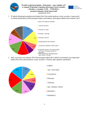 Wyniki ewaluacji projektu „Tolerancja – nasz wspólny cel” w ramach Programu Comenius dotyczącej wizyty uczniów z Niemiec w terminie 17.09. – 27.09.2014 r. przeprowadzonej wśród nauczycieli (październik 2014) 1. W jakich działaniach projektowych brał(a) Pan/ Pani udział podczas wizyty uczniów i nauczycieli ze szkoły partnerskiej (osoba przygotowująca, prowadząca, sprawująca opiekę nad uczniami, itp.)? 2. Jakie wycieczki oraz imprezy Pan/ Pani przygotował(a) lub w jakich wycieczkach oraz imprezach brał(a) Pan/ Pani udział podczas wizyty uczniów z Niemiec jako opiekun/ opiekunka? 1 3. Czy był(a) Pan/ Pani zaangażowany(a) w organizację i przebieg wymiany młodzieży w Lelowie? 4. Czy sądzi Pan/ Pani, że projekt pozwala zastanowić się nad własną historią i historią kraju partnerskiego oraz przełamać istniejące stereotypy? 5. Czy pobyt niemieckich uczniów i nauczycieli podczas wymiany w Lelowie wymagał od Pani/ Pana dużego zaangażowania czasowego i dużego nakładu pracy? 6. Czy uważa Pan/ Pani, że zawiązały się przyjaźnie pomiędzy polskimi i niemieckimi uczestnikami wymiany? 2 7. Czy pobyt uczniów i nauczycieli ze szkoły partnerskiej przyczynił się do większej motywacji nauki języków obcych? 8. Czy sądzi Pan/ Pani, że poprzez udział w wymianie projekt przyczynił się do wspierania wśród naszych uczniów i nauczycieli postaw otwartości, tolerancji i akceptacji inności? 9. Czy uważa Pan/ Pani, że projekt jest korzystny dla naszej szkoły, także poprzez promocję w mediach publicznych (gazety, biuletyny gminne, Internet)? 10. Czy oglądał(a)/ czytał(a) Pan/ Pani choćby raz informacje dotyczące projektu Comenius na stronie internetowej naszej szkoły? 3 11. Czy uzyskał(a) Pan/ Pani jakieś korzyści z udziału w działaniach projektowych podczas wizyty uczniów i nauczycieli ze szkoły partnerskiej? 12. Jakie problemy/ trudności związane były z pobytem grupy niemieckiej podczas wymiany? Bariera językowa (4 osoby); Dłuższy dzień pracy w szkole, nierealizowanie planowych godzin przedmiotowych (liczne zastępstwa); Opóźnienia w realizacji materiału na lekcjach spowodowane koniecznością udziału w działaniach projektowych, dłuższy dzień pracy w szkole; Organizacja czasu w domu i pracy. Częsta nieobecność w domu; Ograniczenia czasowe; Nie znam niemieckiego; Problemy komunikacyjne; Gospodarowanie czasem; Mój udział w większości działań projektowych w czasie wymiany spowodował nieodbycie się wielu lekcji. 13. W przebiegu wymiany w Lelowie najbardziej podobało mi się: Organizacja Dnia Przyjaźni, wycieczki, zajęcia dla uczniów; Spotkanie integracyjne, wspólne zajęcia, wycieczki, zajęcia artystyczne; Przyjazna atmosfera podczas spotkań z nauczycielami niemieckimi, zawarte nowe przyjaźnie; Ogólna atmosfera, przyjazne nastawienie niemieckich nauczycieli i uczniów, zawarte nowe przyjaźnie; Poznanie nowych ludzi, osobowości oraz zachowań kulturowych; Postawa otwartości niemieckich nauczycieli i uczniów, tolerancja ze strony polskich uczniów; Komunikatywność i serdeczność nauczycieli niemieckich; Spotkanie integracyjne w GOK; Wszystkie działania projektowe; Dzień Przyjaźni, wycieczki, warsztaty; Dzień Przyjaźni; Postawa otwartości uczniów i nauczycieli; Dzień Przyjaźni, wycieczki; Wspólne spędzanie czasu z uczestnikami wymiany oraz wycieczki; Dojrzewanie młodzieży do głębszego zrozumienia samych siebie oraz problemów otaczającego świata; Współpraca uczniów polskich i niemieckich podczas wszystkich warsztatów – czerpanie z nich radości; Pogłębienie się więzi między uczestnikami wymiany, zarówno uczniami, jak i nauczycielami; Przyjazna atmosfera podczas realizacji działań projektowych. 4 14. W przebiegu wymiany w Lelowie nie podobało mi się: Konieczność organizowania czasu dla uczniów niebiorących udziału wymianie – zastępstwa; Zaangażowanie tylko nielicznych nauczycieli; Nie ma takiej sytuacji; Wszystkie działania mi się podobały; Wszystko się podobało; Wszystko mi się podobało podczas wymiany uczniów w Lelowie; Zbyt duże obciążenie pracą, prawie codziennie od rana do wieczora. 15. Chciałabym/ chciałbym zasugerować następujące rozwiązania w celu poprawy realizacji projektu w drugim roku: Zaangażować nauczycieli, którzy mniej pracy włożyli w działania w 2014 r.; Uważam, że wszystko jest dobrze realizowane; Było w porządku; Większe zaangażowanie nauczycieli nie biorących udziału w Comeniusie. Ankieta dla nauczycieli zawierała 11 pytań zamkniętych i 4 pytania otwarte, została wypełniona przez 17 nauczycieli. Ankieta była anonimowa. W poszczególne działania projektowe było zaangażowanych od 2 do 5 nauczycieli: w warsztaty ze sztuki, warsztaty z piosenki i w tworzenie scenek w języku angielskim – po 2 nauczycieli, w Quiz Wiedzy o Europie – 3 nauczycieli, w pracę nad kodeksem tolerancji, warsztaty sportowe, występ podczas Dnia Przyjaźni i wystawienie spektaklu „Mały Książę” – po 4 nauczycieli, w warsztaty taneczne – 5 nauczycieli. Wielu nauczycieli przygotowało i brało udział w wycieczkach i innych imprezach: wycieczka do Częstochowy – 2 nauczycieli, wycieczka do Krakowa, na Jurę – Złoty Potok, do Oświęcimia i Wieliczki – po 3 nauczycieli, wycieczka na Jurę – Bobolice i Mirów oraz dyskoteka II – po 4 nauczycieli, dyskoteka I – 6 nauczycieli . 7 nauczycieli (tj. 41%) w dużym stopniu, 7 częściowo i 2 w niewielkim stopniu było zaangażowanych w organizację i przebieg wymiany młodzieży w Lelowie. Jedna osoba nie udzieliła odpowiedzi na to pytanie. Według 82% ankietowanych projekt pozwala zastanowić się nad własną historią i historią Niemiec oraz przełamać istniejące stereotypy. Pobyt niemieckich uczniów i nauczycieli podczas wymiany w Lelowie wymagał dużego zaangażowania czasowego i dużego nakładu pracy od 7 nauczycieli (tj. 41%), częściowego zaanga