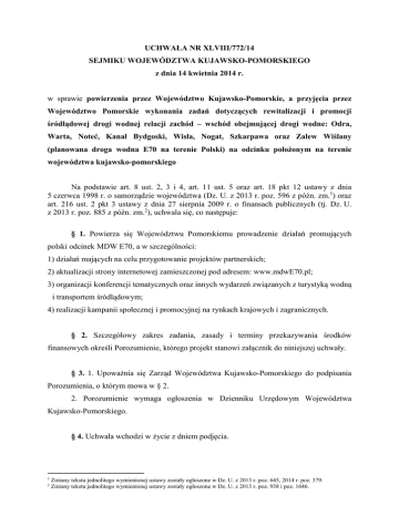 UCHWAŁA NR XLVIII/772/14 SEJMIKU WOJEWÓDZTWA KUJAWSKO-POMORSKIEGO z dnia 14 kwietnia 2014 r. w sprawie powierzenia przez Województwo Kujawsko-Pomorskie, a przyjęcia przez Województwo Pomorskie wykonania zadań dotyczących rewitalizacji i promocji śródlądowej drogi wodnej relacji zachód – wschód obejmującej drogi wodne: Odra, Warta, Noteć, Kanał Bydgoski, Wisła, Nogat, Szkarpawa oraz Zalew Wiślany (planowana droga wodna E70 na terenie Polski) na odcinku położonym na terenie województwa kujawsko-pomorskiego Na podstawie art. 8 ust. 2, 3 i 4, art. 11 ust. 5 oraz art. 18 pkt 12 ustawy z dnia 5 czerwca 1998 r. o samorządzie województwa (Dz. U. z 2013 r. poz. 596 z późn. zm.1) oraz art. 216 ust. 2 pkt 3 ustawy z dnia 27 sierpnia 2009 r. o finansach publicznych (tj. Dz. U. z 2013 r. poz. 885 z późn. zm.2), uchwala się, co następuje: § 1. Powierza się Województwu Pomorskiemu prowadzenie działań promujących polski odcinek MDW E70, a w szczególności: 1) działań mających na celu przygotowanie projektów partnerskich; 2) aktualizacji strony internetowej zamieszczonej pod adresem: www.mdwE70.pl; 3) organizacji konferencji tematycznych oraz innych wydarzeń związanych z turystyką wodną i transportem śródlądowym; 4) realizacji kampanii społecznej i promocyjnej na rynkach krajowych i zagranicznych. § 2. Szczegółowy zakres zadania, zasady i terminy przekazywania środków finansowych określi Porozumienie, którego projekt stanowi załącznik do niniejszej uchwały. § 3. 1. Upoważnia się Zarząd Województwa Kujawsko-Pomorskiego do podpisania Porozumienia, o którym mowa w § 2. 2. Porozumienie wymaga ogłoszenia w Dzienniku Urzędowym Województwa Kujawsko-Pomorskiego. § 4. Uchwała wchodzi w życie z dniem podjęcia. 1 2 Zmiany tekstu jednolitego wymienionej ustawy zostały ogłoszone w Dz. U. z 2013 r. poz. 645, 2014 r. poz. 379. Zmiany tekstu jednolitego wymienionej ustawy zostały ogłoszone w Dz. U. z 2013 r. poz. 938 i poz. 1646. UZASADNIENIE 1. Przedmiot regulacji: Z uwagi na przebieg planowanej Międzynarodowej Drogi Wodnej E70 przez obszar województw pomorskiego i kujawsko-pomorskiego, zasadnym jest opracowanie spójnej dokumentacji wspierającej aktywizację turystyczno-gospodarczą całej drogi wodnej. Kompleksowa rewitalizacja Międzynarodowej Drogi Wodnej E70 jest zadaniem niezwykle złożonym i kosztownym. Działania podjęte w latach 2010-2013 doprowadziły do powstania: − strategii programowej, − koncepcji programowo-przestrzennej przedsięwzięcia, − analizy środowiskowej (prognoza oddziaływania na środowisko) projektu programu określonego w koncepcji programowo-przestrzennej, − strony internetowej projektu, − analizy popytu, − analizy społeczno-ekonomicznej, − strategii promocji, − przewodnika i map dla wodniaków, − katalogu dostępności usług wzdłuż drogi wodnej, − filmu promującego turystyczne walory drogi wodnej. Na 2014 r. zaplanowano wykonanie następujących zadań: − prowadzenie działań promujących polski odcinek MDW E70 m.in. poprzez udział i wystawiennictwo w targach branżowych, aktualizację strony internetowej zamieszczonej pod adresem www.mdwE70.pl, organizacji konferencji tematycznych, wizyt studyjnych, realizacji kampanii społecznej i promocyjnej na rynkach krajowych i zagranicznych oraz przygotowanie i publikacja materiałów promocyjnych (w tym filmów). 2. Omówienie podstawy prawnej: Zgodnie z art. 8 ust. 2 ustawy z dnia 5 czerwca 1998 r. o samorządzie województwa (Dz. U. z 2013 r. poz. 596 z późn. zm.) województwo może zawierać z innymi województwami oraz jednostkami lokalnego samorządu terytorialnego z województwa porozumienia w sprawie powierzenia prowadzenia zadań publicznych. obszaru Zgodnie z art. 8 ust. 3 ustawy z dnia 5 czerwca 1998 r. o samorządzie województwa (Dz. U. z 2013 r. poz. 596 z późn. zm.) do porozumień stosuje się odpowiednio przepisy ustawy z dnia 8 marca 1990 r. o samorządzie gminnym (Dz. U. z 2013 r. poz. 594). Zgodnie z art. 8 ust. 4 ustawy z dnia 5 czerwca 1998 r. o samorządzie województwa (Dz. U. z 2013 r. poz. 596 z późn. zm.) porozumienia, o których mowa w art. 8 ust. 2, podlegają ogłoszeniu w wojewódzkim dzienniku urzędowym. Zgodnie z art. 11 ust. 5 ustawy z dnia 5 czerwca 1998 r. o samorządzie województwa (Dz. U. z 2013 r. poz. 596 z późn. zm.) wykonywanie zadań związanych z rozwojem regionalnym na obszarze województwa należy do samorządu województwa. Zasady finansowania rozwoju regionalnego oraz źródła dochodów województwa w tym zakresie określają odrębne ustawy. Zgodnie z art. 18 pkt 12 ustawy z dnia 5 czerwca 1998 r. o samorządzie województwa (Dz. U. z 2013 r. poz. 596 z późn. zm.) do wyłącznej właściwości sejmiku województwa należy podejmowanie uchwał w sprawie powierzenia zadań samorządu województwa innym jednostkom samorządu terytorialnego. Zgodnie z art. 216 ust 2 pkt 3 ustawy z dnia 27 sierpnia 2009 r. o finansach publicznych (Dz. U. z 2013 r. poz. 885 z późn. zm.) wydatki budżetu jednostki samorządu terytorialnego są przeznaczone na realizację zadań określonych w odrębnych przepisach, a w szczególności na zadania przejęte przez jednostki samorządu terytorialnego do realizacji w drodze umowy lub porozumienia. 3. Konsultacje wymagane przepisami prawa (łącznie z przepisami wewnętrznymi): Nie dotyczy 4. Uzasadnienie merytoryczne: Pozytywne zaopiniowanie projektu uchwały w sprawie powierzenia Województwu Pomorskiemu wykonania zadań dotyczących rewitalizacji śródlądowej drogi wodnej relacji zachód - wschód obejmującej drogi wodne: Odra, Warta, Noteć, Kanał Bydgoski, Wisła, Nogat, Szkarpawa oraz Zalew Wiślany (planowana droga wodna E70 na terenie Polski) na odcinku położonym na terenie województwa kujawsko-pomorskiego i powierzenie Województwu Pomorskiemu przez Województwo Kujawsko-Pomorskie wykonania przedmiotowych zadań pozwoli na wykonania przedm