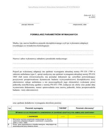 Specyfikacja Istotnych Warunków Zamówienia ZP 07/CPR/2013 Załącznik Nr 1 do SIWZ ............................................. pieczęć oferenta ............................................. miejscowość, data FORMULARZ PARAMETRÓW WYMAGANYCH Marka, typ, nazwa handlowa pojazdu skompletowanego czyli po wykonaniu adaptacji (wynikająca ze świadectwa homologacji): ………………………………………………………………………………………………… ………………………………………………………………………………………………… Nazwa i adres wykonawcy zabudowy przedziału medycznego: ………………………………………………………………………………………………… ………………………………………………………………………………………………… Pojazd po wykonanej adaptacji ma spełniać wymagania aktualnej normy PN EN 1789 w zakresie ambulansu typu C, sprzęt medyczny ma spełniać wymagania aktualnej normy PN EN 1865 (lub norm równowaŜnych), ma posiadać dokument np. certyfikat potwierdzający pozytywnie przeprowadzone dynamiczne badania wytrzymałościowe (kompleksowe testy zderzeniowe całego ambulansu a nie poszczególnych jego elementów) wykonane przez jednostkę notyfikowaną zgodnie z normą PN-EN 1789, (załączyć do oferty oraz podać datę wystawienia dokumentu, numer sprawozdania oraz nazwę jednostki, która przeprowadziła badania - testy zderzeniowe): ………………………………………………………………………………………………… ………………………………………………………………………………………………… oraz spełniać dodatkowe wymagania określone poniŜej: Lp Parametr wymagany TAK/NIE* Parametr oferowany* WYMOGI CO DO PRZEDMIOTU ZAMÓWIENIA W ZAKRESIE ADAPTACJI NA AMBULANS SANITARNY I. NADWOZIE 1. 2. Minimalne wymiary przedziału medycznego w mm po wykonaniu adaptacji (długość x szerokość x wysokość) 3250 x 1700 x 1850 Drzwi tylne wyposaŜone w światła awaryjne, włączające się automatycznie przy otwarciu drzwi. ------- ------------------------------------ Specyfikacja Istotnych Warunków Zamówienia ZP 07/CPR/2013 3. 4. Ściany boczne przedziału medycznego mają być przystosowane do zamocowania foteli oraz innego wyposaŜenia. Zewnętrzny schowek za lewymi drzwiami przesuwnymi (oddzielony od przedziału medycznego i dostępny z zewnątrz pojazdu), z miejscem mocowania min. 2 szt. butli tlenowych 10l, krzesełka kardiologicznego, noszy podbierakowych, materaca próŜniowego oraz deski ortopedycznej dla dorosłych. Poprzez drzwi lewe ma być zapewniony dostęp do min. 2 szt. plecaków / toreb medycznych umieszczonych w przedziale medycznym (tzw. podwójny dostęp do plecaków/toreb – z przedziału medycznego i z zewnątrz pojazdu) II. OGRZEWANIE WENTYLACJA KLIMATYZACJA 1. 2. 3. 4. 5. 6. 2. ------------------------------------ ------- ------------------------------------ Nagrzewnica w przedziale medycznym wykorzystująca ciecz chłodzącą silnik, umoŜliwiająca wykorzystanie fabrycznego niezaleŜnego od pracy silnika ogrzewania postojowego do ogrzewania przedziału medycznego; ogrzewanie przedziału medycznego moŜliwe zarówno przy włączonym jak i wyłączonym silniku pojazdu, ogrzewanie przedziału medycznego z moŜliwością ustawienia temperatury i termostatem (podać markę i model nagrzewnicy) Postojowe – 2 grzejniki elektryczne z moŜliwością ustawienia temperatury termostatem i zabezpieczeniem o mocy min. 1.8 kW zasilane z sieci 230 V (podać markę i model urządzenia) NiezaleŜne od pracy silnika i układu chłodzenia silnika z moŜliwością ustawienia temperatury i termostatem o mocy min. 3,5 kW tzw. powietrzne (proszę podać markę i model urządzenia), Wentylacja mechaniczna, nawiewno – wywiewna, zapewniająca prawidłową wentylację przedziału medycznego i zapewniająca wymianę powietrza min 20 razy na godzinę w czasie postoju (proszę podać markę, 3 model i wydajność w m /h), Szyberdach pełniący jednocześnie funkcję wyjścia ewakuacyjnego o wymiarach min. 800 mm x 500 mm sterowany (otwierany/zamykany manualnie lub elektrycznie). Rozbudowa klimatyzacji fabrycznej kabiny kierowcy na przedział medyczny (klimatyzacja dwuparownikowa). III. INSTALACJA ELEKTRYCZNA 1. ------- Instalacja dla napięcia 230V w kompletacji: 1. minimum dwa gniazda poboru prądu w przedziale medycznym zasilane z gniazda umieszczonego na zewnątrz, 2. zabezpieczenie przed uruchomieniem silnika przy podłączonym zasilaniu 230V, 3. wyłącznik przeciwporaŜeniowy, 4. układ prostowniczy słuŜący do ładowania akumulatorów dwóch fabrycznych akumulatorów działający przy podłączonej instalacji 230V, 5. grzałka w układzie chłodzenia cieczą silnika pojazdu zasilana z sieci 230V. 6. wizualna sygnalizacja podłączenia pojazdu do sieci 230V, Instalacja dla napięcia 12V i oświetlenie przedziału medycznego: 1. powinna posiadać co najmniej 4 gniazda 12V zabezpieczone przed zabrudzeniem / zalaniem wyposaŜone we wtyki poboru prądu umiejscowione na lewej ścianie, Specyfikacja Istotnych Warunków Zamówienia ZP 07/CPR/2013 3. 4. 5. 2. powinna posiadać minimum 6 punktów oświetlenia rozproszonego typu LED, 3. powinna posiadać minimum 2 punkty oświetlenia halogenowego z regulacją kąta umieszczone nad noszami, 4. oświetlenie halogenowe blatu roboczego – minimum 1 punkt, Przedział medyczny ma być wyposaŜony w panel sterujący: 1. informujący o temperaturze w przedziale medycznym oraz na zewnątrz pojazdu 2. z funkcją zegara (aktualny czas) i kalendarza (dzień, data) 3. informujący o temperaturze wewnątrz termoboxu 4. sterujący oświetleniem przedziału medycznego z 5. sterujący systemem wentylacji przedziału medycznego 6. zarządzający system ogrzewania przedziału medycznego i klimatyzacji przedziału medycznego z funkcją automatyczne