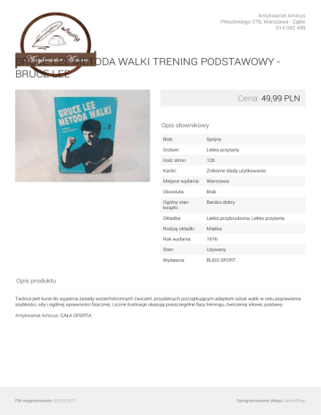 Antykwariat Amicus Piłsudskiego 37B, Warszawa - Ząbki 514 092 499 BRUCE LEE METODA WALKI TRENING PODSTAWOWY BRUCE LEE Cena: 49,99 PLN Opis słownikowy Blok: Spójny Grzbiet: Lekko przytarty Ilość stron: 128 Kartki: Znikome ślady użytkowania Miejsce wydania: Warszawa Obwoluta: Brak Ogólny stan książki: Bardzo dobry Okładka: Lekko przybrudzona, Lekko przytarta Rodzaj okładki: Miękka Rok wydania: 1976 Stan: Używany Wydawca: BUDO SPORT Opis produktu Twórca jeet kune do wyjaśnia zasady wszechstronnych ćwiczeń, przydatnych początkującym adeptom sztuk walki w celu poprawienia szybkości, siły i ogólnej sprawności fizycznej. Liczne ilustracje ukazują poszczególne fazy treningu, ćwiczenia siłowe, postawy. Antykwariat Amicus- CAŁA OFERTA Plik wygenerowano: 03-03-2017 Powered by TCPDF (www.tcpdf.org) Oprogramowanie sklepu: AptusShop