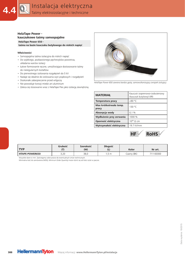 Instalacja elektryczna 4.4 Taśmy elektroizolacyjne i techniczne HelaTape Power kauczukowe taśmy samospajalne HelaTape Power 650 taśma na bazie kauczuku butylowego do niskich napięć Właściwości • Samospajalna taśma izolacyjna do niskich napięć • Do szybkiego, pozbawionego pęcherzyków powietrza, układania warstw izolacji • Łatwe formowanie ręczne, umożliwiające dostosowanie taśmy do nieregularnych kształtów • Do pierwotnego izolowania rozgałęzień do 5 kV • Nadaje się idealnie do izolowania szyn prądowych i rozgałęzień • Doskonałe zabezpieczenie przed wilgocią • Nie powoduje korozji miedzi ani aluminium • Zaleca się stosowanie wraz z HelaTape Flex jako izolacją zewnętrzną TYP HTAPE-POWER650 HelaTape Power 650 zawiera bardzo gęsty, samowulkanizujący związek izolujący. MATERIAŁ Kauczuk izoprenowo-izobutenowy (kauczuk butylowy) (IIR) Temperatura pracy +90 °C Max krótkotrwała temp. pracy 130 °C Absorpcja wody 0,1 % Wydłużenie przy zerwaniu 1000 % Oporność elektryczna 10¹⁴ Ω cm Wytrzymałość elektryczna 19.7 kV/mm Grubość (T) Szerokość (W) Długość (L) Kolor Nr art. 3,20 38,0 1,5 m Czarny (BK) 711-00300 Data wydania: 10/2015 Wszystkie dane w mm. Zastrzegamy sobie prawo do ewentualnych zmian technicznych. Minimalna ilość do zamówienia (MOQ, Minimum Order Quantity) może różnić się od ilości sztuk w paczce. 388 Więcej informacji: www.HellermannTyton.pl/instalacja