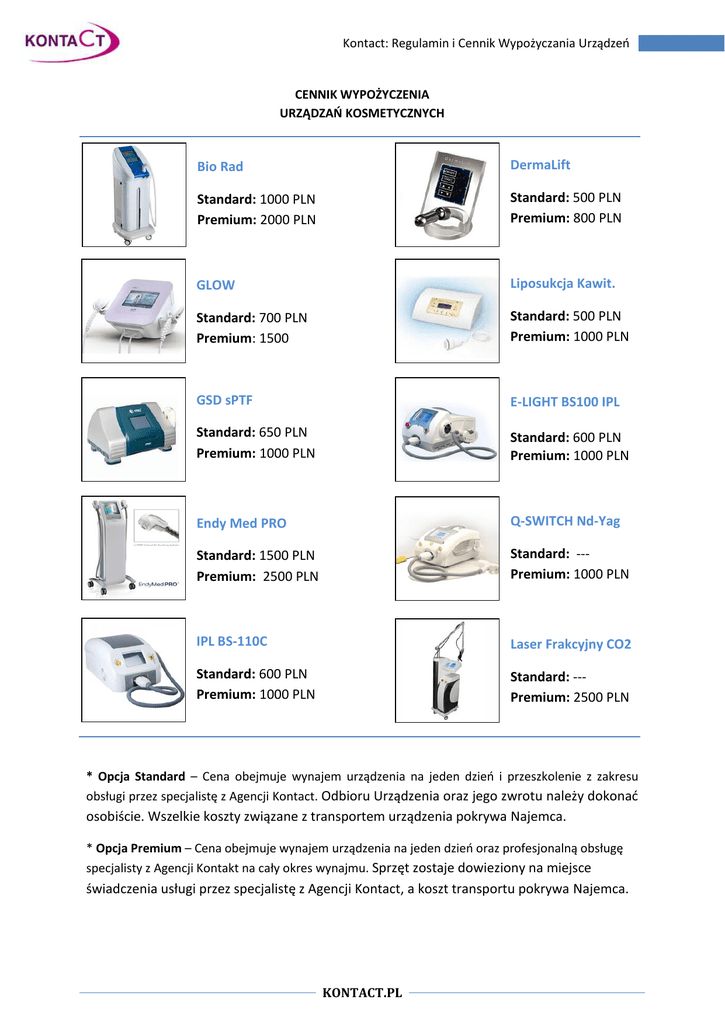 Kontact: Regulamin i Cennik Wypożyczania Urządzeń CENNIK WYPOŻYCZENIA URZĄDZAŃ KOSMETYCZNYCH Bio Rad DermaLift Standard: 1000 PLN Premium: 2000 PLN Standard: 500 PLN Premium: 800 PLN GLOW Liposukcja Kawit. Standard: 700 PLN Premium: 1500 Standard: 500 PLN Premium: 1000 PLN GSD sPTF E-LIGHT BS100 IPL Standard: 650 PLN Premium: 1000 PLN Standard: 600 PLN Premium: 1000 PLN Endy Med PRO Q-SWITCH Nd-Yag Standard: 1500 PLN Premium: 2500 PLN Standard: --Premium: 1000 PLN IPL BS-110C Laser Frakcyjny CO2 Standard: 600 PLN Premium: 1000 PLN Standard: --Premium: 2500 PLN * Opcja Standard – Cena obejmuje wynajem urządzenia na jeden dzień i przeszkolenie z zakresu obsługi przez specjalistę z Agencji Kontact. Odbioru Urządzenia oraz jego zwrotu należy dokonać osobiście. Wszelkie koszty związane z transportem urządzenia pokrywa Najemca. * Opcja Premium – Cena obejmuje wynajem urządzenia na jeden dzień oraz profesjonalną obsługę specjalisty z Agencji Kontakt na cały okres wynajmu. Sprzęt zostaje dowieziony na miejsce świadczenia usługi przez specjalistę z Agencji Kontact, a koszt transportu pokrywa Najemca. KONTACT.PL Agencja Kontact Hurtownia Kosmetyki Profesjonalnej REGULAMIN WYPOŻYCZANIA SPRZĘTU KOSMETYCZNEGO §1 Agencja Kontact z siedzibą we Wrocławiu przy ul Komuny Paryskiej 39-41, oświadcza, iż prowadzi wypożyczalnię urządzeń kosmetycznych, zwaną dalej Wypożyczalnią. §2 Agencja Kontact oświadcza, iż jest dysponentem urządzeń będących na stanie Wypożyczalni. §3 Agencja Kontact prowadzi ewidencję usług, związanych w wypożyczaniem urządzeń. Ta zawiera w szczególności: dane osoby, dla której urządzenie zostało wypożyczone, datę wypożyczenia, rodzaj wypożyczonego urządzenia, okres wypożyczenia i wysokość opłat za okres wypożyczenia oraz stan techniczny, w jakim urządzenie zostało oddane §4 Na wniosek osoby zainteresowanej, zwanej dalej: Najemcą, Agencja Kontact wypożycza urządzenie kosmetyczne dla wyłącznego użytku Najemcy. §5 1. Wniosek Najemcy urządzenie w Opcji Standard (bez obsługi specjalisty z Agencji Kontact) musi być poparty aktualnym potwierdzeniem kwalifikacji z zakresu obsługi urządzenia. 2. Najemca nieposiadający takiego potwierdzenia jest zobowiązany do skorzystania z przeszkolenia przez specjalistę z Agencji Kontact, które uwzględnione jest w cenie wypożyczenia (Opcja Standard). 3. Najemca może skorzystać z kompleksowej obsługi świadczonej przez specjalistę z Agencji Kontact przez cały okres trwania najmu za dodatkową opłatą (Opcja Premium). §6 Decyzję o wypożyczeniu sprzętu podejmuje upoważniona przez Właściciela Agencji Kontact osoba, na podstawie niezbędnych dokumentów i w oparciu o niniejszy Regulamin. §7 Wypożyczenie sprzętu wymaga podpisania protokołu zdawczo-odbiorczego dotyczącego wypożyczenia Urządzenia pomiędzy Agencją Kontact i Najemcą zwanej dalej Umową. Ul. Komuny Paryskiej 39-41 50-451 Wrocław www.Kontact.pl Agencja Kontact Hurtownia Kosmetyki Profesjonalnej §8 1. Agencja Kontact w Umowie Wypożyczenia określa wysokość opłaty dziennej za wypożyczony sprzęt, rodzaj wypożyczonego sprzętu oraz okres wypożyczenia sprzętu. 2. Agencja Kontact wypożycza Urządzenie po uiszczeniu opłaty w wysokości zgodnej z aktualnym cennikiem 3. Odbioru Urządzenia oraz jego zwrotu w Opcji Standard Najemca jest zobowiązany dokonać osobiście. Wszelkie koszty związane z transportem urządzenia pokrywa Najemca. 4. W Opcji Premium Najemcy zapewniona zostaje profesjonalna obsługa specjalisty z Agencji Kontact na czas wypożyczenia sprzętu. W tym przypadku Urządzenie dowiezione zostaje na miejsce świadczenia usługi przez specjalistę z Agencji Kontact, a koszt transportu pokrywa Najemca. 5. Najemca jest zobowiązany do zwrócenia Urządzenia w terminie i w niepogorszonym stanie technicznym. Za wszelkie uszkodzenia Urządzenia powstałe w okresie wynajmu odpowiada finansowo Najemca. Dotyczy to w szczególności niewłaściwego użytkowania i niewłaściwych warunków transportu urządzenia. Ul. Komuny Paryskiej 39-41 50-451 Wrocław www.Kontact.pl