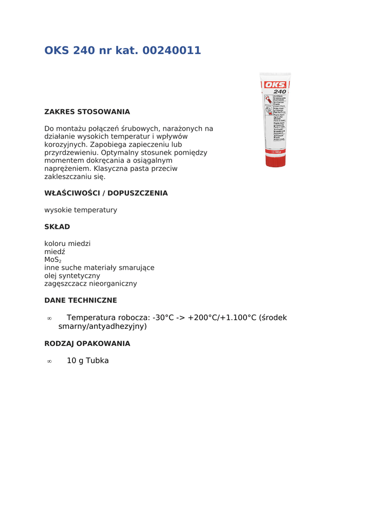 OKS 240 nr kat. 00240011 ZAKRES STOSOWANIA Do montażu połączeń śrubowych, narażonych na działanie wysokich temperatur i wpływów korozyjnych. Zapobiega zapieczeniu lub przyrdzewieniu. Optymalny stosunek pomiędzy momentem dokręcania a osiągalnym naprężeniem. Klasyczna pasta przeciw zakleszczaniu się. WŁAŚCIWOŚCI / DOPUSZCZENIA wysokie temperatury SKŁAD koloru miedzi miedź MoS2 inne suche materiały smarujące olej syntetyczny zagęszczacz nieorganiczny DANE TECHNICZNE • Temperatura robocza: -30°C -> +200°C/+1.100°C (środek smarny/antyadhezyjny) RODZAJ OPAKOWANIA • 10 g Tubka OKS 250 nr kat. 00250034 Smar do montażu wtryskiwaczy oraz do śrub i powierzchni ślizgowych, narażonych na wysokie naciski i temperatury. Optymalny stosunek pomiędzy momentem dokręcania śrub a osiągalnym naprężeniem. Nie zawiera metali. Bardzo dobra ochrona antykorozyjna. Uniwersalna pasta do wysokich temperatur. Dla połączeń ze stali szlachetnej. WŁAŚCIWOŚCI / DOPUSZCZENIA wysokie temperatury, obciążenie naciskiem, wpływ wody, ochrona antykorozyjna, nieszkodliwe na stanowisku pracy SKŁAD biała białe suche materiały smarujące Aktywne Mox olej syntetyczny polimocznik DANE TECHNICZNE • Temperatura robocza: -40°C -> +200°C/+1.400°C (środek smarny/antyadhezyjny) RODZAJ OPAKOWANIA • 1 kg Puszka OKS 611 nr kat. 00611004 ZAKRES STOSOWANIA Do nieniszczącego demontażu zakleszczonych lub zardzewiałych części maszyn. Bardzo dobre właściwości pełzania. Wypiera wilgoć. Dobre właściwości smarowe dzięki MoS2. Uniwersalny preparat do usuwania rdzy do zastosowań w przemyśle, warsztacie i przy majsterkowaniu. SKŁAD kolor szary MoS2 olej mineralny DANE TECHNICZNE Dla uzyskania optymalnego działania należy mechanicznie oczyścić odpowiednie miejsca. Natryskiwać w dużej ilości i pozostawić na chwilę do działania. W razie potrzeby powtórzyć operację. Temperatura robocza: -30°C - +50°. RODZAJ OPAKOWANIA • *400 ml spray OKS 621 nr kat. 00621004 ZAKRES STOSOWANIA Nieniszczący demontaż zakleszczonych lub zardzewiałych części maszyn. Kruszenie warstw rdzy przez schłodzenie do -40°C. Penetracja oleju w mikropęknięciach. Szybko działający preparat do usuwania rdzy do zastosowań w przemyśle, warsztacie i przy majsterkowaniu. WŁAŚCIWOŚCI / DOPUSZCZENIA Niskie temperatury. SKŁAD kolor jasny olej mineralny rozpuszczalniki DANE TECHNICZNE Przed użyciem usunąć zgrubne zanieczyszczenia. Dobrze wstrząsnąć puszkę. Natryskiwać z odległości 10 - 15 cm i pozostawić na ok. 1 - 2 minuty. W razie potrzeby powtórzyć operację. Temperatura robocza: -10°C - +40°C. RODZAJ OPAKOWANIA • *400 ml spray OKS 701 nr kat. 00701001 ZAKRES STOSOWANIA Do smarowania i pielęgnacji elementów maszyn z zakresu mechaniki precyzyjnej. Nie zawiera żywic i kwasów. Dobre właściwości pełzania. Bardzo dobra zdolność zwilżania. Nie niszczy tworzyw sztucznych. Do stosowania w przyrządach pomiarowych, w technice optycznych konstrukcji precyzyjnych. WŁAŚCIWOŚCI / DOPUSZCZENIA Stosowany przez lotnictwo w NATO. Niskie temperatury; wpływy atmosferyczne; wpływ wody; ochrona antykorozyjna; nieszkodliwe na stanowisku pracy. SKŁAD kolor jasny poliizobutylen DANE TECHNICZNE • Temperatura robocza: -50°C -> +100°C RODZAJ OPAKOWANIA • 400 ml spray OKS 1110 nr kat. 01110011 ZAKRES ZASTOSOWANIA Smar silikonowy o uniwersalnym zastosowaniu, również w przemyśle spożywczym. Do armatur, uszczelnień i części z tworzywa sztucznego. Odporny na media. Bardzo dobrze tolerowany przez tworzywa sztuczne. Nie wysycha, ani nie przenika międzywarstwowo. Neutralny w smaku i zapachu. Mocno przylegający. WŁAŚCIWOŚCI / DOPUSZCZENIA Wysokie temperatury; wpływ wody; nieszkodliwe na stanowisku pracy; do stosowania w przemyśle spożywczym. SKŁAD kolor przezroczysty olej silikonowy zagęszczacz nieorganiczny DANE TECHNICZNE • TEMPERATUROWY ZAKRES ZASTOSOWANIA: -40°C do +200°C RODZAJ OPAKOWANIA • 10 g tubka OKS 2661 nr kat. 02661006 ZAKRES STOSOWANIA Do części maszyn i powierzchni z oleistymi i tłustymi zanieczyszczeniami. Paruje szybko i bez pozostałości. Wysoka wydajność czyszczenia. Idealny do przygotowywania spoin klejowych i do czyszczenia miejsc smarowania. Środki czyszczące do hamulców. WŁAŚCIWOŚCI / DOPUSZCZENIA Nieszkodliwe na stanowisku pracy. SKŁAD kolor bezbarwny mieszanka rozpuszczalników DANE TECHNICZNE Z nadmiarem powlec czyszczone powierzchnie wzgl. spryskać je z bliskiej odległości i ewentualnie przetrzeć powierzchnię szmatami. Następnie pozwolić wyschnąć w temperaturze pomieszczenia przez ok. 1 minutę. Przed zastosowaniem na powierzchniach z tworzyw sztucznych i powierzchniach lakierowanych sprawdzić ich odporność. RODZAJ OPAKOWANIA • *600 ml spray OKS 2701 nr kat. 02701004 ZAKRES STOSOWANIA Szybkie chłodzenie małych powierzchni i części do -45°C. Symulacja warunków rozruchu silników samochodowych w niskich temperaturach. Pozwala na wyszukiwanie przerw, powodowanych wpływami temperaturowymi. Chroni sąsiadujące obszary podczas lutowania i spawania. Łatwiejszy montaż połączeń wtłaczanych. SKŁAD Bezbarwny gazy czynne lub gazy pędne DANE TECHNICZNE Natryskiwanie chłodzonych części aż do osiągnięcia wymaganej temperatury. Nie stosować pod napięciem i trzymać z dala od źródeł ognia. OKS 2701 paruje szybko i bez pozostałości. RODZAJ OPAKOWANIA spray 400 ml