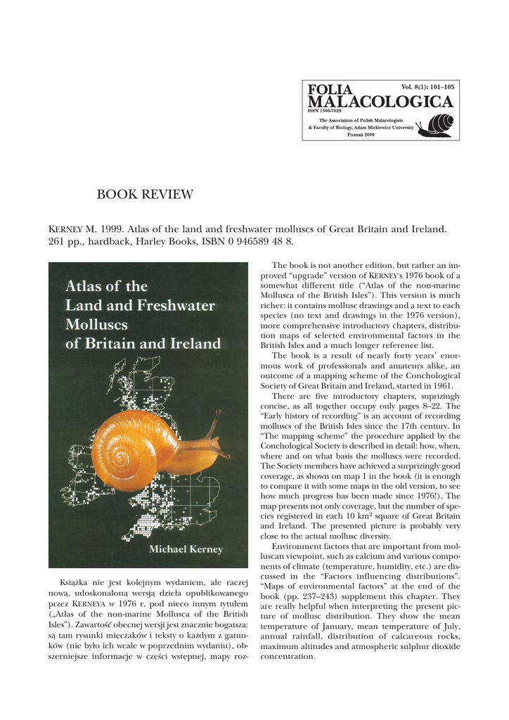 BOOK REVIEW KERNEY M. 1999. Atlas of the land and freshwater molluscs of Great Britain and Ireland. 261 pp., hardback, Harley Books, ISBN 0 946589 48 8. Ksi¹¿ka nie jest kolejnym wydaniem, ale raczej now¹, udoskonalon¹ wersj¹ dzie³a opublikowanego przez KERNEYA w 1976 r. pod nieco innym tytu³em („Atlas of the non-marine Mollusca of the British Isles”). Zawartoœæ obecnej wersji jest znacznie bogatsza: s¹ tam rysunki miêczaków i teksty o ka¿dym z gatunków (nie by³o ich wcale w poprzednim wydaniu), obszerniejsze informacje w czêœci wstêpnej, mapy roz- The book is not another edition, but rather an improved “upgrade” version of KERNEY’s 1976 book of a somewhat different title (“Atlas of the non-marine Mollusca of the British Isles”). This version is much richer: it contains mollusc drawings and a text to each species (no text and drawings in the 1976 version), more comprehensive introductory chapters, distribution maps of selected environmental factors in the British Isles and a much longer reference list. The book is a result of nearly forty years’ enormous work of professionals and amateurs alike, an outcome of a mapping scheme of the Conchological Society of Great Britain and Ireland, started in 1961. There are five introductory chapters, suprizingly concise, as all together occupy only pages 8–22. The “Early history of recording” is an account of recording molluscs of the British Isles since the 17th century. In “The mapping scheme” the procedure applied by the Conchological Society is described in detail: how, when, where and on what basis the molluscs were recorded. The Society members have achieved a surprizingly good coverage, as shown on map 1 in the book (it is enough to compare it with some maps in the old version, to see how much progress has been made since 1976!). The map presents not only coverage, but the number of species registered in each 10 km2 square of Great Britain and Ireland. The presented picture is probably very close to the actual mollusc diversity. Environment factors that are important from molluscan viewpoint, such as calcium and various components of climate (temperature, humidity, etc.) are discussed in the “Factors influencing distributions”. “Maps of environmental factors” at the end of the book (pp. 237–243) supplement this chapter. They are really helpful when interpreting the present picture of mollusc distribution. They show the mean temperature of January, mean temperature of July, annual rainfall, distribution of calcareous rocks, maximum altitudes and atmospheric sulphur dioxide concentration. 102 Andrzej Piechocki, Beata M. Pokryszko mieszczenia wybranych czynników œrodowiskowych w Wielkiej Brytanii i Irlandii oraz znacznie wiêcej pozycji bibliograficznych. Ksi¹¿ka jest wynikiem prawie czterdziestu lat ogromnej pracy malakologów-zawodowców i amatorów, efektem programu sporz¹dzania map rozmieszczenia rozpoczêtego w 1961 roku przez Conchological Society of Great Britain and Ireland. Rozdzia³ów wprowadzaj¹cych jest piêæ, zaskakuj¹co zwiêz³ych, bo razem zajmuj¹ tylko strony 8–22. W rozdziale „Early history of recording” omówiono badania nad rozmieszczeniem miêczaków Wysp Brytyjskich od XVII wieku. W „The mapping scheme” opisano procedurê stosowan¹ przez Conchological Society: jak, gdzie, kiedy, w jaki sposób i na jakiej podstawie rejestrowano stanowiska miêczaków. Cz³onkowie brytyjskiego Towarzystwa osi¹gnêli zaskakuj¹co kompletne wyniki, o czym œwiadczy mapa 1 (wystarczy porównaæ j¹ z niektórymi mapami w starej wersji ksi¹¿ki; od razu widaæ, jaki postêp dokona³ siê od roku 1976!). Mapa pokazuje nie tylko zagêszczenie stanowisk, ale te¿ liczbê gatunków stwierdzonych w ka¿dym 10 km2 kwadracie Wielkiej Brytanii i Irlandii. Przedstawiony obraz ró¿norodnoœci gatunkowej jest prawdopodobnie bardzo bliski rzeczywistoœci. Czynniki œrodowiska wa¿ne z punktu widzenia miêczaka, takie jak zawartoœæ wapnia i ró¿ne czynniki klimatyczne (temperatura, wilgotnoœæ etc.) omówione zosta³y w „Factors influencing distributions”. Mapy rozmieszczenia wybranych czynników œrodowiska zamieszczone na koñcu ksi¹¿ki (strony 237–243) stanowi¹ uzupe³nienie tego rozdzia³u. Ogromnie u³atwiaj¹ one interpretacjê obecnego rozmieszczenia miêczaków. Przedstawiaj¹ œredni¹ temperaturê stycznia i lipca, roczne opady, rozmieszczenie ska³ wapiennych, maksymalne wysokoœci nad poziom morza i stê¿enie dwutlenku siarki w atmosferze. Rozwój malakofauny poczynaj¹c od póznego glacja³u opisano w rozdziale „History of the British Fauna”; szczególnie interesuj¹ca jest dyskusja na temat tzw. problemu irlandzkiego (malakofauna stosunkowo uboga, ale jednak bogata jeœli wzi¹æ pod uwagê przesz³oœæ geologiczn¹; pewne gatunki, których brak w Anglii wystêpuj¹ w Irlandii) i wp³ywu dzia³alnoœci cz³owieka na malakofaunê w póznym postglacjale. Zaskakuj¹ce, ¿e efekt dzia³ania dwóch g³ównych czynników wynikaj¹cych z ludzkiej dzia³alnoœci rolniczej: osuszania terenów podmok³ych i wylesiania, nie zawsze bywa negatywny. „The future” jest prób¹ przewidywania dalszych losów brytyjskiej malakofauny pod wp³ywem ci¹g³ej antropopresji i zmian klimatycznych. G³ówny rozdzia³ nosi tytu³ „Distribution maps and species accounts”. W pierwszej jego czêœci wyjaœniono sposób korzystania z map, wykorzystane zród³a bibliograficzne, przyjêt¹ nomenklaturê, kategoryzacjê bio- The development of the mollusc fauna since the Late Glacial period is presented in the “History of the British Fauna”; the discussion of the so called Irish problem (poverty and relative richness of the fauna in the face of geological evidence; some species being present in Ireland but not in Britain) and of the Late Postglacial role of man as a mollusc-affecting factor is especially noteworthy. Surprizingly, the effect of the two main results of huma
