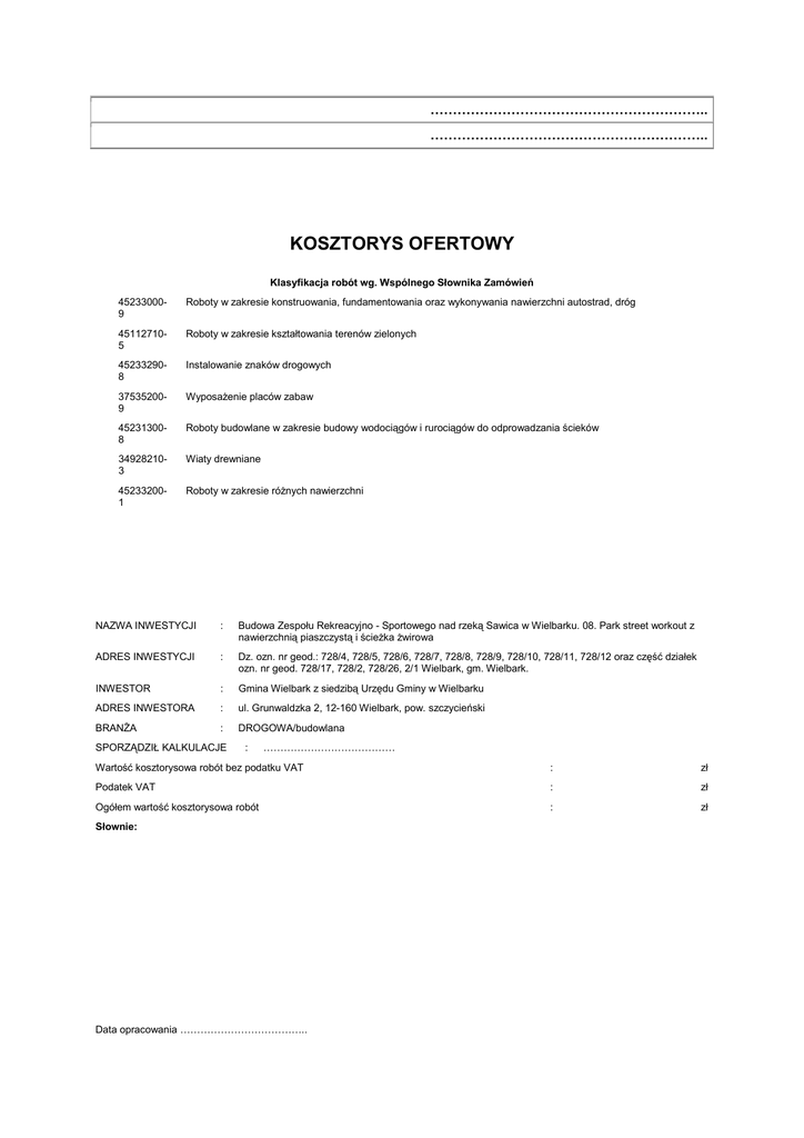…………………………………………………….. …………………………………………………….. KOSZTORYS OFERTOWY Klasyfikacja robót wg. Wspólnego Słownika Zamówień 452330009 Roboty w zakresie konstruowania, fundamentowania oraz wykonywania nawierzchni autostrad, dróg 451127105 Roboty w zakresie kształtowania terenów zielonych 452332908 Instalowanie znaków drogowych 375352009 Wyposażenie placów zabaw 452313008 Roboty budowlane w zakresie budowy wodociągów i rurociągów do odprowadzania ścieków 349282103 Wiaty drewniane 452332001 Roboty w zakresie różnych nawierzchni NAZWA INWESTYCJI : Budowa Zespołu Rekreacyjno - Sportowego nad rzeką Sawica w Wielbarku. 08. Park street workout z nawierzchnią piaszczystą i ścieżka żwirowa ADRES INWESTYCJI : Dz. ozn. nr geod.: 728/4, 728/5, 728/6, 728/7, 728/8, 728/9, 728/10, 728/11, 728/12 oraz część działek ozn. nr geod. 728/17, 728/2, 728/26, 2/1 Wielbark, gm. Wielbark. INWESTOR : Gmina Wielbark z siedzibą Urzędu Gminy w Wielbarku ADRES INWESTORA : ul. Grunwaldzka 2, 12-160 Wielbark, pow. szczycieński BRANŻA : DROGOWA/budowlana SPORZĄDZIŁ KALKULACJE : ………………………………… Wartość kosztorysowa robót bez podatku VAT : zł Podatek VAT : zł Ogółem wartość kosztorysowa robót : zł Słownie: Data opracowania ……………………………….. j)opracowanie kosztorysowe jest integralną częścią opracowania projektowego i tylko wraz z nim stanowi całość, będącą podstawa do wyceny inwestycji przez oferenta 08 zespół rekreacyjno sportowy w wielbarku TABELA WARTOŚCI ELEMENTÓW SCALONYCH Lp. Pozycje kosztorysowe Nazwa Wartość zł 1 2 3 4 1.1 1-2 D.01.00.00. Roboty pomiarowe 1.2 3-4 D.01.00.00. Odhumusowanie 1.3 5-8 D.05.00.00. Ścieżki piesze o nawierzchni żwirowej 1.4 9-9 D.07.00.00. Zestaw do street workout - projektowane urządzenia 1.5 10 - 10 D.07.00.00. Tablice informacyjne 1.6 11 - 12 D.08.00.00. Elelementy jezdni 1.7 13 - 16 D.11.00.00. Nawierzchnia piaszczysta do realizacji: w parku Street Workout 1 1 - 16 08. Park street workout z nawierzchnią piaszczystą i ścieżka żwirowa RAZEM netto VAT Razem brutto Ogółem wartość kosztorysowa robót W tym: Wartość kosztorysowa robót bez podatku VAT Podatek VAT Słownie: Kosztorys Lp. Nr spec.techn. Podstawa wyceny Opis Jedn. miary Ilość Cena zł Wartość zł (6 x 7) 1 2 3 4 5 6 7 8 Budowa Zespołu Rekreacyjno - Sportowego nad rzeką Sawica w Wielbarku. 08. Park street workout z nawierzchnią piaszczystą i ścieżka żwirowa 1 1.1 1 D.01.01.01. d.1.1 08. Park street workout z nawierzchnią piaszczystą i ścieżka żwirowa D.01.00.00. Roboty pomiarowe KNNR 1 0112-02 2 GG.00.12.01 KNNR 1 d.1.1 0112-02 Roboty pomiarowe przy powierzchniowych robotach ziemnych - nawierzchnie placów postojowych m2 162.80 Geodezyjna inwentaryzacja powykonawcza m2 162.80 Razem dział D.01.00.00. Roboty pomiarowe 1.2 D.01.00.00. Odhumusowanie 3 D.01.02.02. d.1.2 KNNR 1 0113-01 Usunięcie warstwy ziemi urodzajnej (humusu) o grubości do 15 cm za pomocą spycharek m2 162.80 4 D.01.02.02. d.1.2 KNNR 1 0206-04 Roboty ziemne wykonywane koparkami podsiębiernymi o poj.łyżki 0.60 m3 w gr.kat. I-III w ziemi uprzednio zmag.w hałdach z transp.urobku na odl. 1 km sam.samowyład. Humus do wbudowania na miejscu m3 24.42 Razem dział D.01.00.00. Odhumusowanie 1.3 D.05.00.00. Ścieżki piesze o nawierzchni żwirowej 5 D.04.01.01. d.1.3 KNNR 6 0103-01 Profilowanie i zagęszczanie podłoża wykonywane ręcznie w gruncie kat. II-IV pod warstwy konstrukcyjne nawierzchni - podłoże: grunt rodzimy, po lokalnym zdjęciu warstwy humusu. m2 29.80 6 D.04.02.01. d.1.3 KNNR 6 0104-01 Warstwy odsączające zagęszczane mechanicznie o gr.10 cm - piasek m2 29.80 7 D.02.03.01c d.1.3 KNR AT-04 0101-01 Warstwa wzmacniająca grunt pod warstwy technologiczne - geowłóknina (uwzględnić dodatek na zakłady technologiczne) m2 29.80 8 D.05.01.03. d.1.3 KNNR 6 0202-01 Nawierzchnie żwirowe - warstwa żwiru o gr. 20 cm frakcji 0-20 mm z kruszywa rozściełanego ręcznie m2 29.80 Razem dział D.05.00.00. Ścieżki piesze o nawierzchni żwirowej 1.4 9 D.07.06.02. d.1.4 D.07.00.00. Zestaw do street workout - projektowane urządzenia KNR 2-21 0607-02 kalk. własna Zestaw do street workout szt 1.00 szt 1.00 m3 1.85 Razem dział D.07.00.00. Zestaw do street workout - projektowane urządzenia 1.5 10 D.07.06.02. d.1.5 D.07.00.00. Tablice informacyjne KNR 2-21 0607-02 kalk. własna Tablica informacyjna (firma "COMES") - 1 szt., Razem dział D.07.00.00. Tablice informacyjne 1.6 11 D.08.03.01. d.1.6 D.08.00.00. Elelementy jezdni KNR 2-31 0402-04 Ława pod obrzeża, betonowa z oporem - beton C12/15. 12 D.08.03.01. d.1.6 KNNR 6 0404-05 Obrzeże betonowe 8x30 cm na ławie betonowej z m oporem. 84.20 Razem dział D.08.00.00. Elelementy jezdni 1.7 D.11.00.00. Nawierzchnia piaszczysta do realizacji: w parku Street Workout 13 D.04.01.01. d.1.7 KNNR 6 0103-01 Profilowanie i zagęszczanie podłoża wykonywane ręcznie w gruncie kat. II-IV pod warstwy konstrukcyjne nawierzchni - podłoże: grunt rodzimy, po lokalnym zdjęciu warstwy humusu. m2 133.00 14 D.04.02.01. d.1.7 KNNR 6 0104-01 Warstwy odsączające zagęszczane mechanicznie o gr.10 cm - piasek m2 133.00 15 D.02.03.01c d.1.7 KNR AT-04 0101-01 Warstwa wzmacniająca grunt pod warstwy technologiczne - geowłóknina (uwzględnić dodatek na zakłady technologiczne) m2 133.00 16 D.11.01.01. d.1.7 KNNR 6 0105-02 Warstwa piasku przesiewanego drobnoziarnistego frakcji 0-2mm o gr. 30 cm m2 133.00 Razem dział D.11.00.00. Nawierzchnia piaszczysta do realizacji: w parku Street Workout Razem dział 08. Park street workout z nawierzchnią piaszczystą i ścieżka żwirowa Wartość kosztorysowa robót bez podatku VAT Podatek VAT Ogółem wartość kosztorysowa robót Słownie: