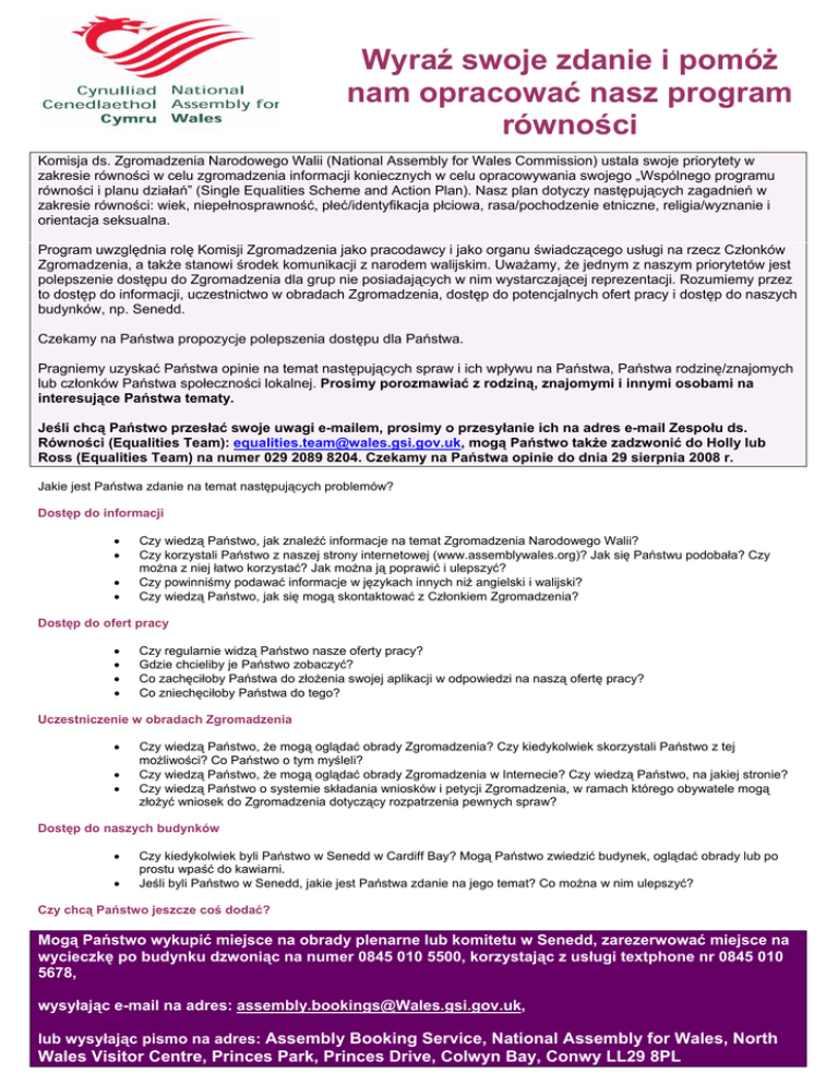 Wyraź swoje zdanie i pomóż nam opracować nasz program równości Komisja ds. Zgromadzenia Narodowego Walii (National Assembly for Wales Commission) ustala swoje priorytety w zakresie równości w celu zgromadzenia informacji koniecznych w celu opracowywania swojego „Wspólnego programu równości i planu działań” (Single Equalities Scheme and Action Plan). Nasz plan dotyczy następujących zagadnień w zakresie równości: wiek, niepełnosprawność, płeć/identyfikacja płciowa, rasa/pochodzenie etniczne, religia/wyznanie i orientacja seksualna. Program uwzględnia rolę Komisji Zgromadzenia jako pracodawcy i jako organu świadczącego usługi na rzecz Członków Zgromadzenia, a także stanowi środek komunikacji z narodem walijskim. Uważamy, że jednym z naszym priorytetów jest polepszenie dostępu do Zgromadzenia dla grup nie posiadających w nim wystarczającej reprezentacji. Rozumiemy przez to dostęp do informacji, uczestnictwo w obradach Zgromadzenia, dostęp do potencjalnych ofert pracy i dostęp do naszych budynków, np. Senedd. Czekamy na Państwa propozycje polepszenia dostępu dla Państwa. Pragniemy uzyskać Państwa opinie na temat następujących spraw i ich wpływu na Państwa, Państwa rodzinę/znajomych lub członków Państwa społeczności lokalnej. Prosimy porozmawiać z rodziną, znajomymi i innymi osobami na interesujące Państwa tematy. Jeśli chcą Państwo przesłać swoje uwagi e-mailem, prosimy o przesyłanie ich na adres e-mail Zespołu ds. Równości (Equalities Team): [email protected], mogą Państwo także zadzwonić do Holly lub Ross (Equalities Team) na numer 029 2089 8204. Czekamy na Państwa opinie do dnia 29 sierpnia 2008 r. Jakie jest Państwa zdanie na temat następujących problemów? Dostęp do informacji • • • • Czy wiedzą Państwo, jak znaleźć informacje na temat Zgromadzenia Narodowego Walii? Czy korzystali Państwo z naszej strony internetowej (www.assemblywales.org)? Jak się Państwu podobała? Czy można z niej łatwo korzystać? Jak można ją poprawić i ulepszyć? Czy powinniśmy podawać informacje w językach innych niż angielski i walijski? Czy wiedzą Państwo, jak się mogą skontaktować z Członkiem Zgromadzenia? Dostęp do ofert pracy • • • • Czy regularnie widzą Państwo nasze oferty pracy? Gdzie chcieliby je Państwo zobaczyć? Co zachęciłoby Państwa do złożenia swojej aplikacji w odpowiedzi na naszą ofertę pracy? Co zniechęciłoby Państwa do tego? Uczestniczenie w obradach Zgromadzenia • • • Czy wiedzą Państwo, że mogą oglądać obrady Zgromadzenia? Czy kiedykolwiek skorzystali Państwo z tej możliwości? Co Państwo o tym myśleli? Czy wiedzą Państwo, że mogą oglądać obrady Zgromadzenia w Internecie? Czy wiedzą Państwo, na jakiej stronie? Czy wiedzą Państwo o systemie składania wniosków i petycji Zgromadzenia, w ramach którego obywatele mogą złożyć wniosek do Zgromadzenia dotyczący rozpatrzenia pewnych spraw? Dostęp do naszych budynków • • Czy kiedykolwiek byli Państwo w Senedd w Cardiff Bay? Mogą Państwo zwiedzić budynek, oglądać obrady lub po prostu wpaść do kawiarni. Jeśli byli Państwo w Senedd, jakie jest Państwa zdanie na jego temat? Co można w nim ulepszyć? Czy chcą Państwo jeszcze coś dodać? Mogą Państwo wykupić miejsce na obrady plenarne lub komitetu w Senedd, zarezerwować miejsce na wycieczkę po budynku dzwoniąc na numer 0845 010 5500, korzystając z usługi textphone nr 0845 010 5678, wysyłając e-mail na adres: [email protected], lub wysyłając pismo na adres: Assembly Booking Service, National Assembly for Wales, North Wales Visitor Centre, Princes Park, Princes Drive, Colwyn Bay, Conwy LL29 8PL