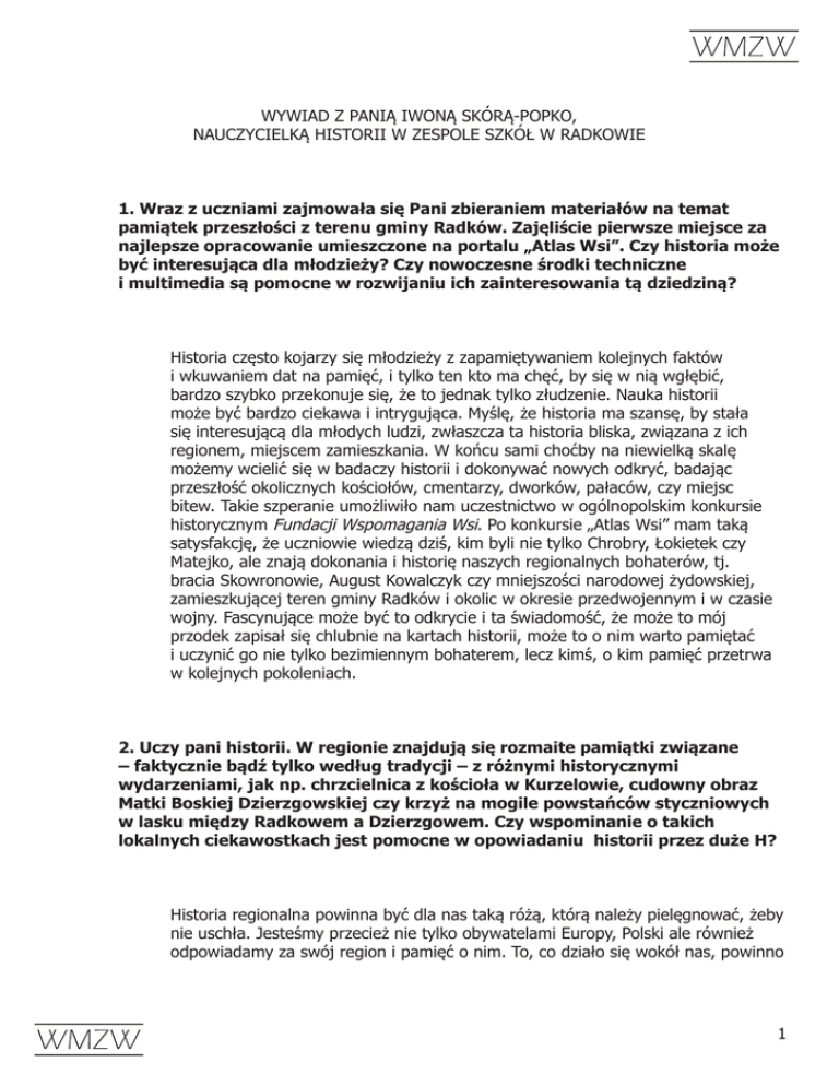 WYWIAD Z PANIĄ IWONĄ SKÓRĄ-POPKO, NAUCZYCIELKĄ HISTORII W ZESPOLE SZKÓŁ W RADKOWIE 1. Wraz z uczniami zajmowała się Pani zbieraniem materiałów na temat pamiątek przeszłości z terenu gminy Radków. Zajęliście pierwsze miejsce za najlepsze opracowanie umieszczone na portalu „Atlas Wsi”. Czy historia może być interesująca dla młodzieży? Czy nowoczesne środki techniczne i multimedia są pomocne w rozwijaniu ich zainteresowania tą dziedziną? Historia często kojarzy się młodzieży z zapamiętywaniem kolejnych faktów i wkuwaniem dat na pamięć, i tylko ten kto ma chęć, by się w nią wgłębić, bardzo szybko przekonuje się, że to jednak tylko złudzenie. Nauka historii może być bardzo ciekawa i intrygująca. Myślę, że historia ma szansę, by stała się interesującą dla młodych ludzi, zwłaszcza ta historia bliska, związana z ich regionem, miejscem zamieszkania. W końcu sami choćby na niewielką skalę możemy wcielić się w badaczy historii i dokonywać nowych odkryć, badając przeszłość okolicznych kościołów, cmentarzy, dworków, pałaców, czy miejsc bitew. Takie szperanie umożliwiło nam uczestnictwo w ogólnopolskim konkursie historycznym Fundacji Wspomagania Wsi. Po konkursie „Atlas Wsi” mam taką satysfakcję, że uczniowie wiedzą dziś, kim byli nie tylko Chrobry, Łokietek czy Matejko, ale znają dokonania i historię naszych regionalnych bohaterów, tj. bracia Skowronowie, August Kowalczyk czy mniejszości narodowej żydowskiej, zamieszkującej teren gminy Radków i okolic w okresie przedwojennym i w czasie wojny. Fascynujące może być to odkrycie i ta świadomość, że może to mój przodek zapisał się chlubnie na kartach historii, może to o nim warto pamiętać i uczynić go nie tylko bezimiennym bohaterem, lecz kimś, o kim pamięć przetrwa w kolejnych pokoleniach. 2. Uczy pani historii. W regionie znajdują się rozmaite pamiątki związane – faktycznie bądź tylko według tradycji – z różnymi historycznymi wydarzeniami, jak np. chrzcielnica z kościoła w Kurzelowie, cudowny obraz Matki Boskiej Dzierzgowskiej czy krzyż na mogile powstańców styczniowych w lasku między Radkowem a Dzierzgowem. Czy wspominanie o takich lokalnych ciekawostkach jest pomocne w opowiadaniu historii przez duże H? Historia regionalna powinna być dla nas taką różą, którą należy pielęgnować, żeby nie uschła. Jesteśmy przecież nie tylko obywatelami Europy, Polski ale również odpowiadamy za swój region i pamięć o nim. To, co działo się wokół nas, powinno 1 być nam najbardziej bliskie i drogie. Tej historii można prawdziwie dotknąć, spróbować się z nią zmierzyć, poczuć, że to co my dziś odkrywamy stanie się czymś zupełnie nowym i zaskakującym dla wielu ludzi, a znane gazety jeszcze o tym nie napisały, że to my jesteśmy pierwsi w jej okrywaniu. Ta ziemia nas wykarmiła, wychowała i ta ziemia potrzebuje by zachować i pielęgnować pamięć o niej na długie lata. Tak długo, jak my będziemy pamiętać o przeszłości, tak długo będzie ona żyła w nas, a dzięki nam dostanie się też w szersze środowiska, usłyszą niej inni. Mówi się, że tak długo żyje człowiek, jak długo żyje o nim pamięć. Poza tym, inicjatywa odkrywania nowych faktów i utrwalania ich w pamięci jest przykładem łączenia pokoleń. Starsi ludzie chętnie opowiadają o przeszłości, młodzi z wdzięcznością słuchają i spisują te fakty. W sytuacji, gdy w szkole omawiany jest temat, którego choćby niewielka część działa się na terenie „małej ojczyzny”, uczniowie chętniej słuchają, a później także pamiętają dane wydarzenia. Przykładem takiego dla naszego regionu jest niewątpliwie powstanie styczniowe. 3. Gdyby pani uczniowie mieli możliwość przeprowadzenia wywiadu z jakąś postacią historyczną związaną z regionem, kogo by im pani poleciła? Jest wiele interesujących postaci, które wywodzą się z naszego regionu. Mnie szczególnie bliska jest historia II wojny światowej, oraz może mało lubiane dla większości dzieje PRL-u. To trudny czas walki o wolność, polegającej nie tylko na prowadzeniu wojny, ale też wytrwaniu w wobec braku suwerenności państwakiedy na każdym kroku walczono o wolność człowieka i prawo do normalnego życia, obronę wartości religijnych i walki o prawdę historyczną. Człowiekiem który wycierpiał wiele w czasie wojny był więzień obozu Gross-Rosen – Teofil Kowalczyk. Był to człowiek, który zginał bardzo młodo, miał przed sobą całe życie, trudny czas wojny nie dał mu szansy by mógł w tym życiu jeszcze więcej zdziałać. Mnie szczególnie bliski jest jeszcze proboszcz Dzierzgowa – ksiądz Tadeusz Grabek. Ludzie pamiętają go jako szczególnie oddanego parafii i pracowitego człowieka, dla którego zawsze najważniejsze były trzy wartości: Bóg, Honor i Ojczyzna. Szczególnie podziwiam jego pasję, jaką stało się spisywanie wydarzeń z dziejów parafii w Dzierzgowie. To taki mój wzór i wraz z młodzież staram się iść jego ścieżkami. 4. Ostatnio bardzo popularne stają się wirtualne muzea, prowadzi się również zakrojone na szeroką skalę akcje digitalizacji różnych obiektów. Jak możliwość takiego wirtualnego zwiedzania można wykorzystać w szkole? 2 Nowoczesne środki multimedialne są zachętą do podejmowana podobnych wyzwań, jak inicjatywa „Atlasu Wsi”. W dzisiejszych czasach, młodzież doskonale potrafi łączyć „stare” z „nowym”, czyli historię z nowoczesnymi technikami multimedialnymi. Ta umiejętność doskonale sprawdza się przy tworzeniu stron internetowych, czy prezentacji multimedialnych, w których w ciekawy, przyciągający oko widza sposób utrwala się minione czasy. Wykonując takie „cudeńka” młodzież udowadnia swoją wartość i przydatność, rozwija i doskonali swoje umiejętności. Ludzie młodzi chętniej dziś wykonają prezentację multimedialną